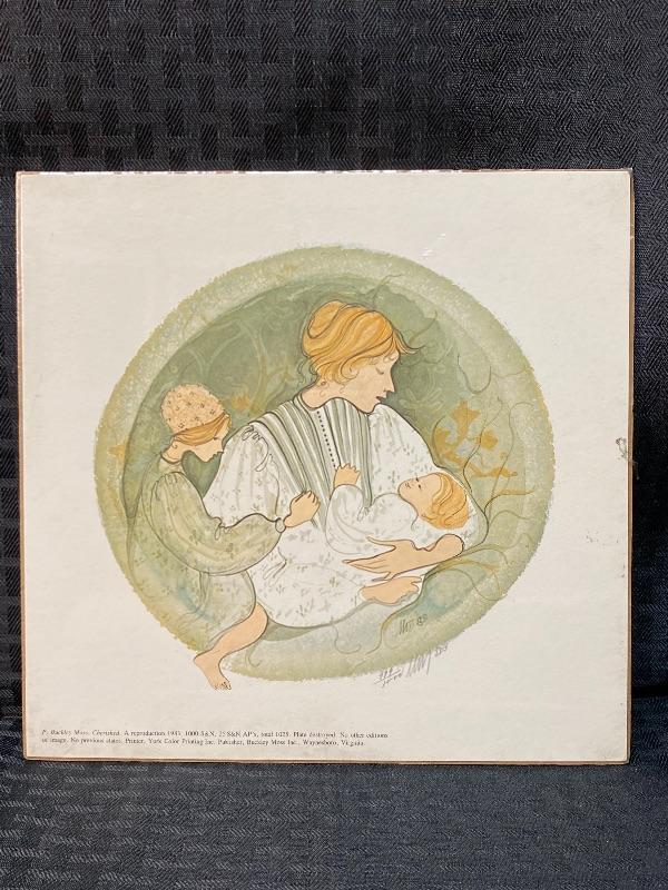 P Buckley Moss "Cherished" 1983 reproduction print. Unframed, about 9" sq. Signed & numbered. In plastic, on cardboard.