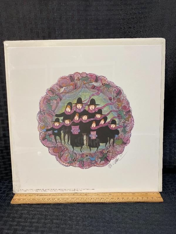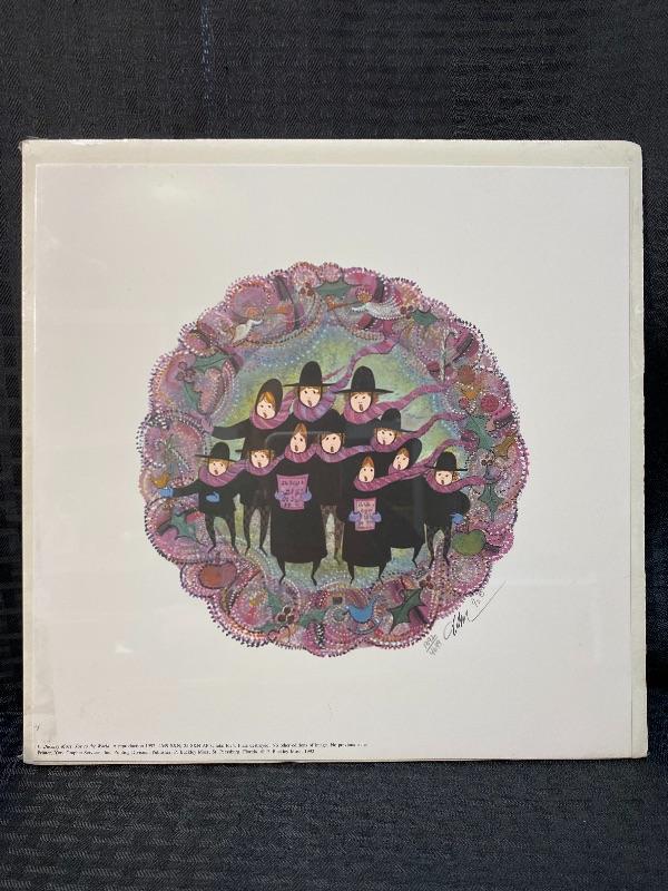 P Buckley Moss "Joy to the World" 1992 reproduction print. Unframed, about 12" square. Signed and numbered. In plastic, on cardboard.