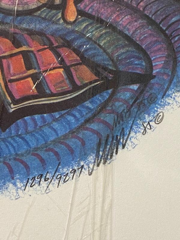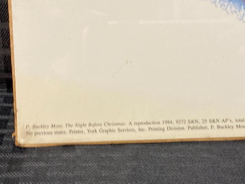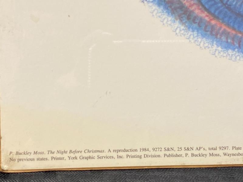 P Buckley Moss "The Night Before Christmas" 1984 reproduction print. Unframed, about 12" square. Signed and numbered. Previous owner covered with plastic wrap and taped this to cardboard. There is discoloration on upper left edge, not a shadow.