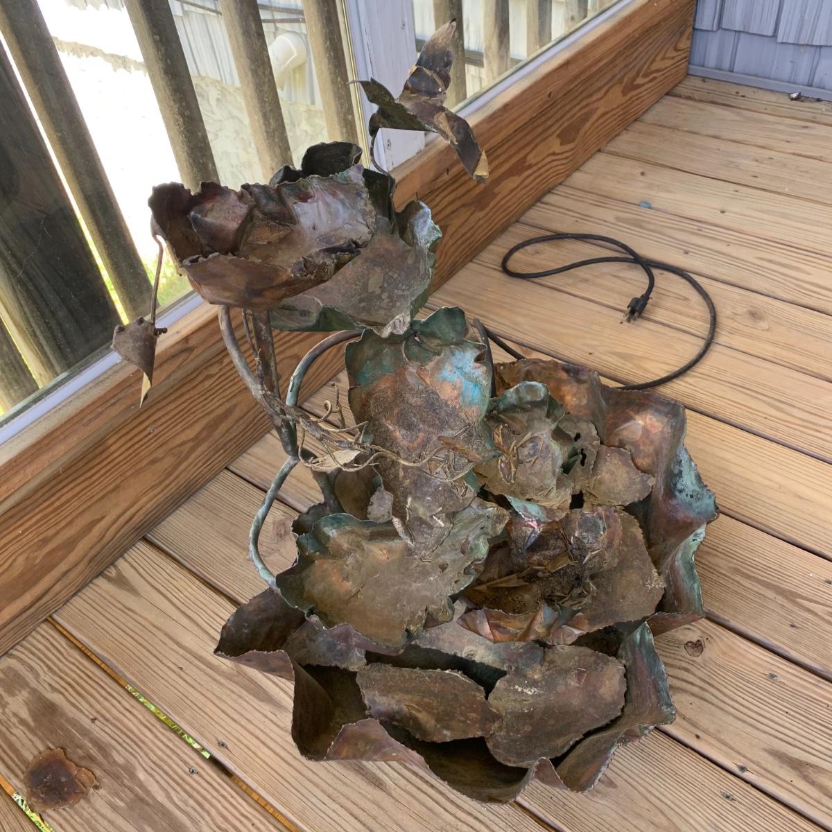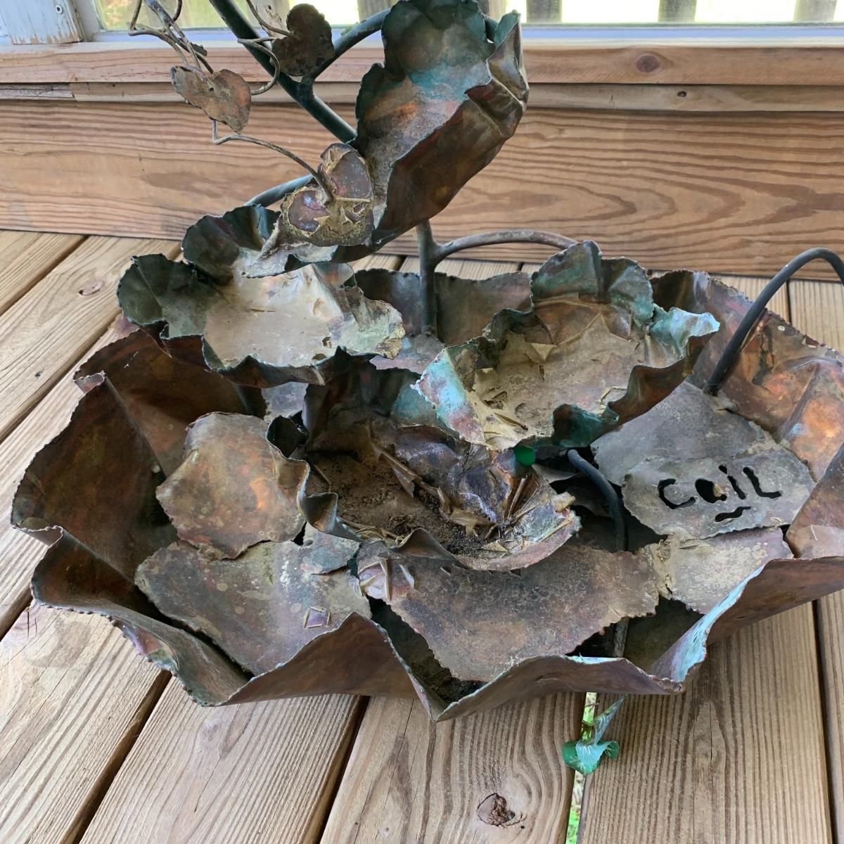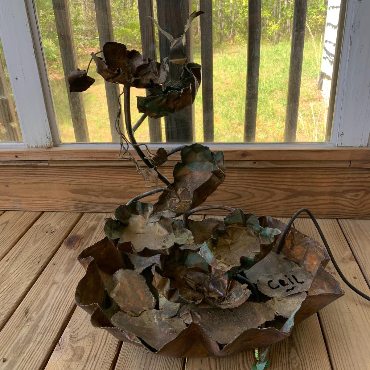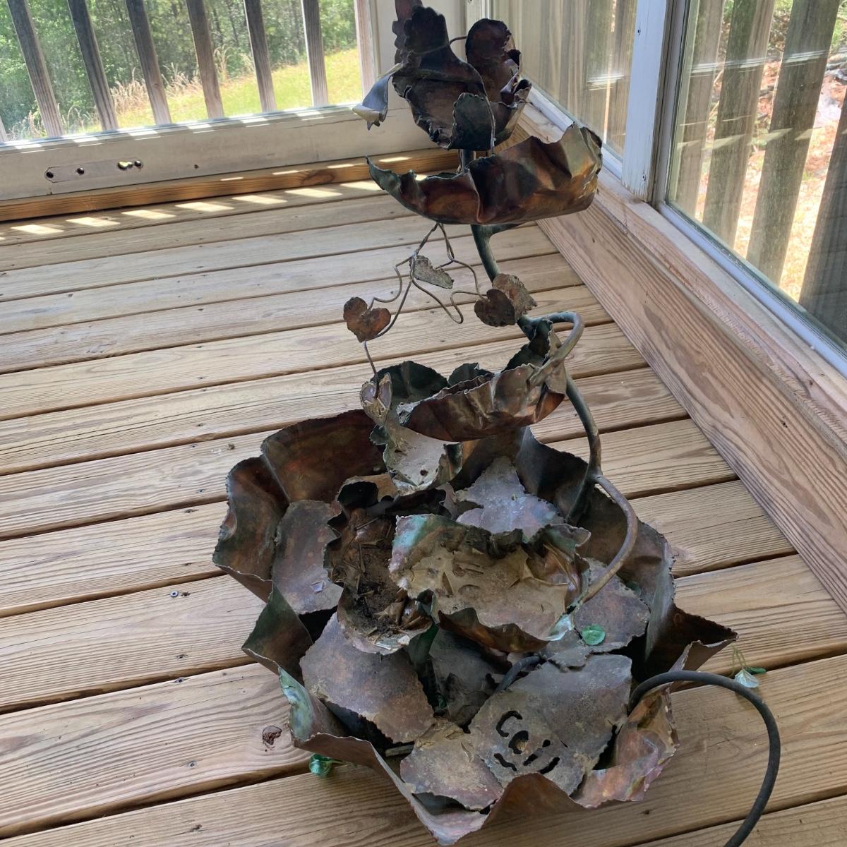 This lot includes one artist designed delicate fountain. The fountain appears to be made of a thin metal material. It has what appears to be an artist signature of “Ceil”. The fountain is rusted and slightly dirty as it has been outdoors. The fountain makes a noise when plugged in but we cannot confirm whether it functions. It measures about 23in x 17in x 26in. Shipping available.