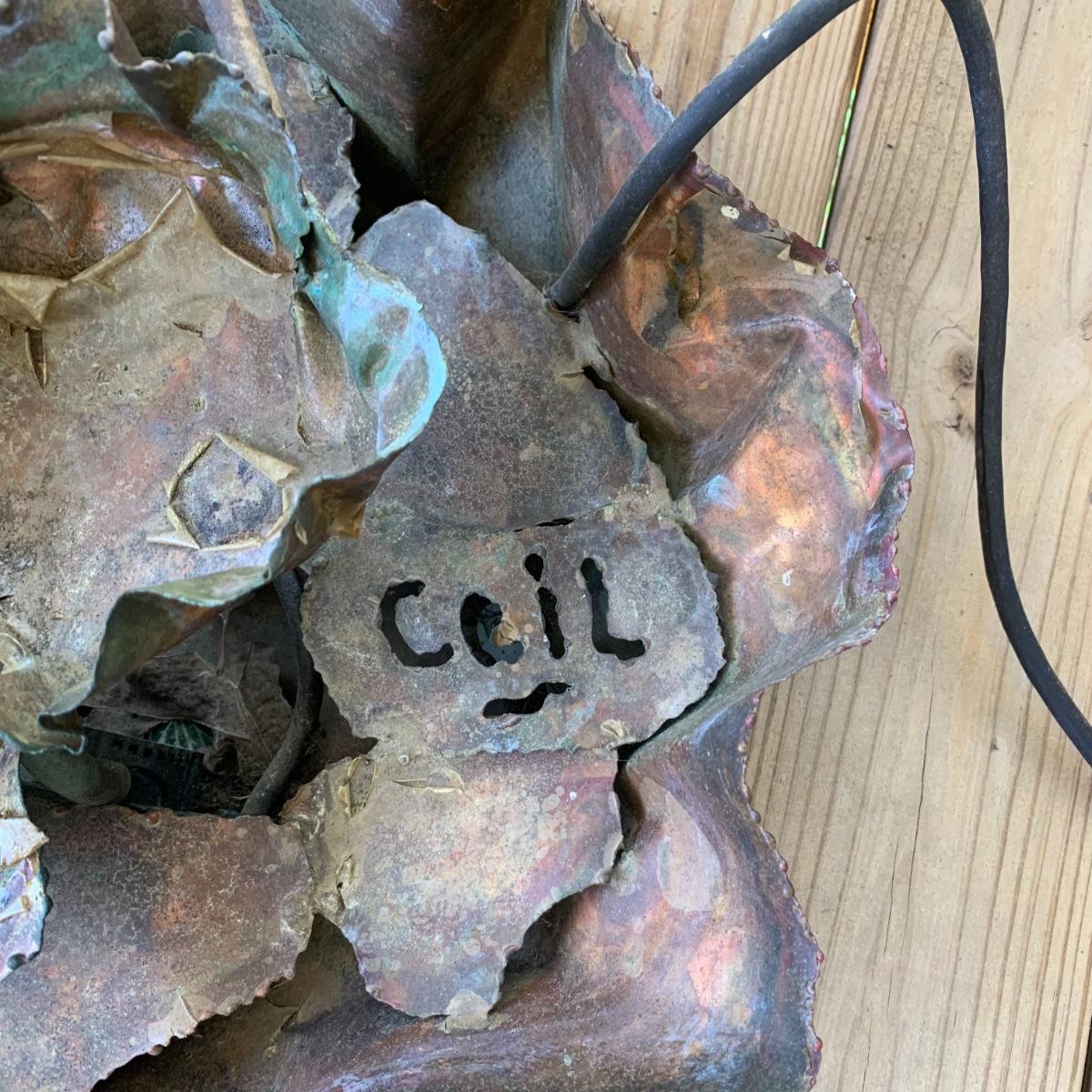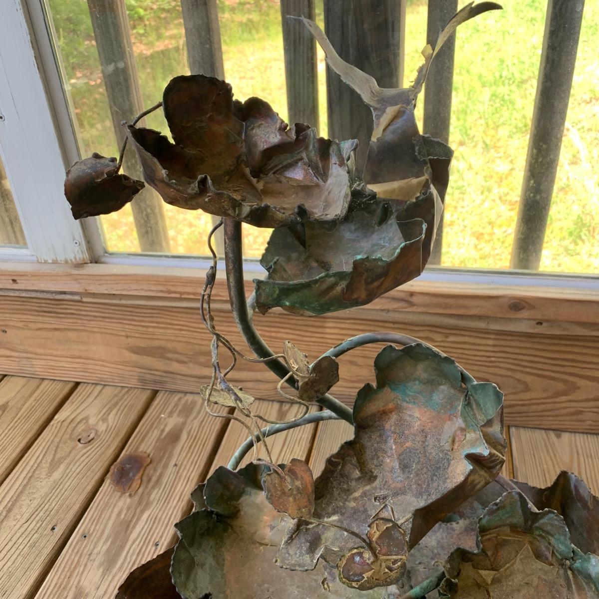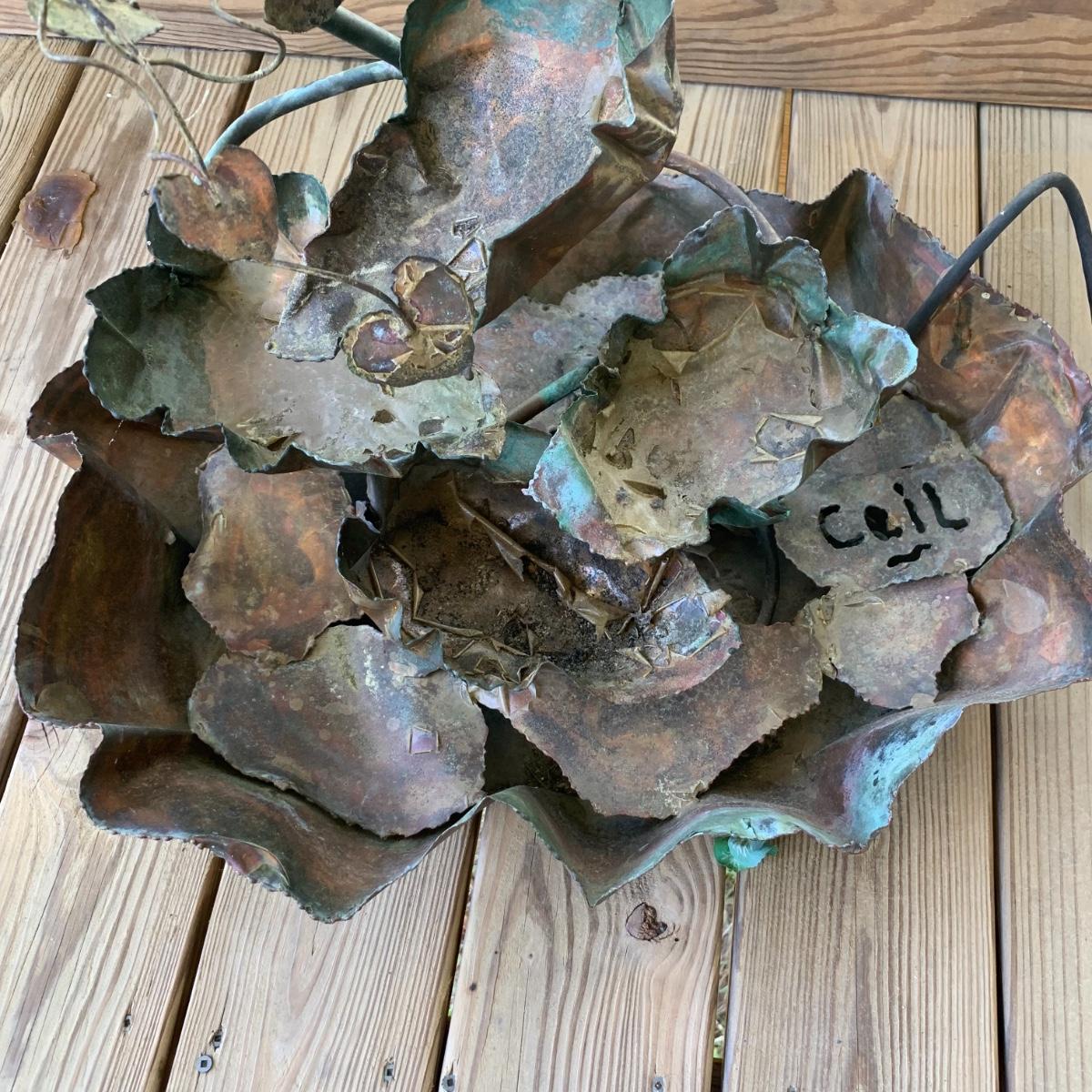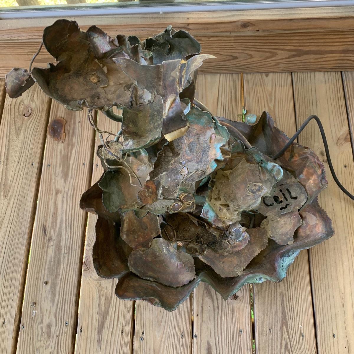 This lot includes one artist designed delicate fountain. The fountain appears to be made of a thin metal material. It has what appears to be an artist signature of “Ceil”. The fountain is rusted and slightly dirty as it has been outdoors. The fountain makes a noise when plugged in but we cannot confirm whether it functions. It measures about 23in x 17in x 26in. Shipping available.