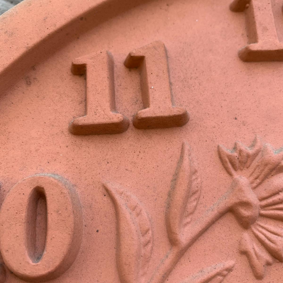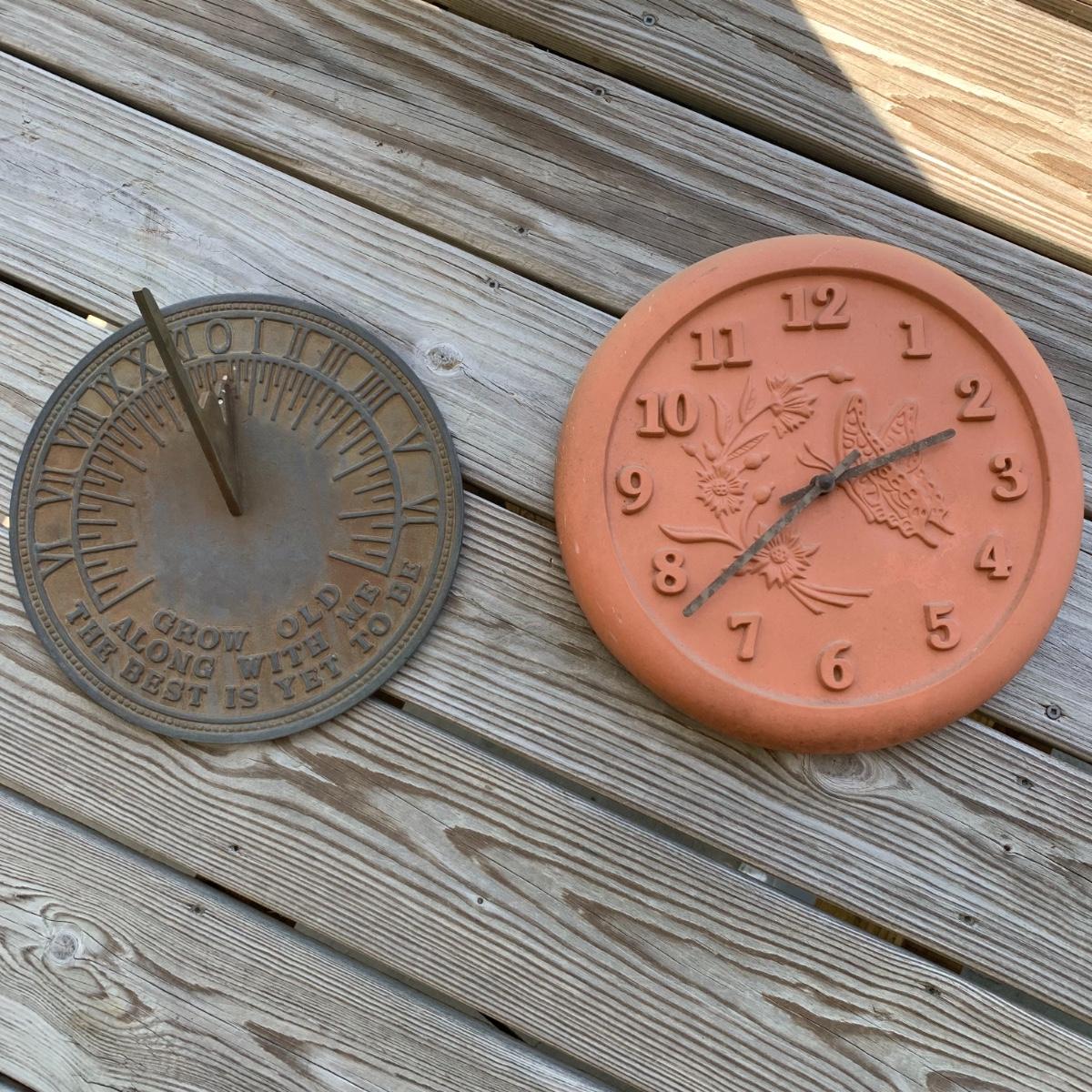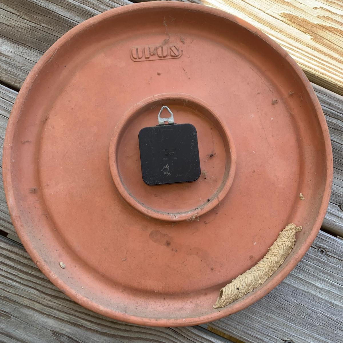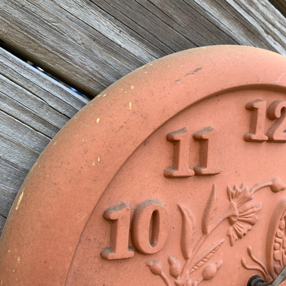 This lot includes one metal sun dial, one Opus brand terracotta clock, and one Opus brand terracotta thermometer. The ceramic clock needs batteries. The metal sun dial has the inscription “ROC” on the back. The sun dial measures about 11in in diameter and the ceramic clock measures 12.5in. Shipping available.