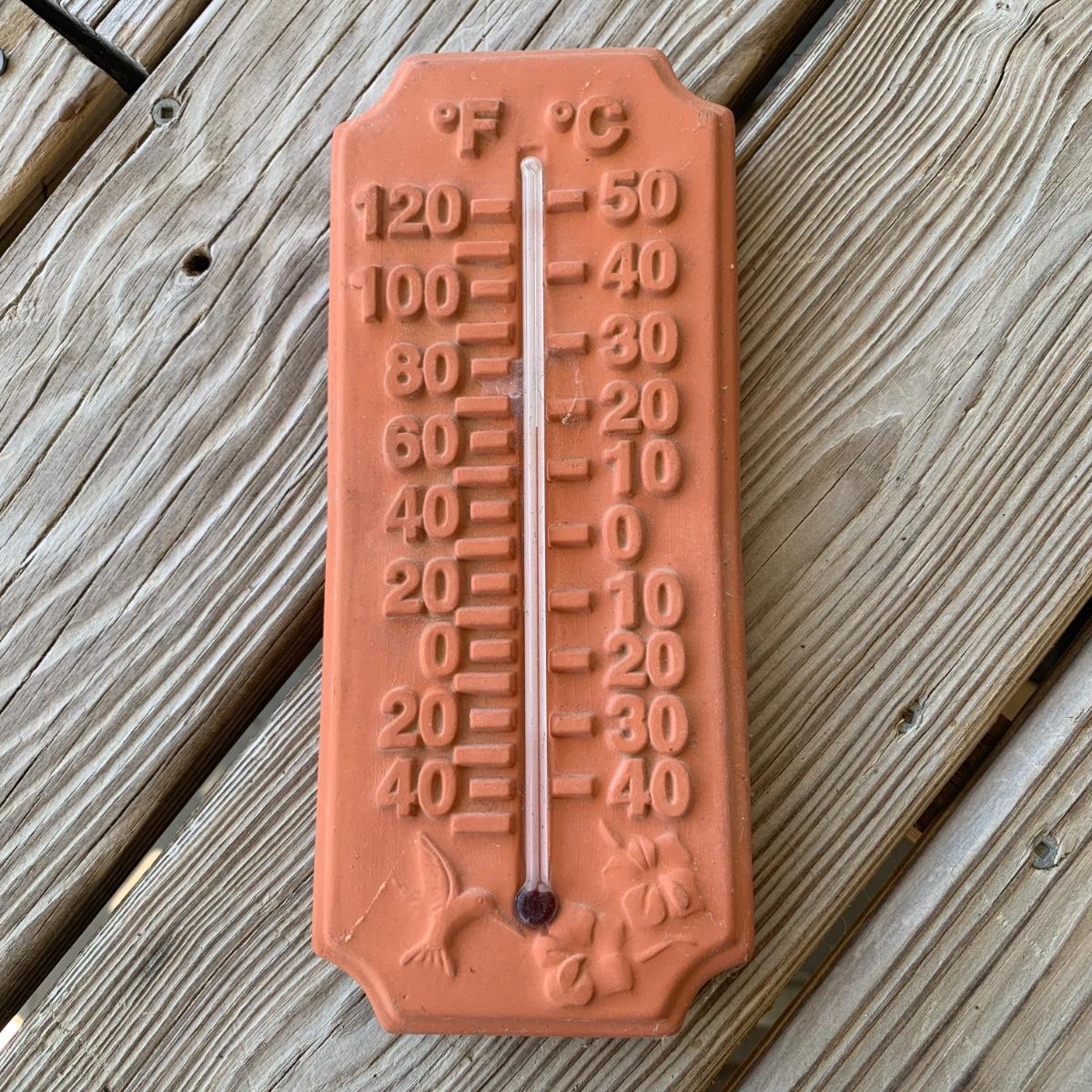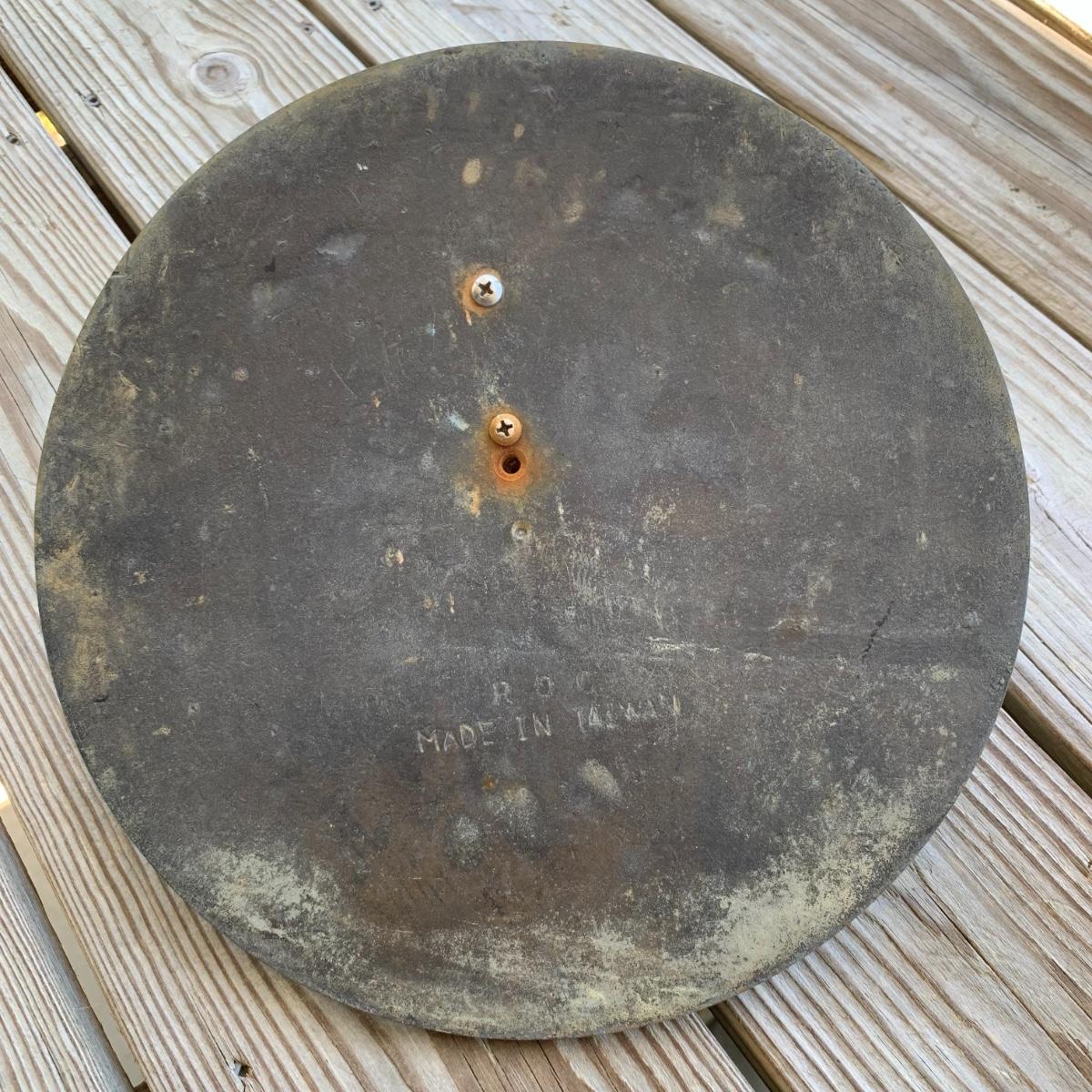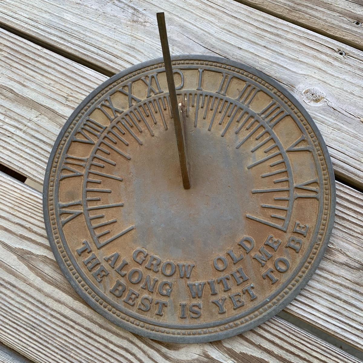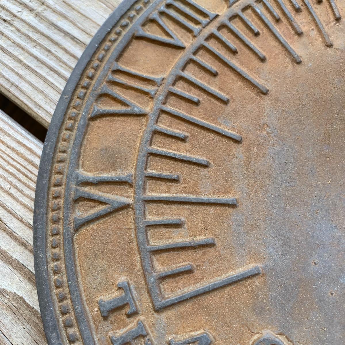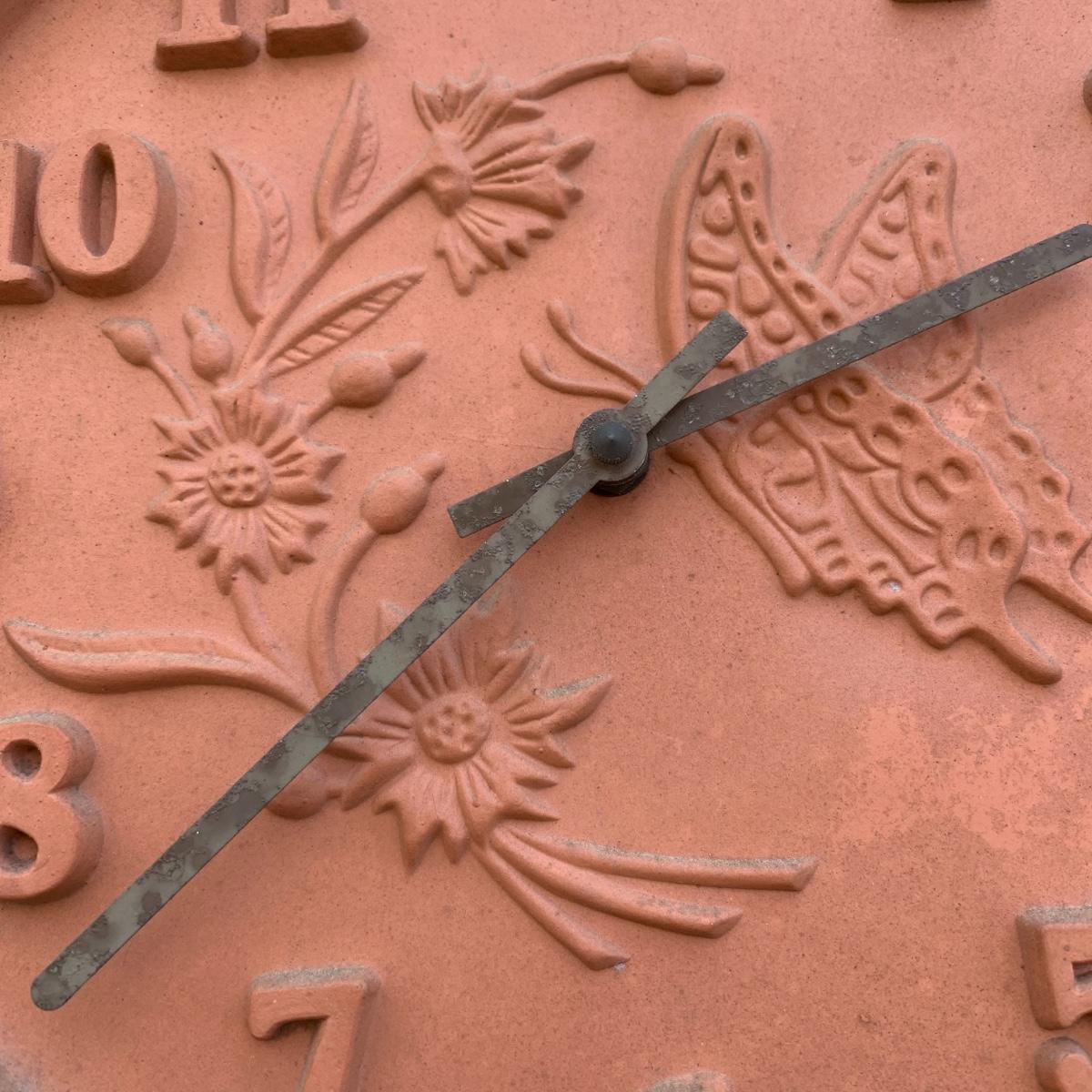 This lot includes one metal sun dial, one Opus brand terracotta clock, and one Opus brand terracotta thermometer. The ceramic clock needs batteries. The metal sun dial has the inscription “ROC” on the back. The sun dial measures about 11in in diameter and the ceramic clock measures 12.5in. Shipping available.