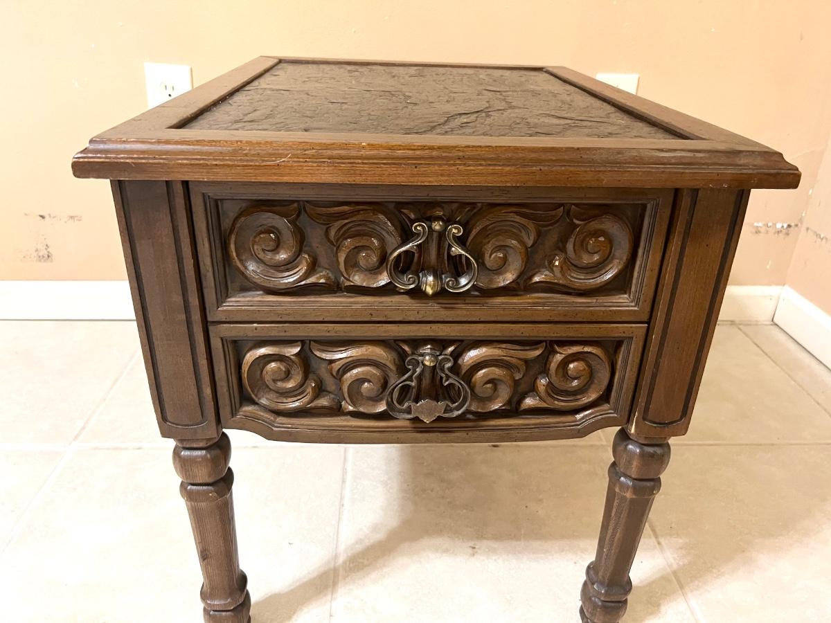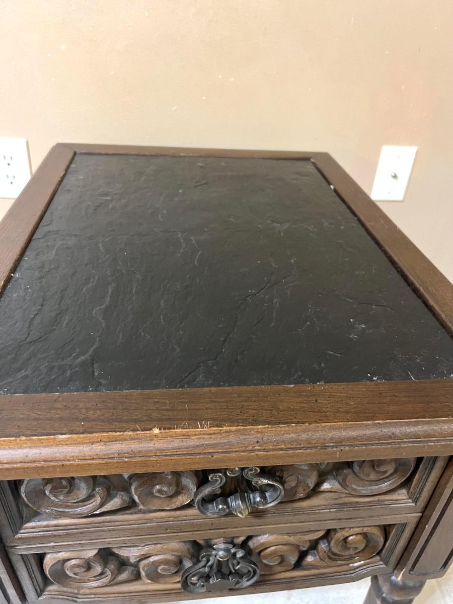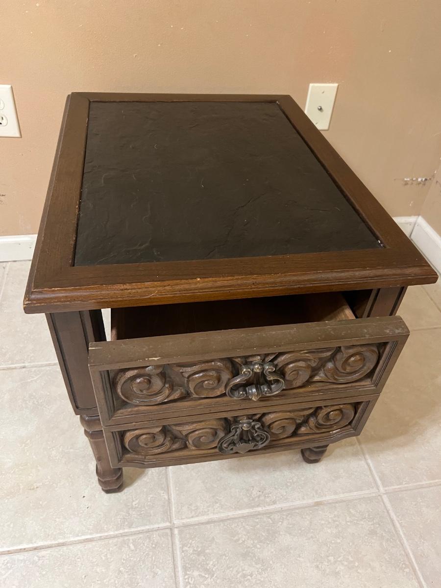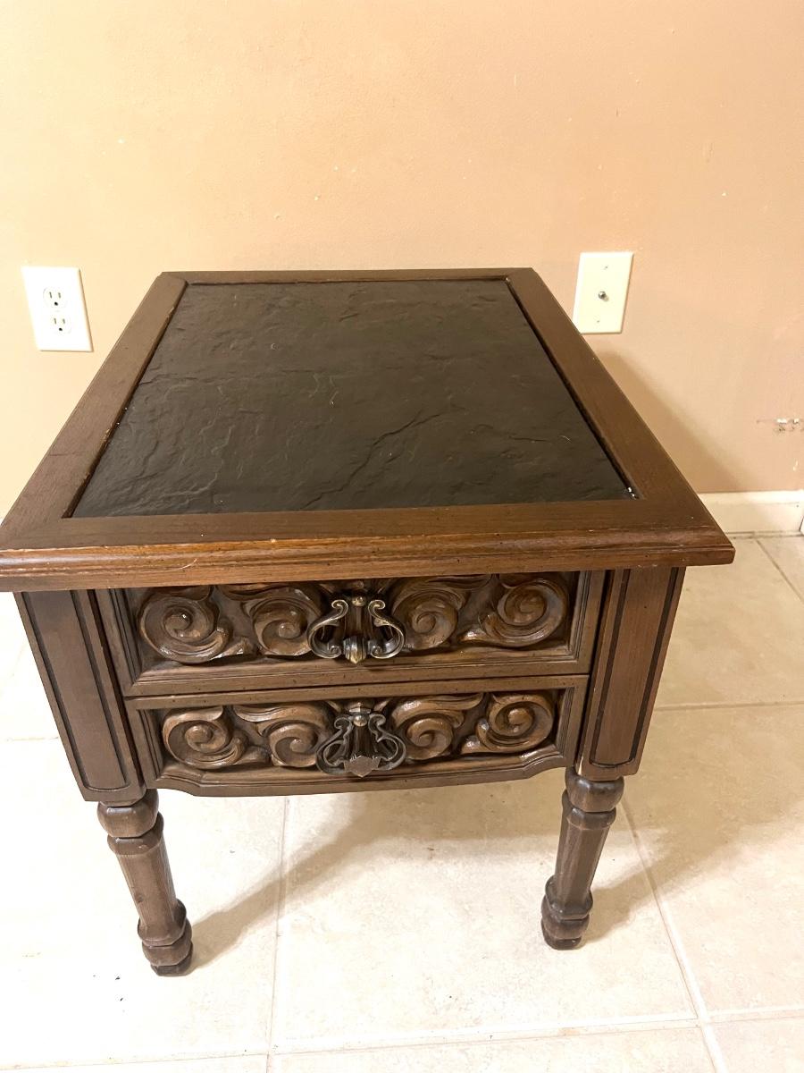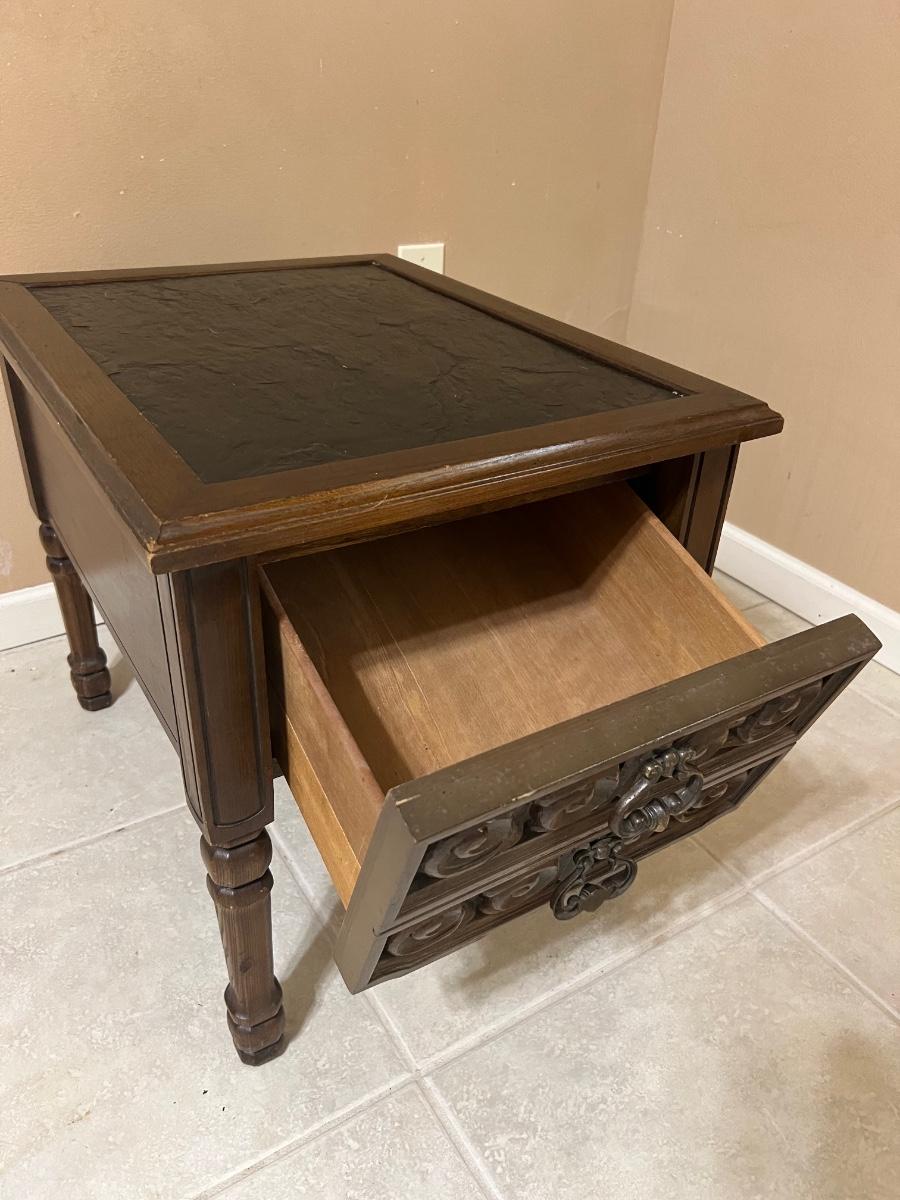 Wooden side table with black slate top table. Measures 21 1/2 inches tall, 20 inches wide and 26 inches deep. Drawer does droop when opened up, see picture.