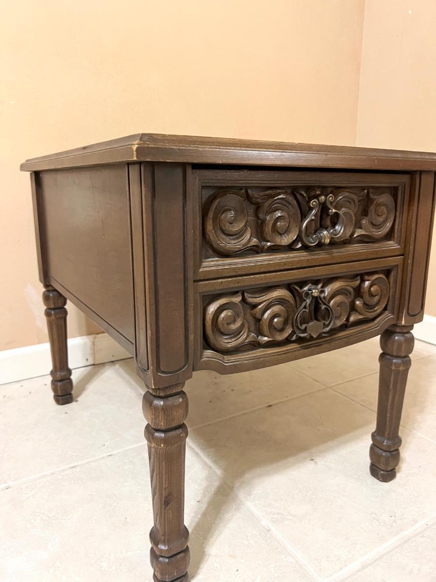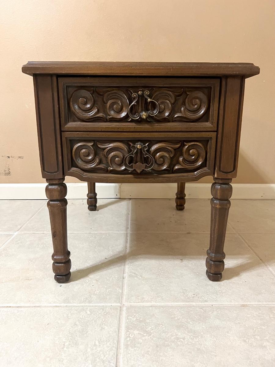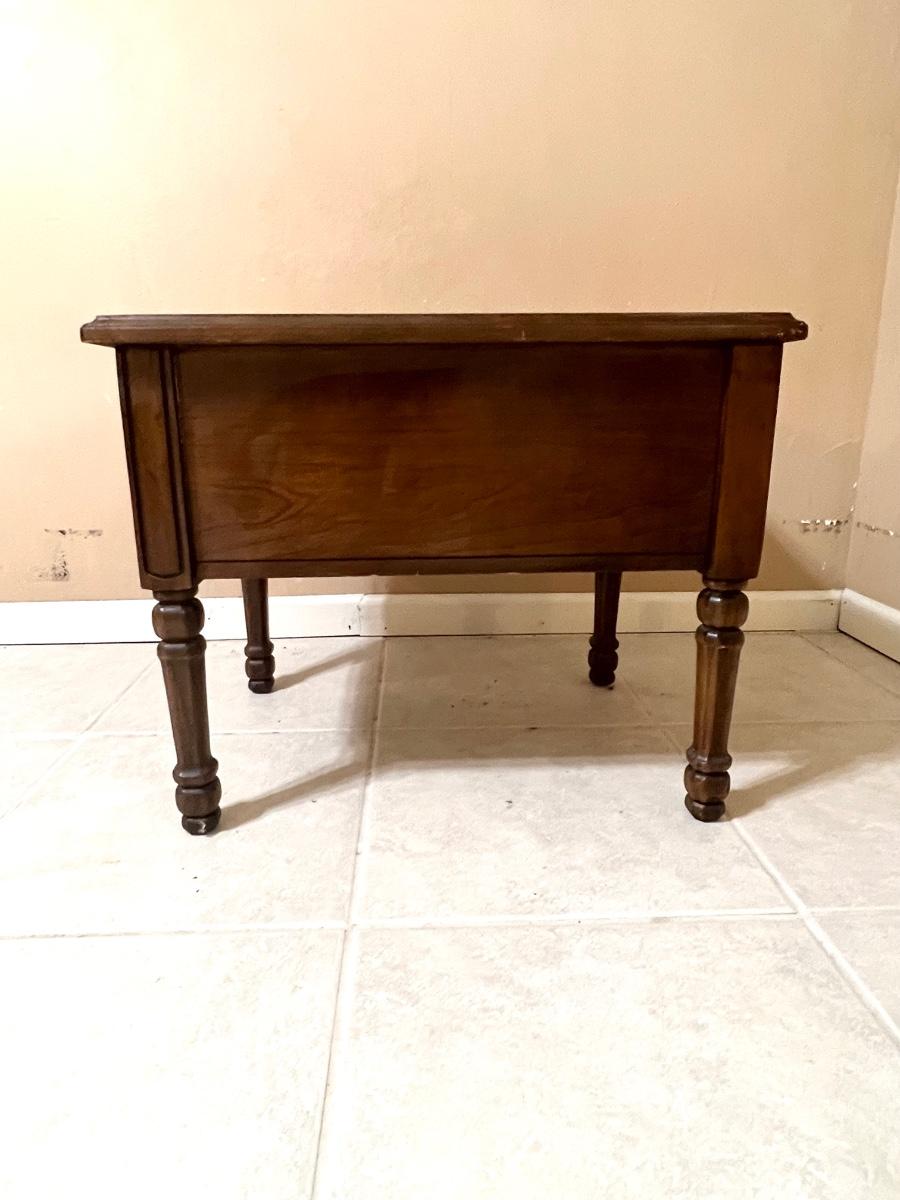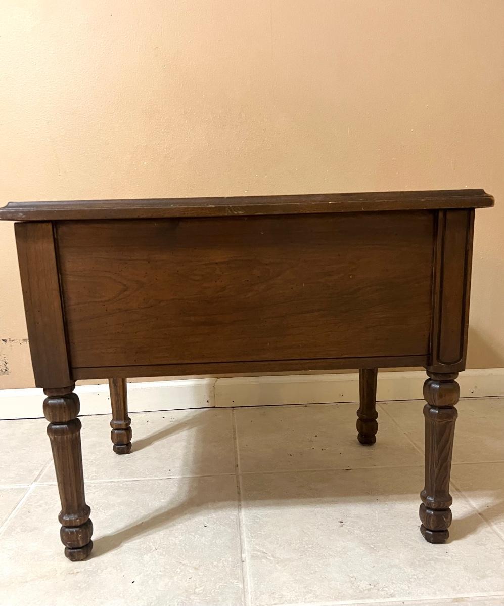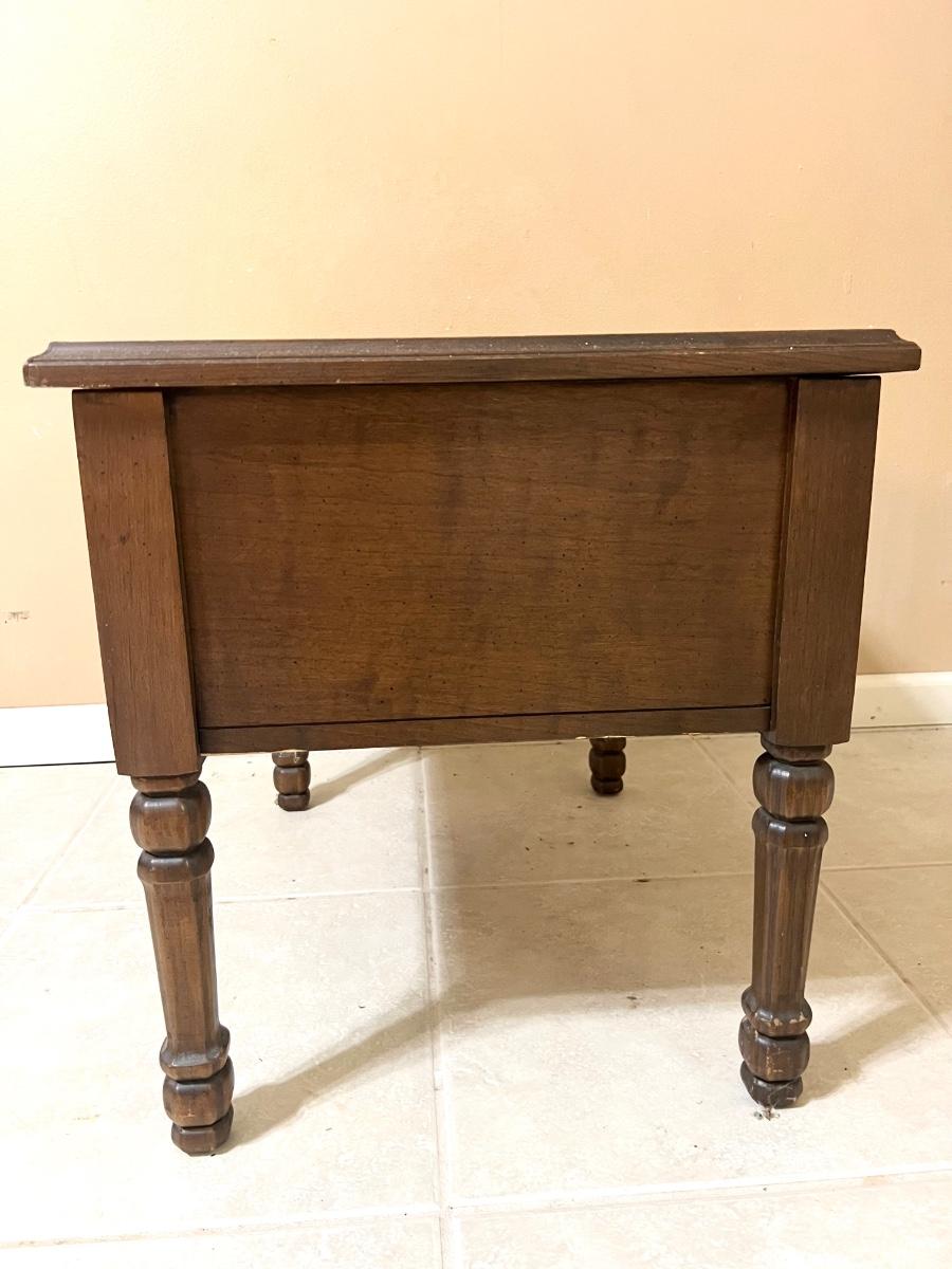 Wooden side table with black slate top table. Measures 21 1/2 inches tall, 20 inches wide and 26 inches deep. Drawer does droop when opened up, see picture.