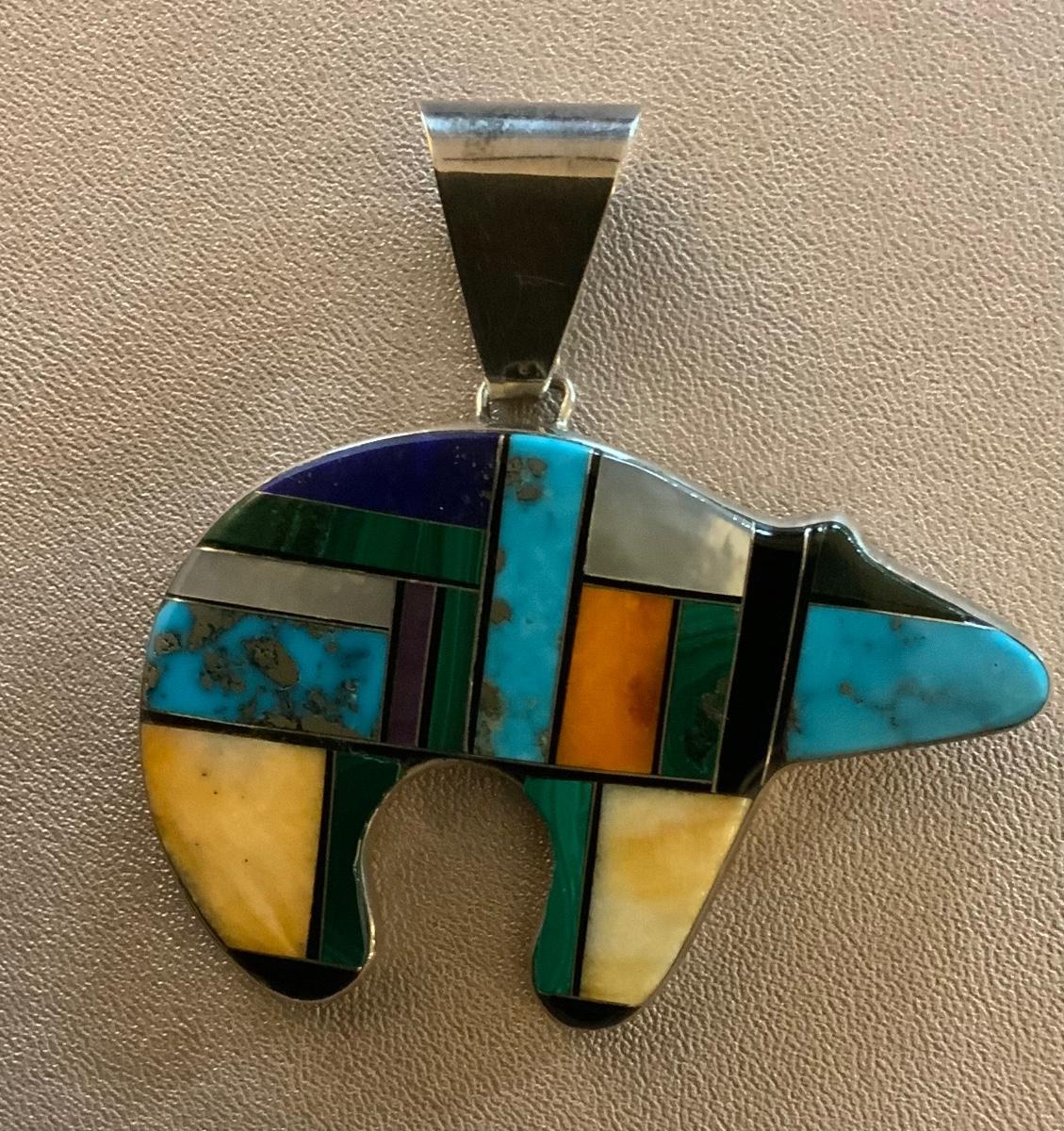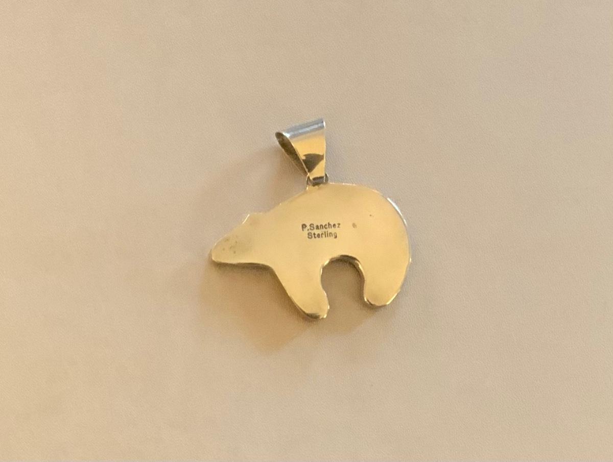 Navajo Silversmith, P. Sanchez pendant with inlaid stones of Turquoise, Spiny Oyster, Coral, and Lapis Lazuli. The back is marked P. Sanchez and Sterling. This piece is in magnificent condition. The stones are beautiful and vibrant in colors.