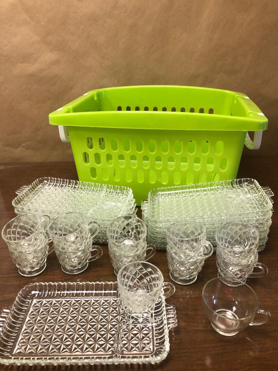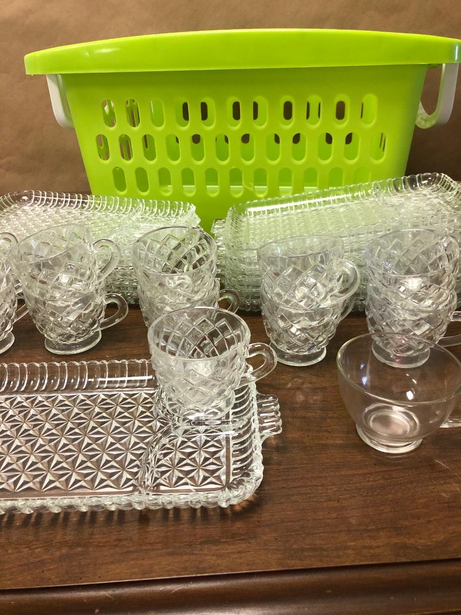 12 glass luncheon trays and cups. One cup doesn’t match. Nice basket with handles!