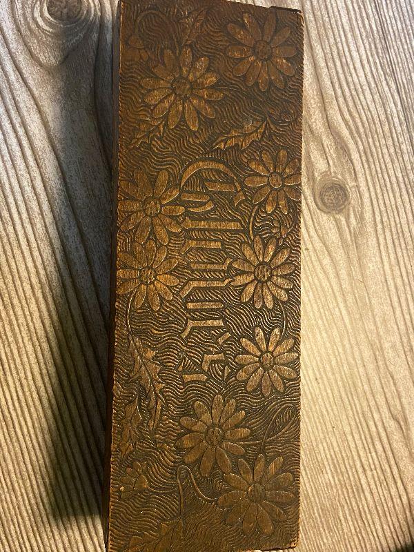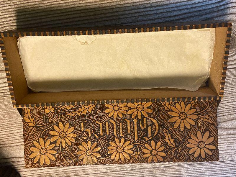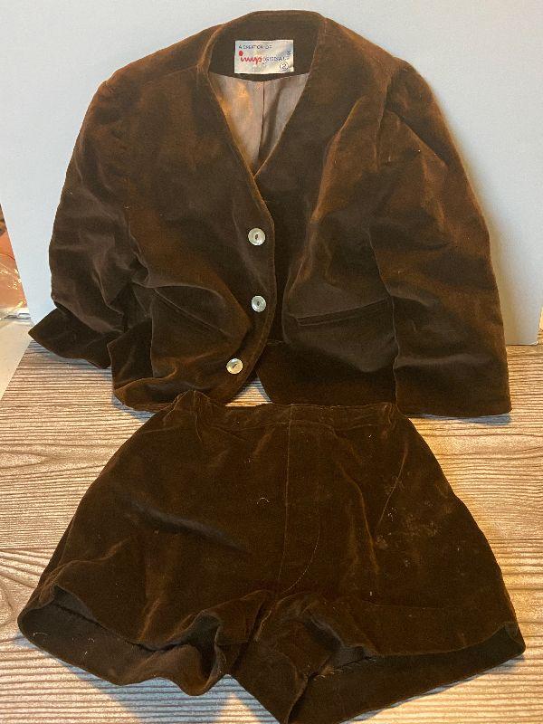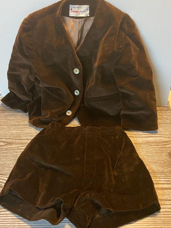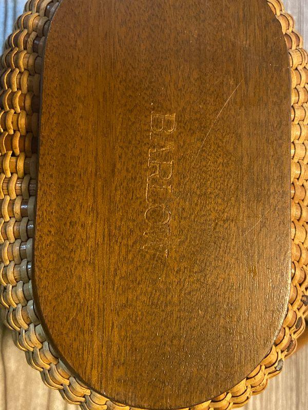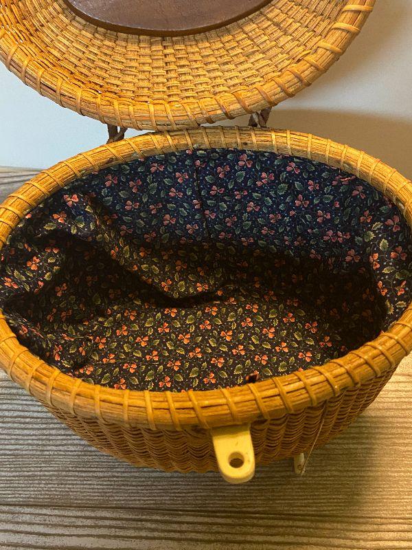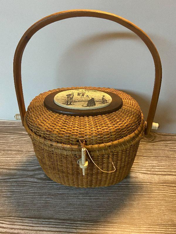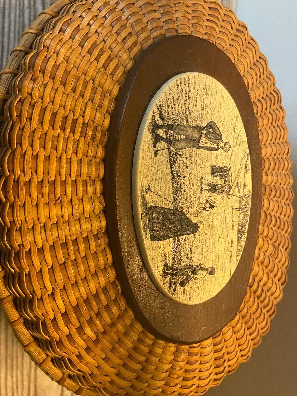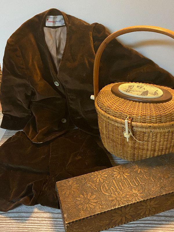 This handbag is a Barlow Nantucket Basket with a carved Golf scene on the top, marked Barlow on the bottom. These are highly collectible and hard to find. Also, included is a childs vintage velvet suit, and wood carved glove box.