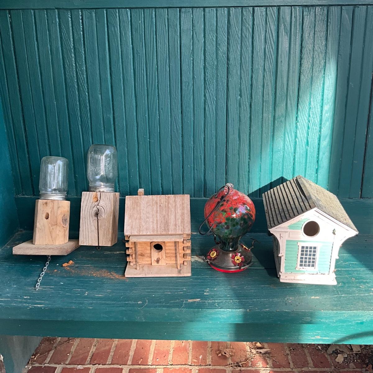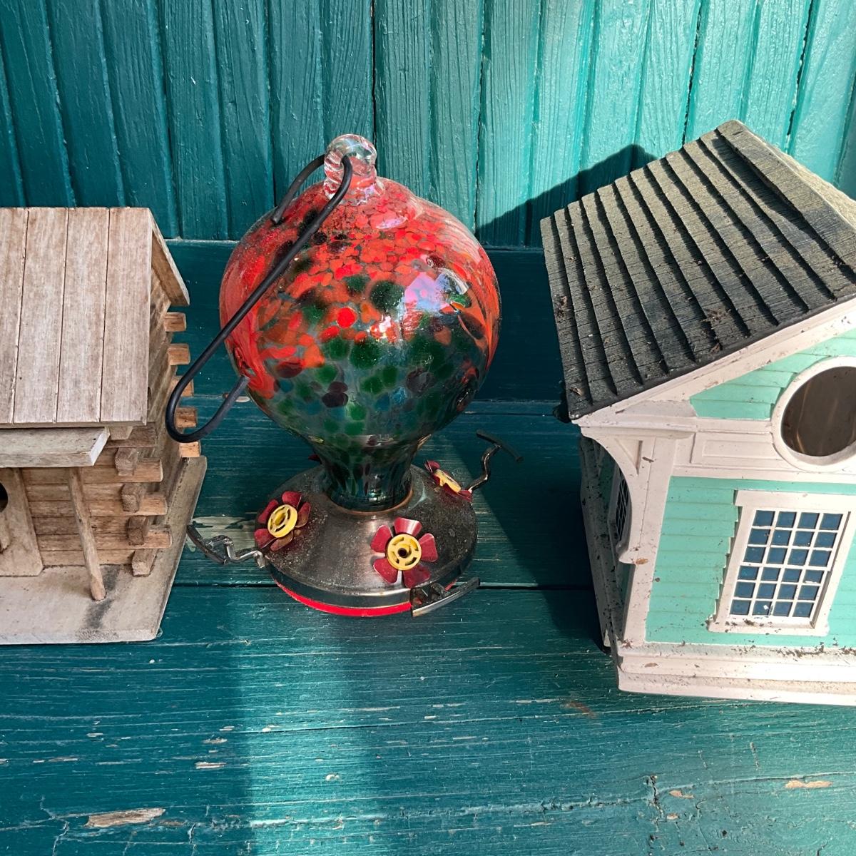 Glass hummingbird , log cabin and two handmade hummingbird feeders