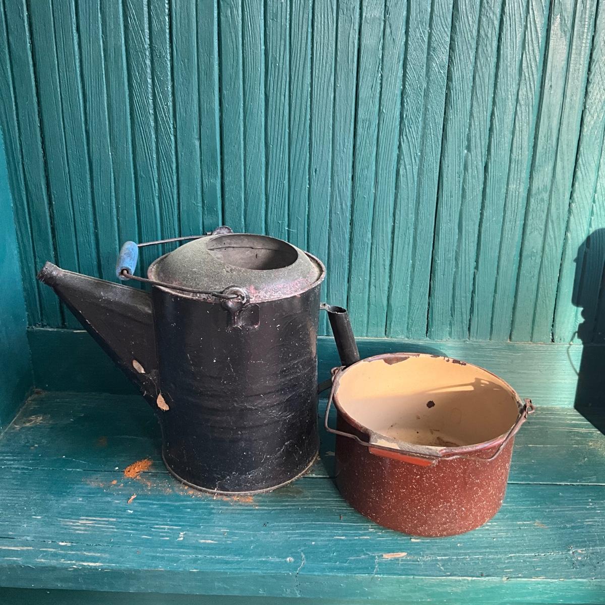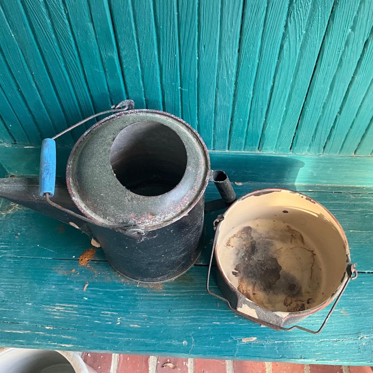 P1019 vintage metal Watering can with a Enamelware pot