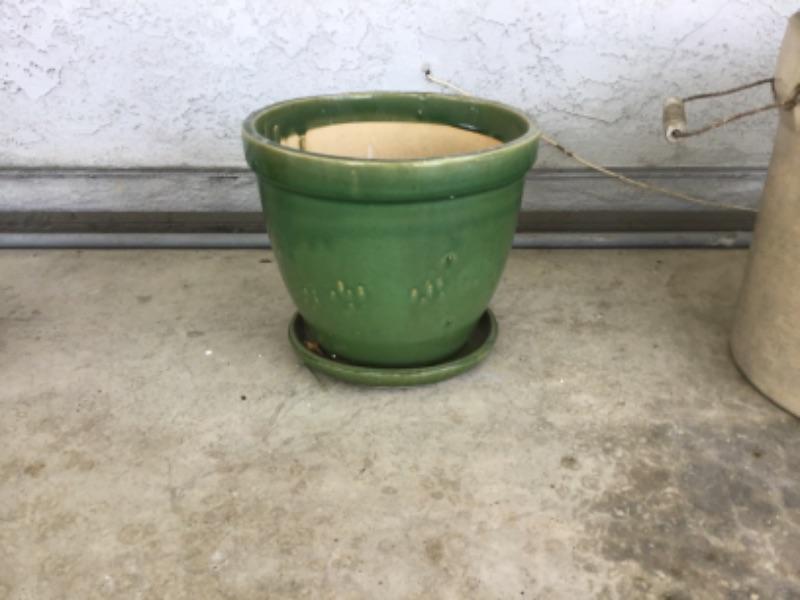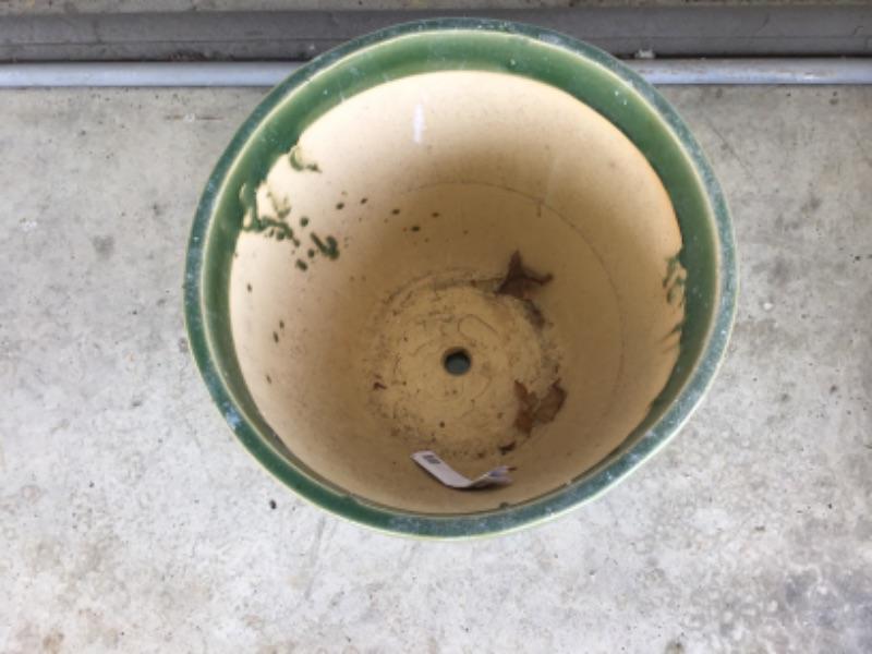 Green glazed ceramic pot. Measures 10 inches high by 12 inch diameter