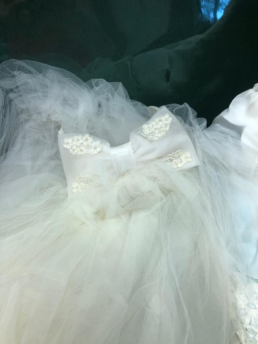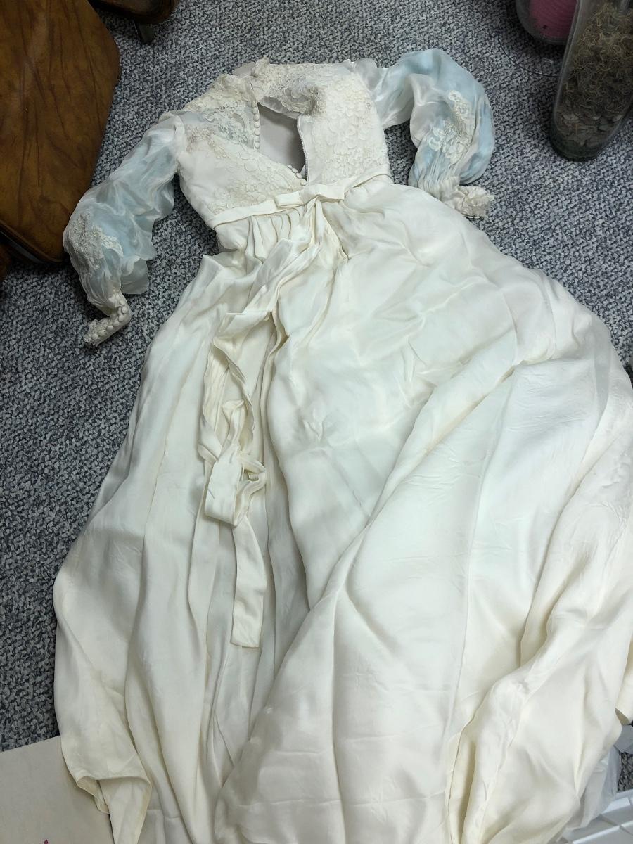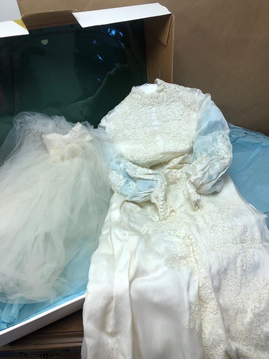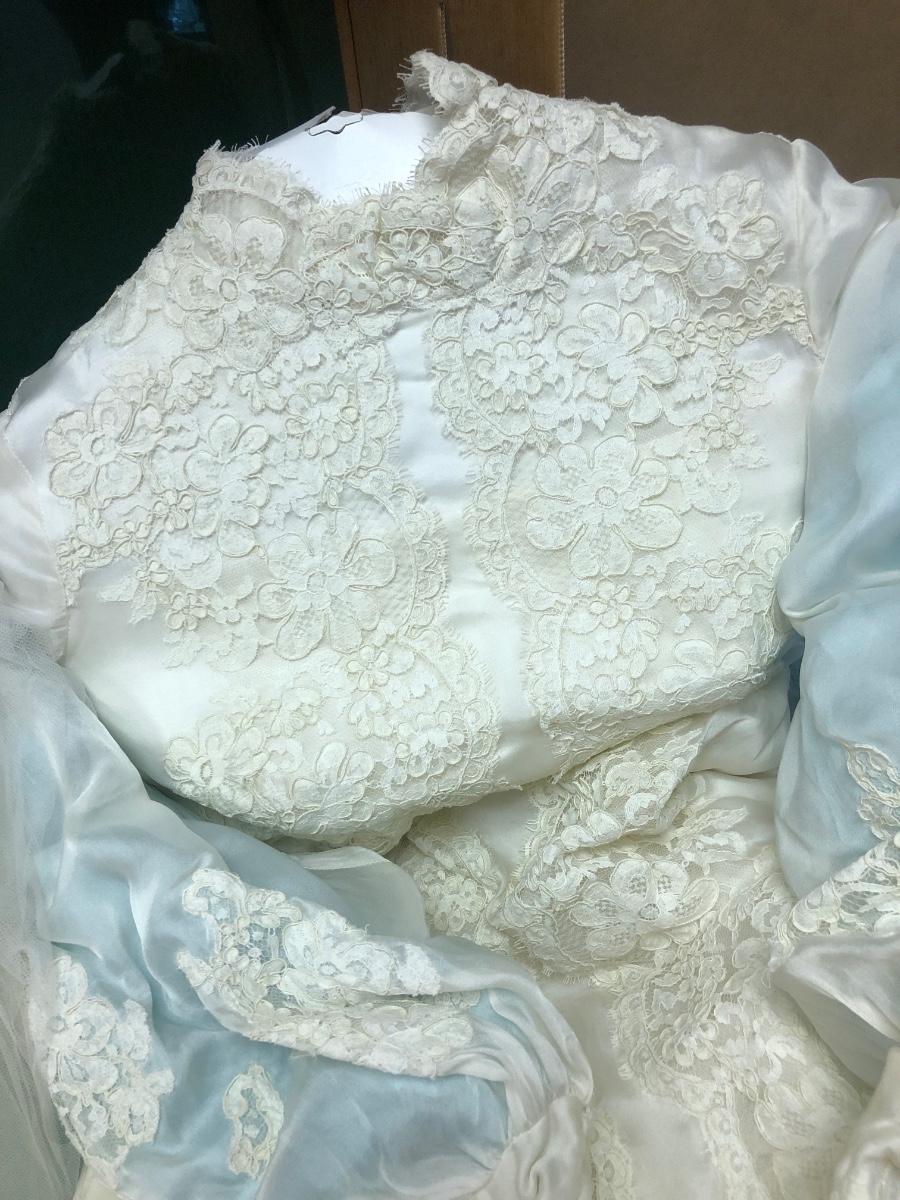 1960?? Has yellowed. Beautiful fabric and lace. Guessing a size 7.