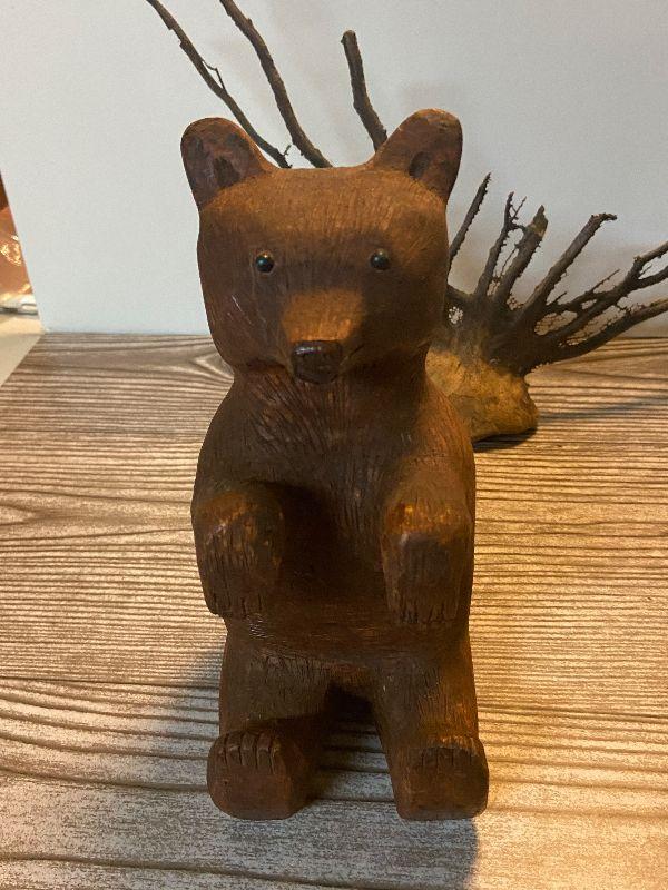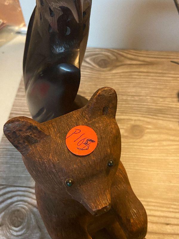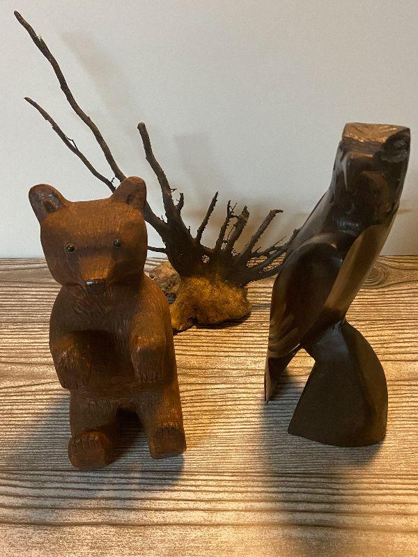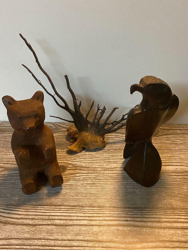 Carved eagle, not sure of wood type but heavy and professionally made, the bear was carved by a local artist, and the ocean root was Gods natural work. Please see pics for exact content of this lot, condition of the items, and sizes if needed. Thank you for looking and have fun bidding.