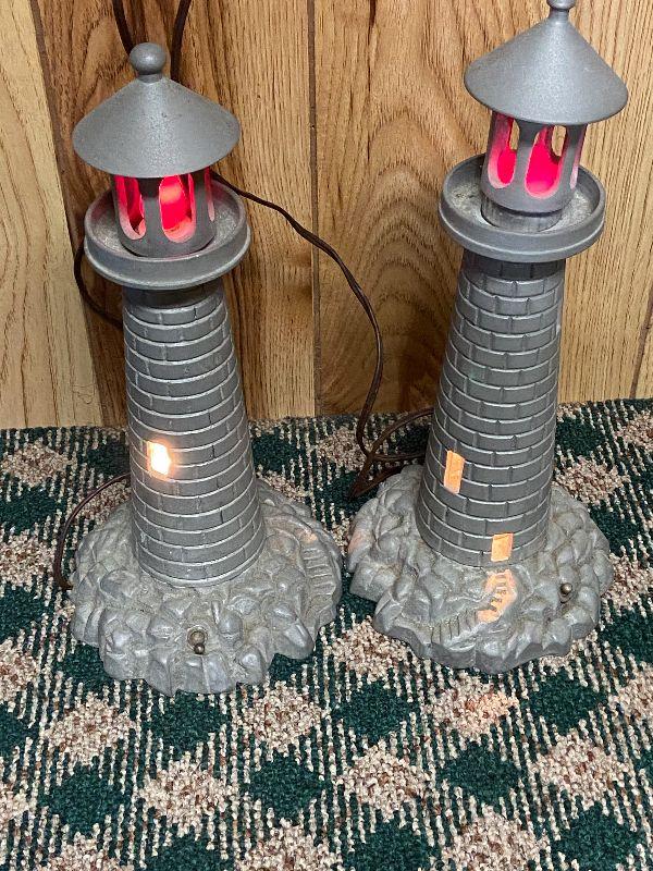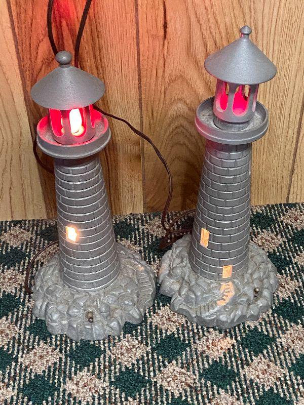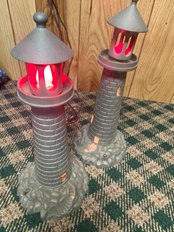 This is unique set of Pewter Lighthouses. They do work and they light up these are not figurines. They can be used as nightlights or decorative soft lighting. Please see pics for exact content of this lot, condition of the items, and sizes if needed. Thank you for looking and have fun bidding.