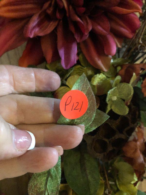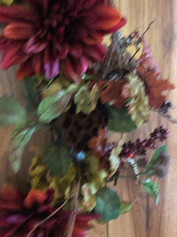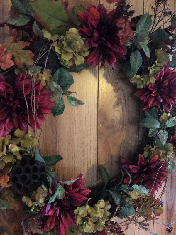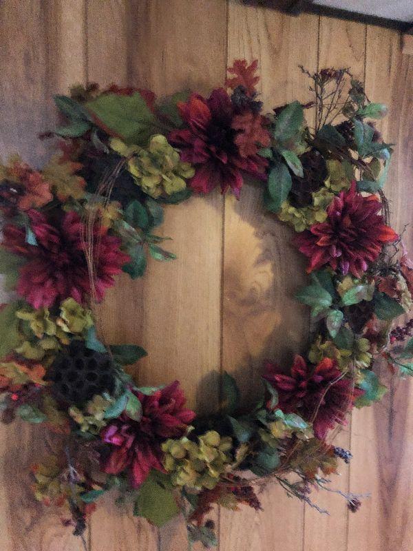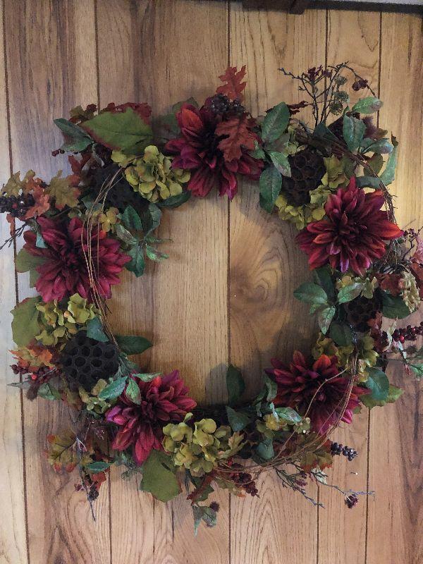 P121: Large Fall Wreath Maroon with Zinnia's and Hydrangea flowers.