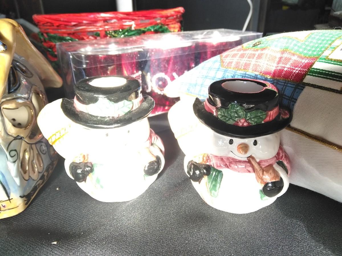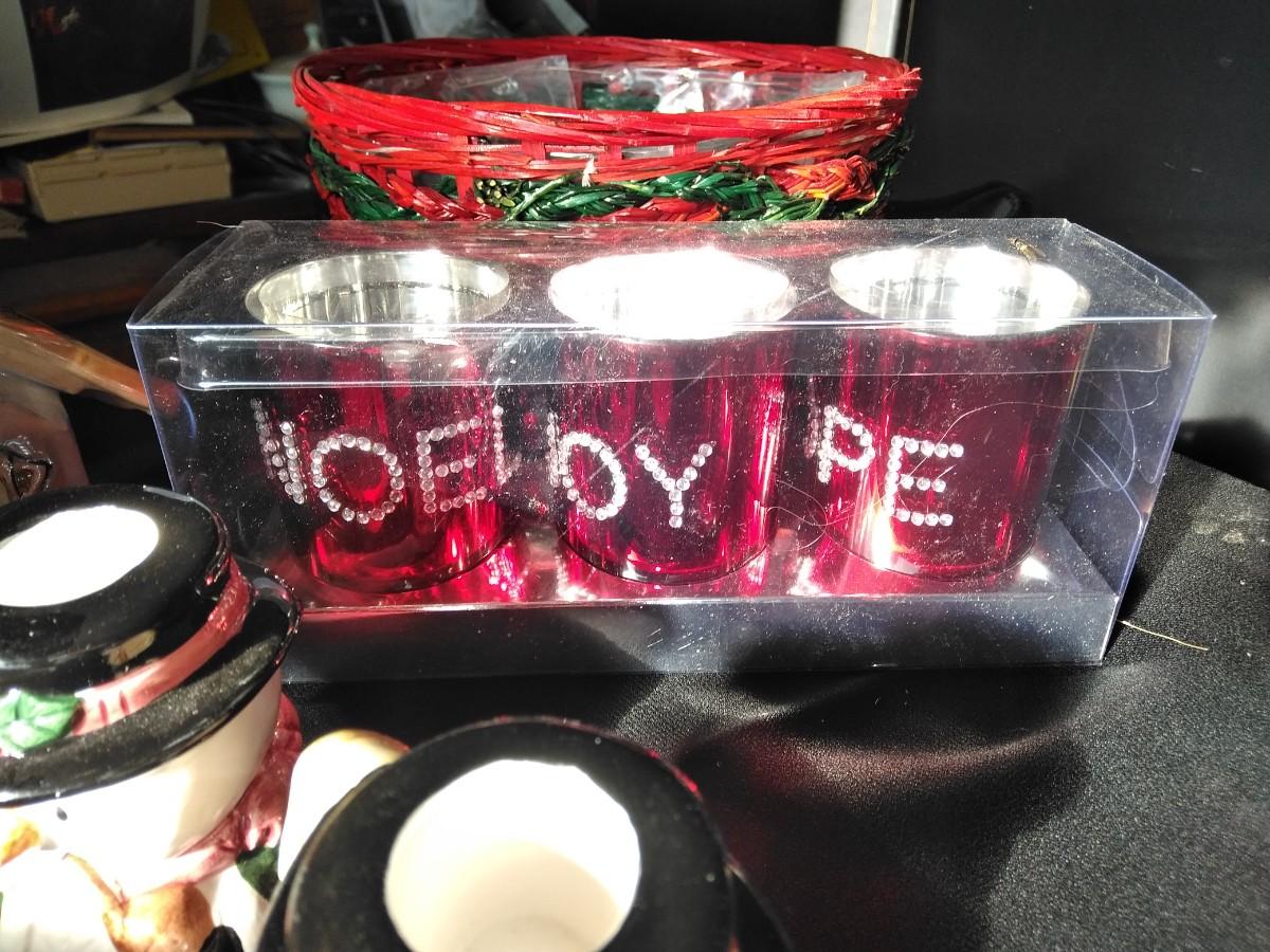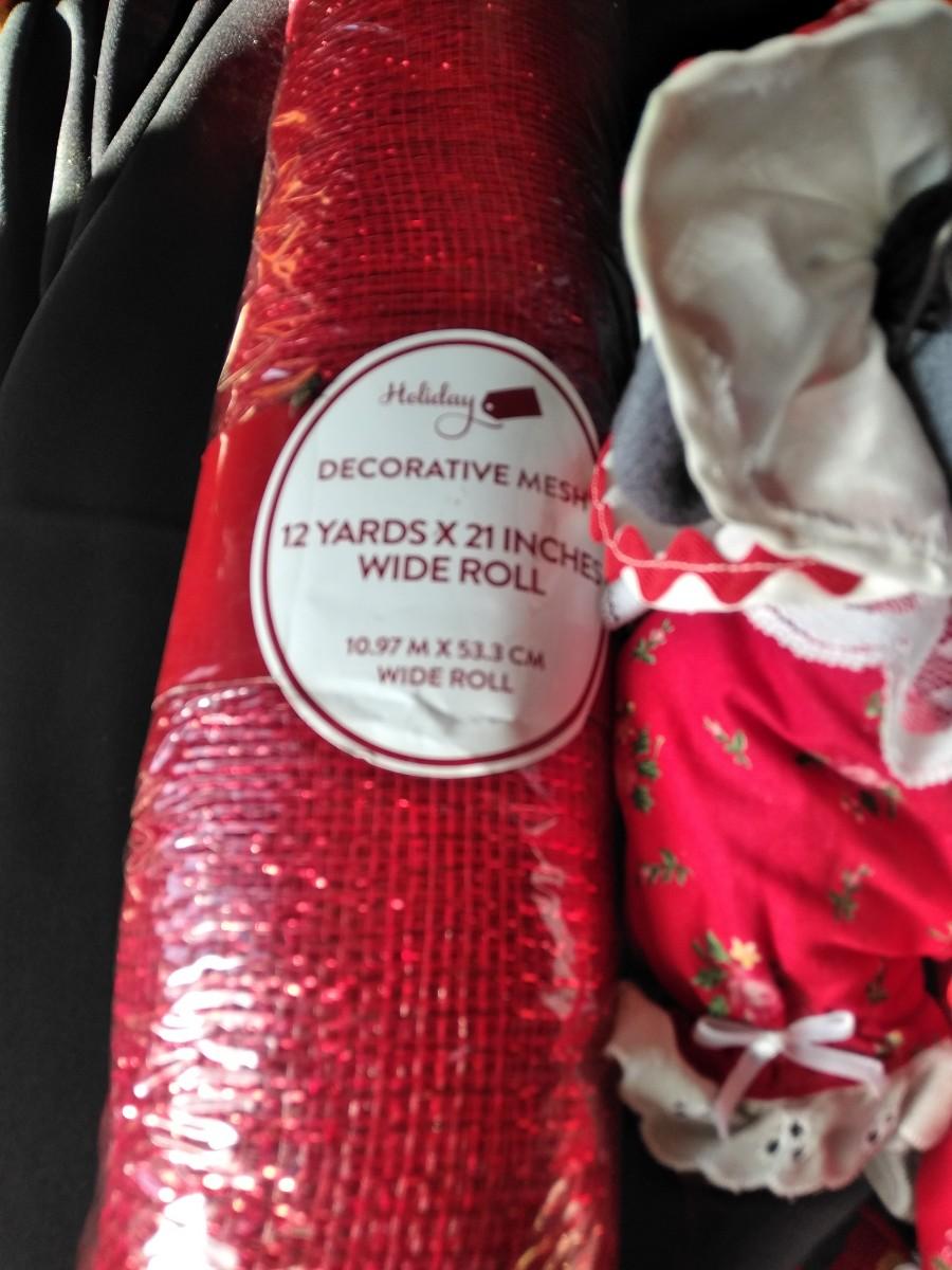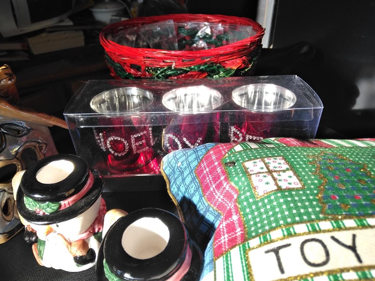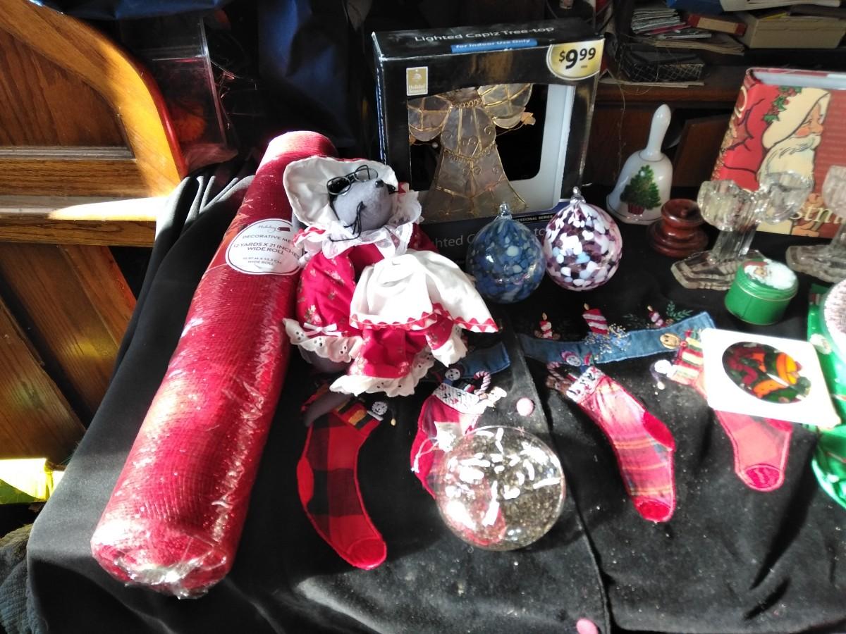 HOLIDAY RED DECORATIVE 12 YARD X 21" MESH ROLL, CHRISTMAS MOUSE, VEST WITH CHRISTMAS SCENE, LIGHTED CAPIZ TREE TOPPER, GLASS DECORATIVE BULB ORNAMENTS, CHRISTMAS DISHWARE, SNOWMAN CANDLE HOLDERS AND MORE