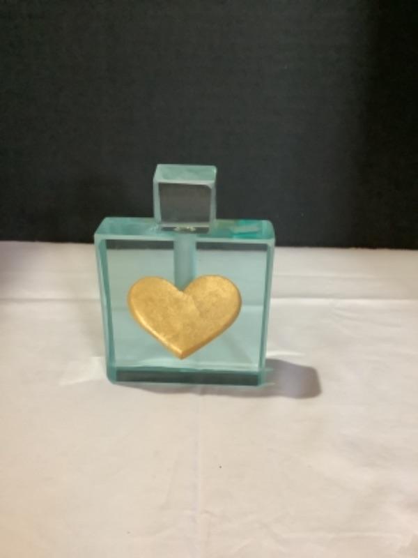Gold Hear Perfume Bottle which is made of cold worked clear glass with carved Heart design filled with 23 karat gold leaf