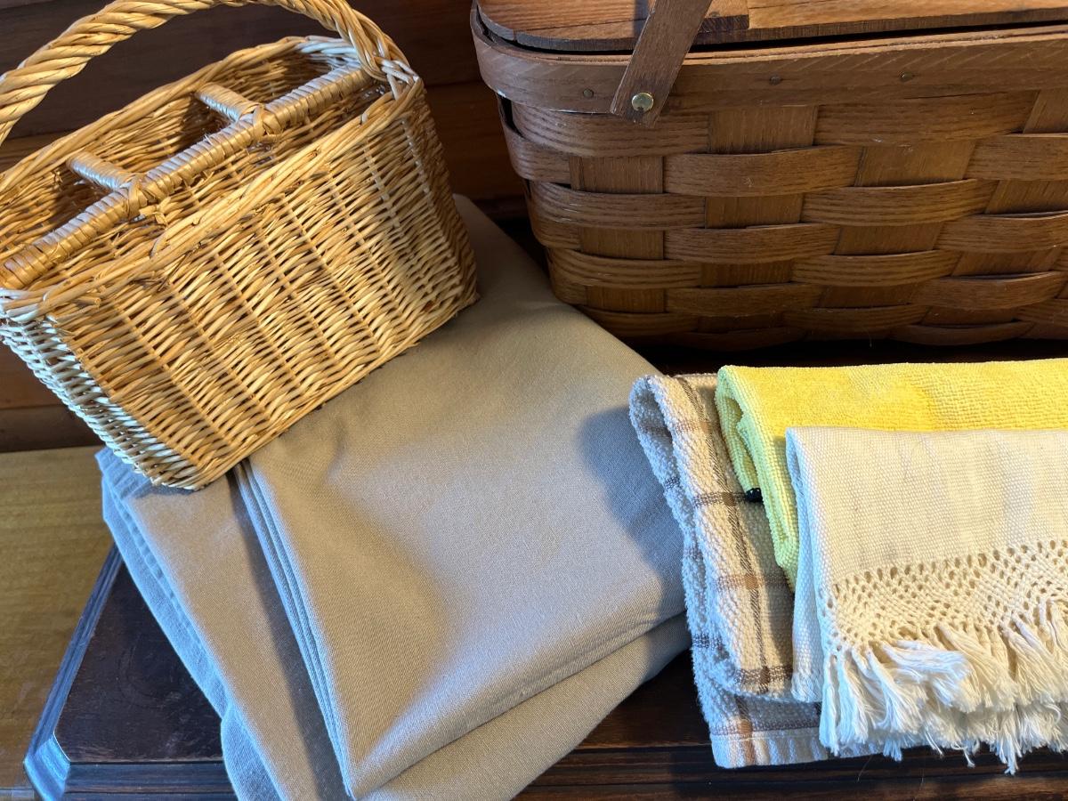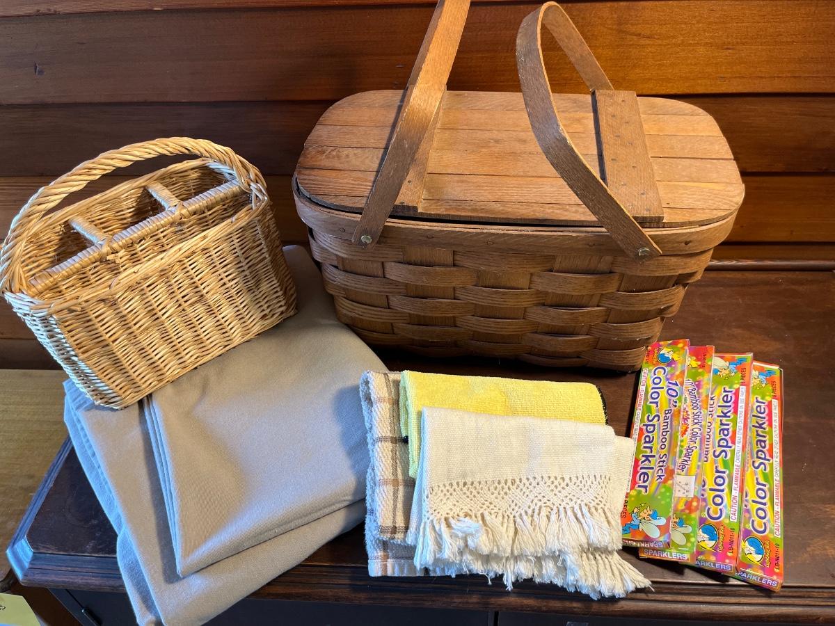 P145- Picnic basket, tablecloth, utensil holder, sparklers
