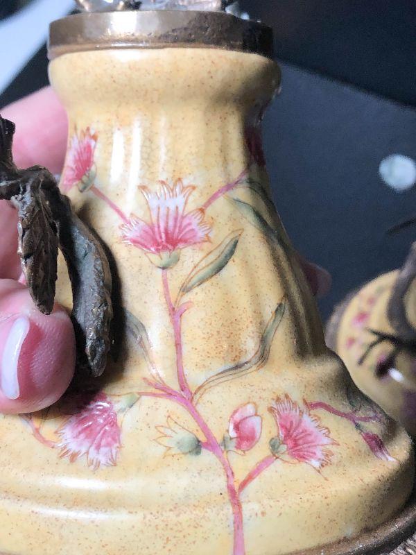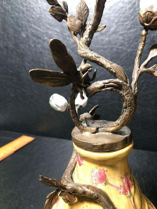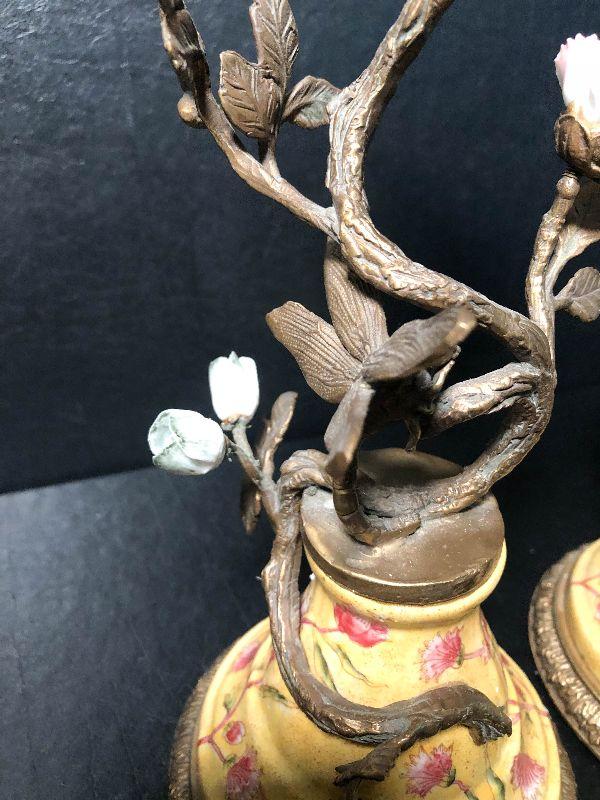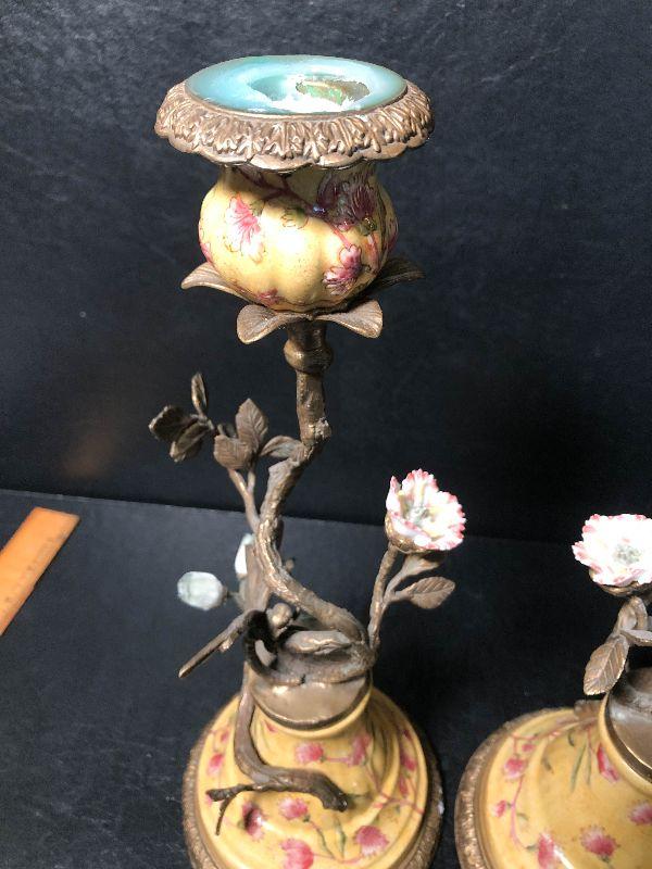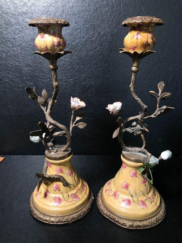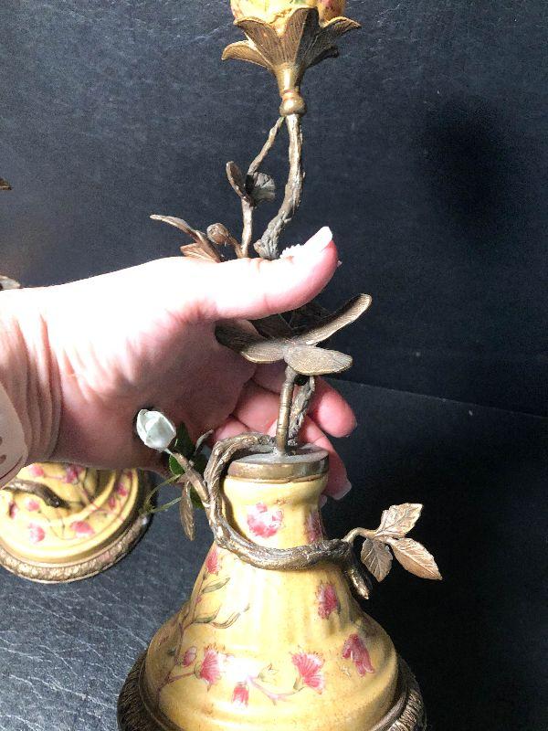 These candlesticks are getting harder to find in this wonderful condition. Crackle glaze porcelain bases with climbing intricate vines and dragonflies in the metalwork! Marked Mark Roberts. There is a matching vase being sold separately. These are perfect alone or as a set! Please see pics for condition of these beauties! Around 13 inches high!