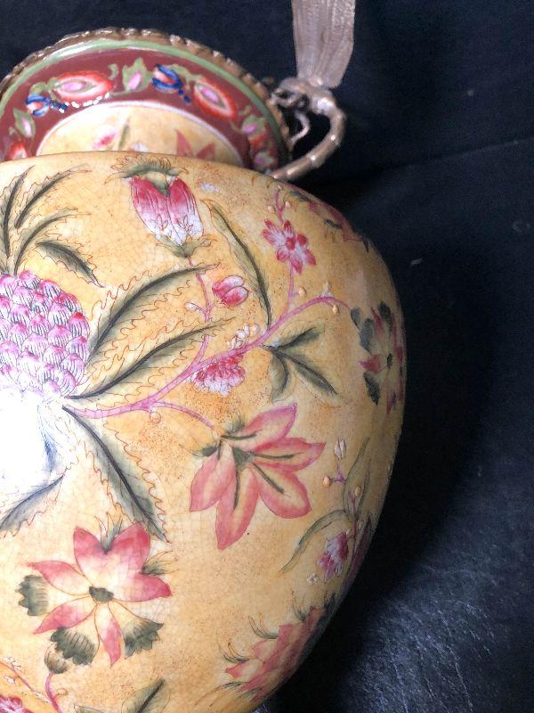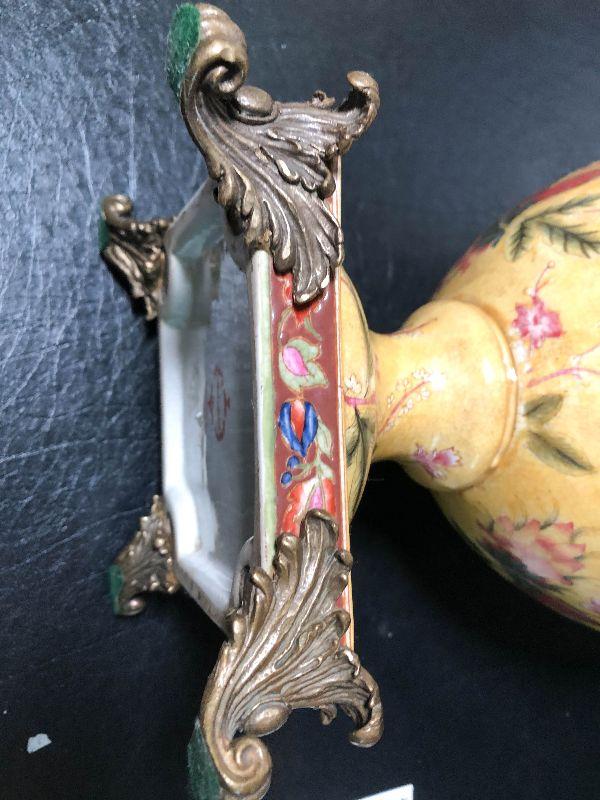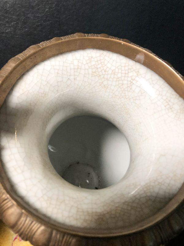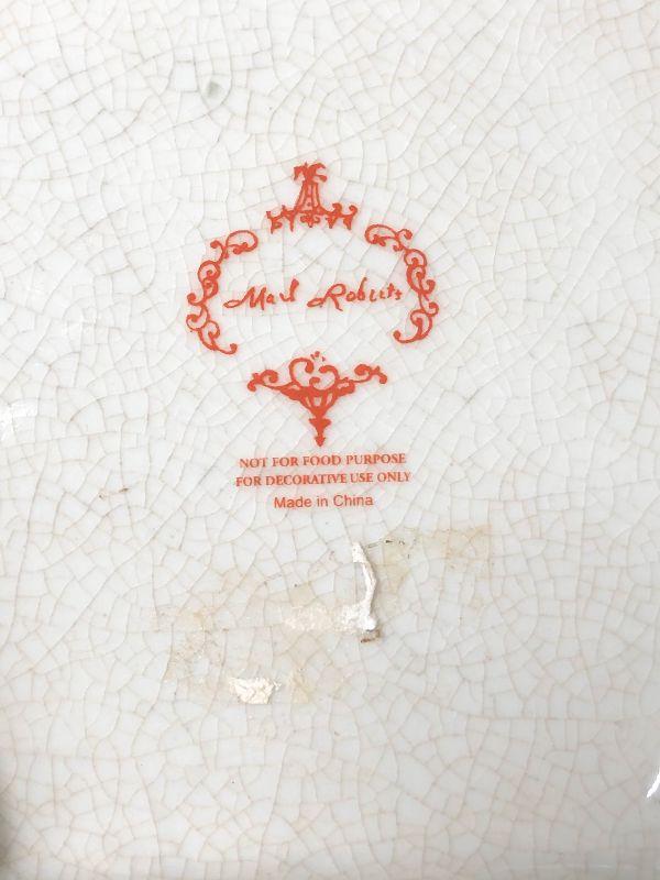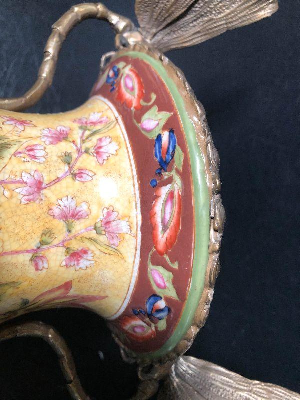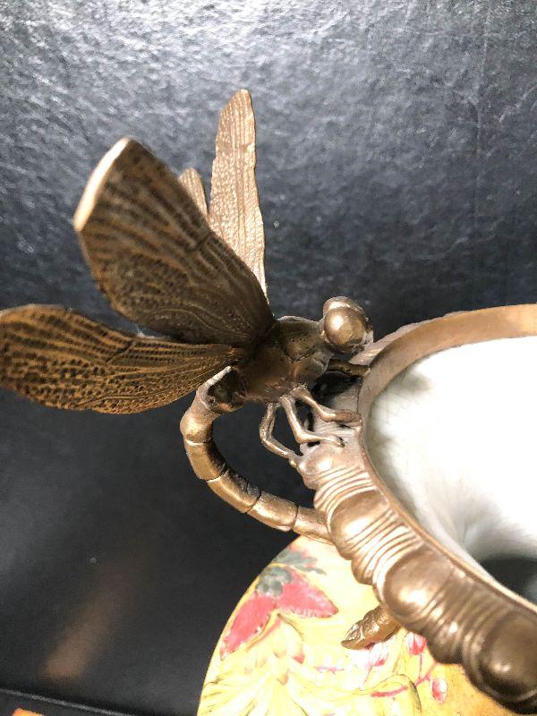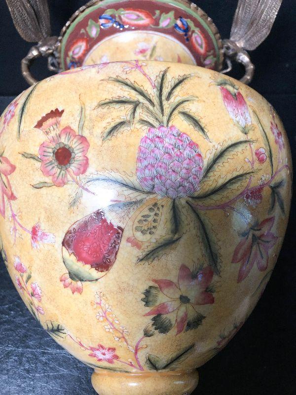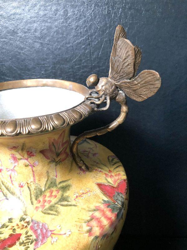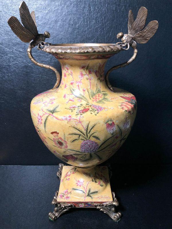 This is an incredible piece by decorator Mark Roberts. This is marked on the bottom, measures around 17 inches high, and is very desirable! The vase itself is crackle glaze porcelain with floral and pineapples design and finished with intricate dragonfly metal handles. A rare piece with the large dragonfly handles! Please see pics for additional designs, makers mark, and sizing.