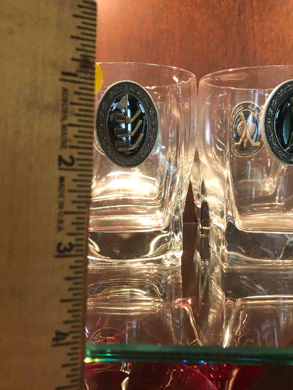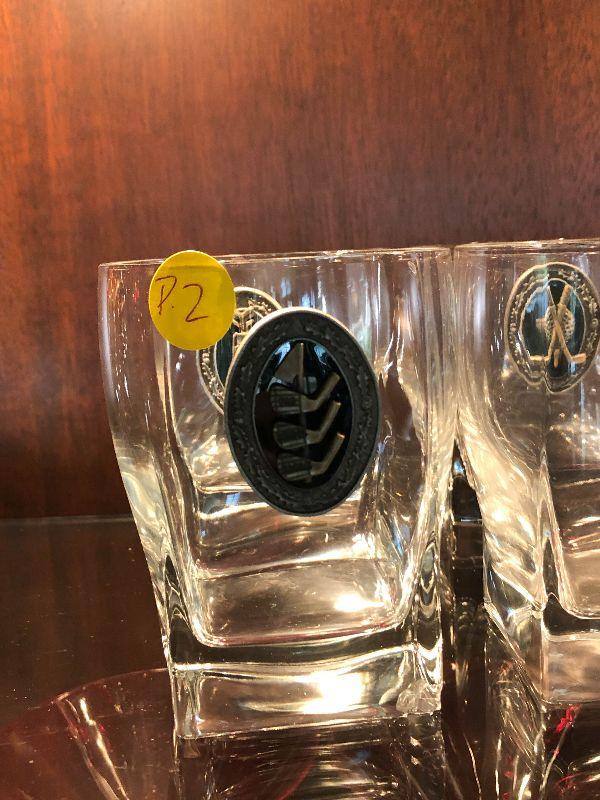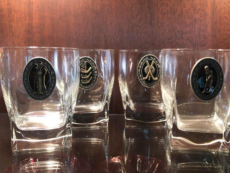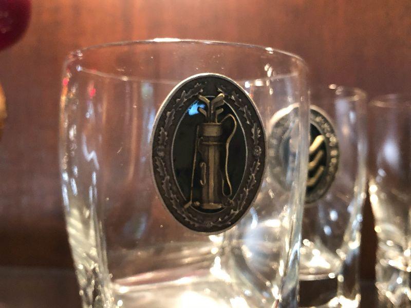 Nice lot of glasses with Gold designs on the front. One does have a small nick on top. Great for entertaining or decor. Please see pics for sizing and condition.