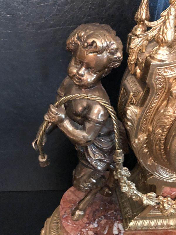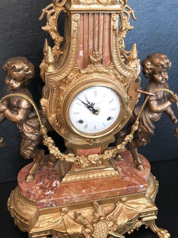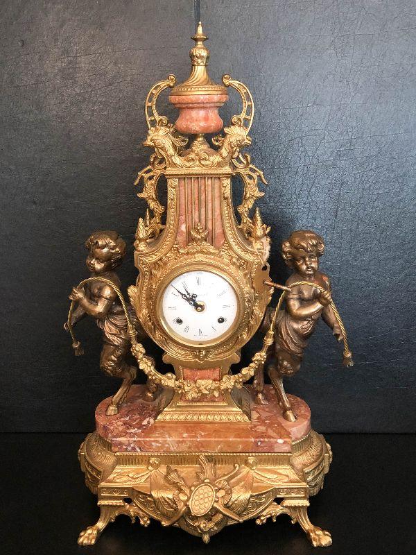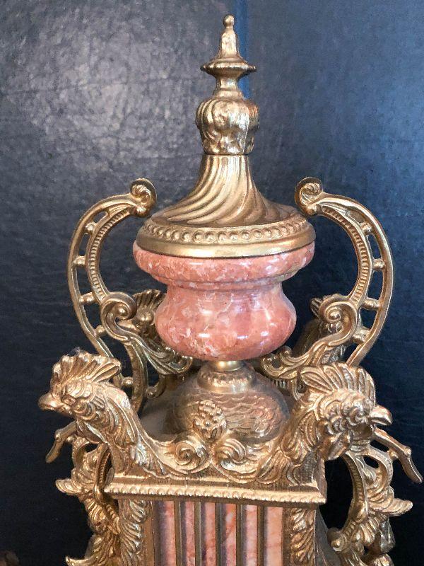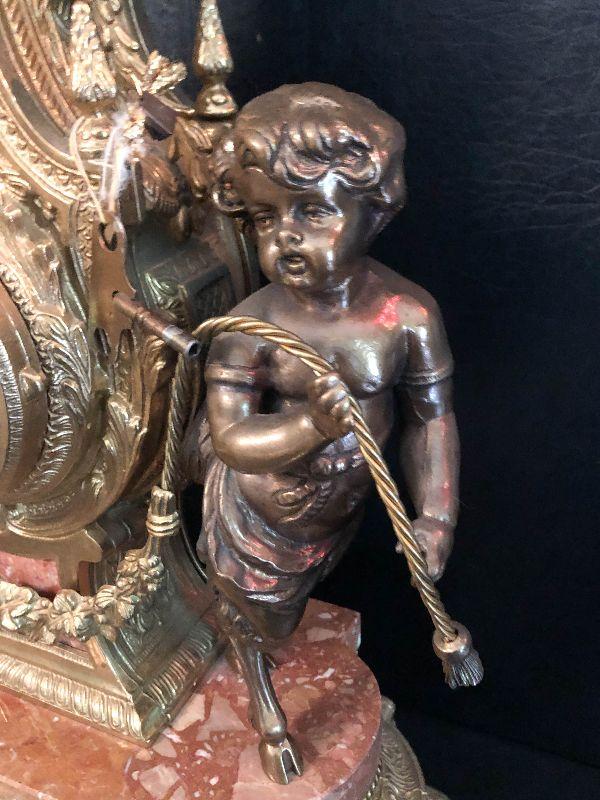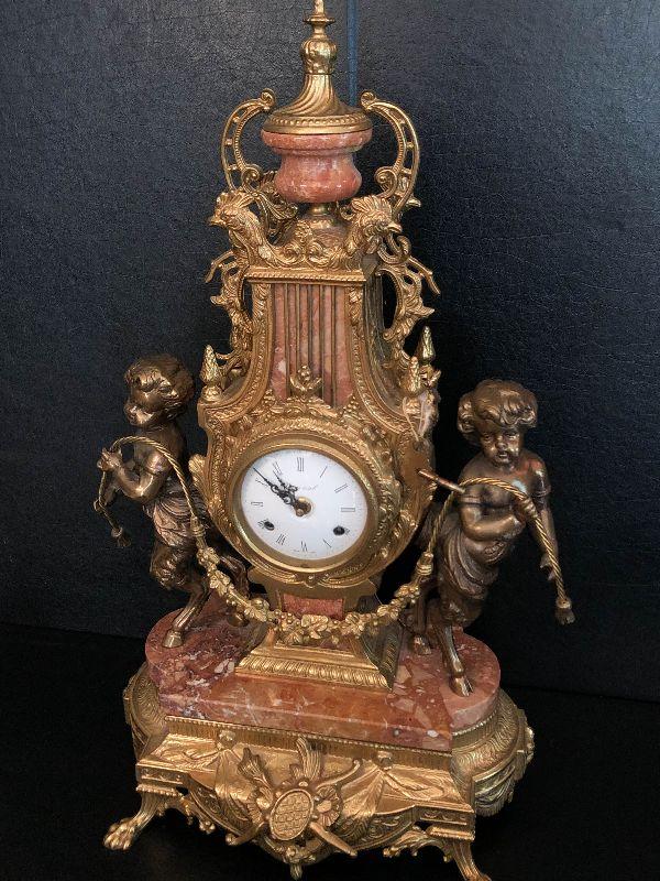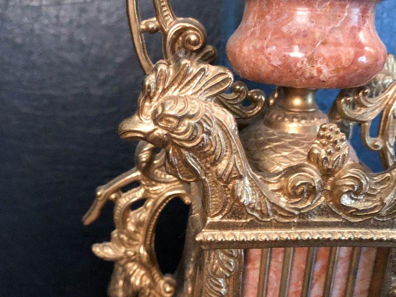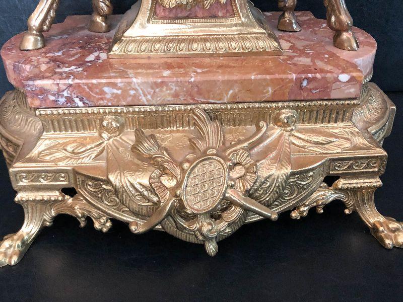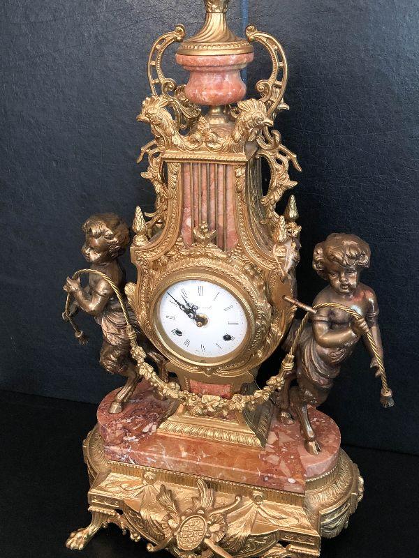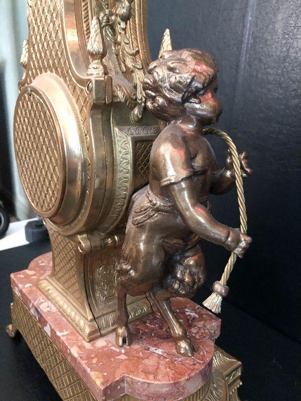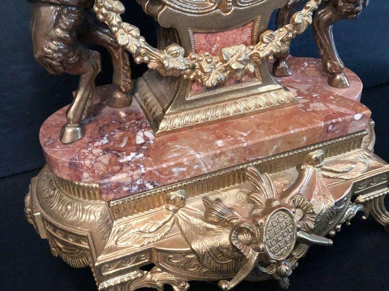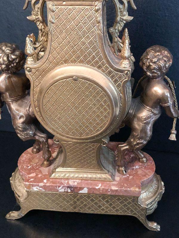 Ornate Brass and Marble Brevattato mantle clock. This clock is adorned on with large figural children with cloven hooves , rooster heads, and floral vines. Please see the pictures for details and measurements. The clock itself is untested and does come with its original key. This mantle clock has two matching Candelabras that are being listed separately in the next lot. Please see listing for the matching pair.