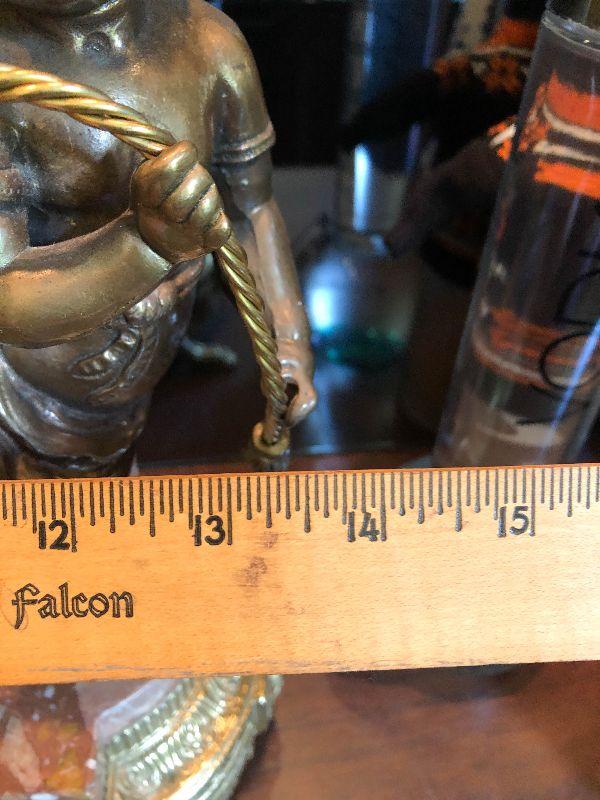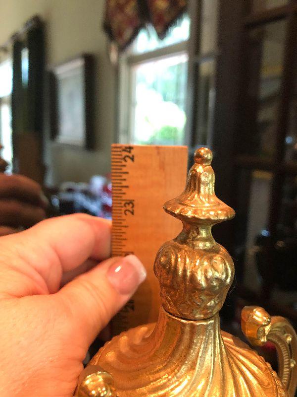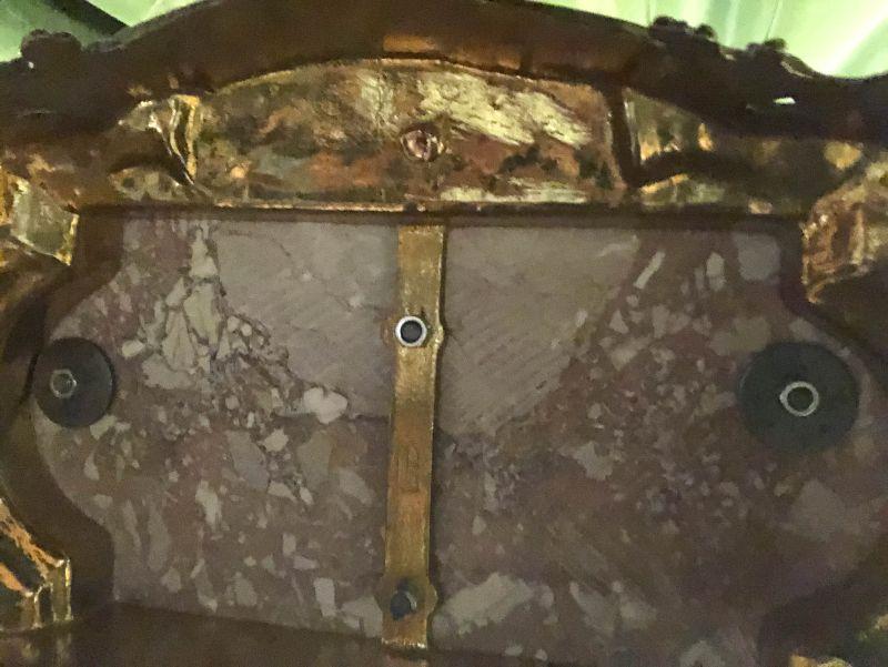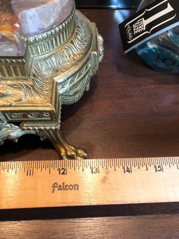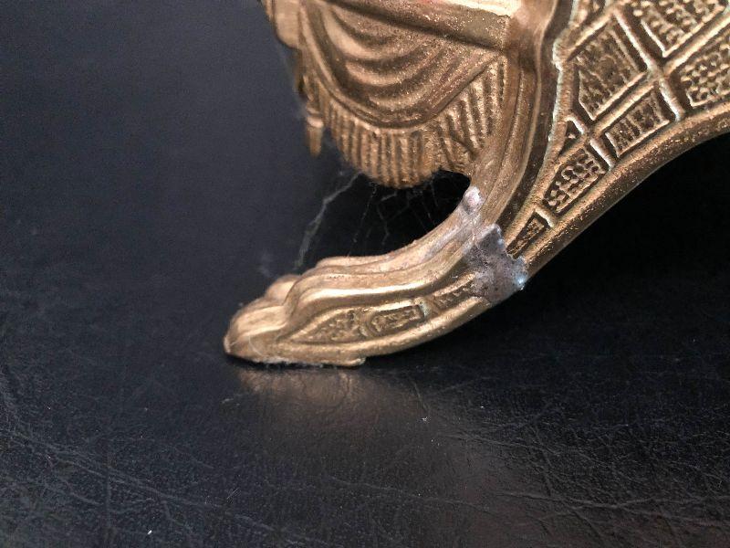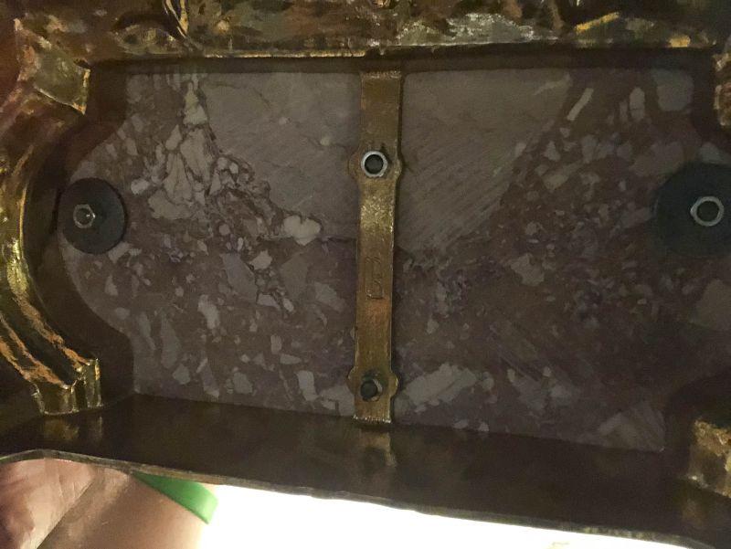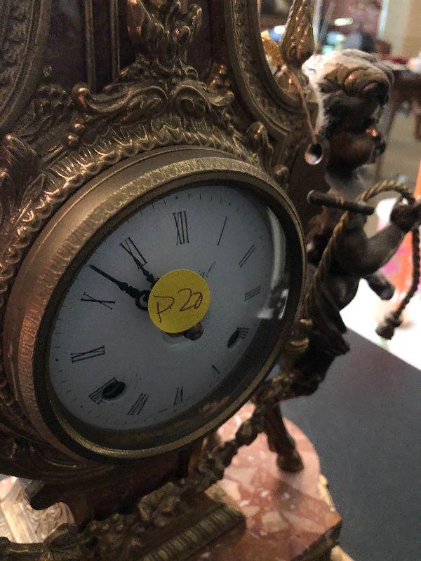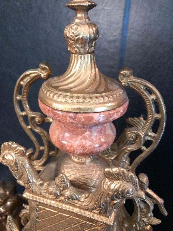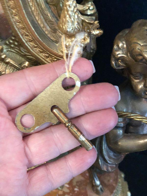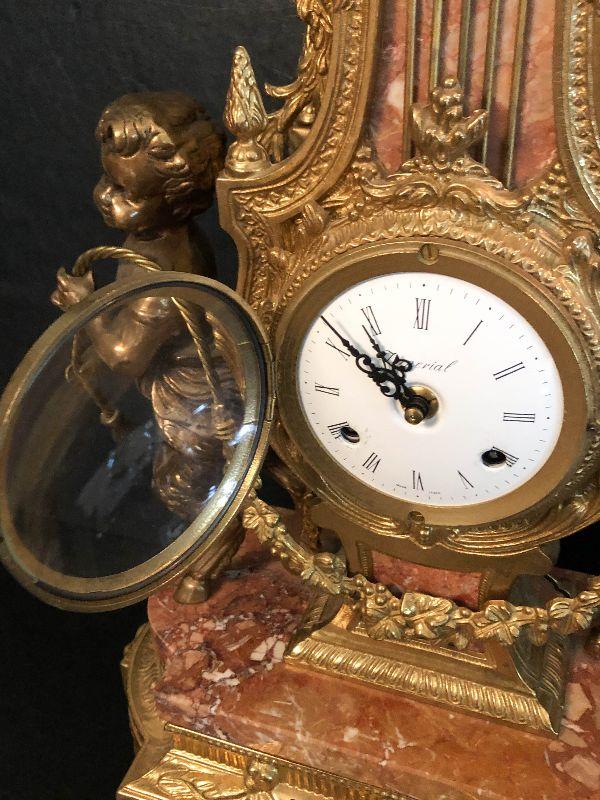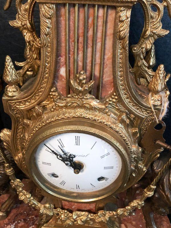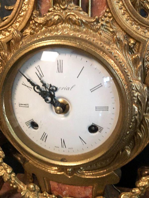 Ornate Brass and Marble Brevattato mantle clock. This clock is adorned on with large figural children with cloven hooves , rooster heads, and floral vines. Please see the pictures for details and measurements. The clock itself is untested and does come with its original key. This mantle clock has two matching Candelabras that are being listed separately in the next lot. Please see listing for the matching pair.