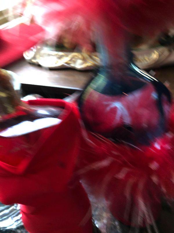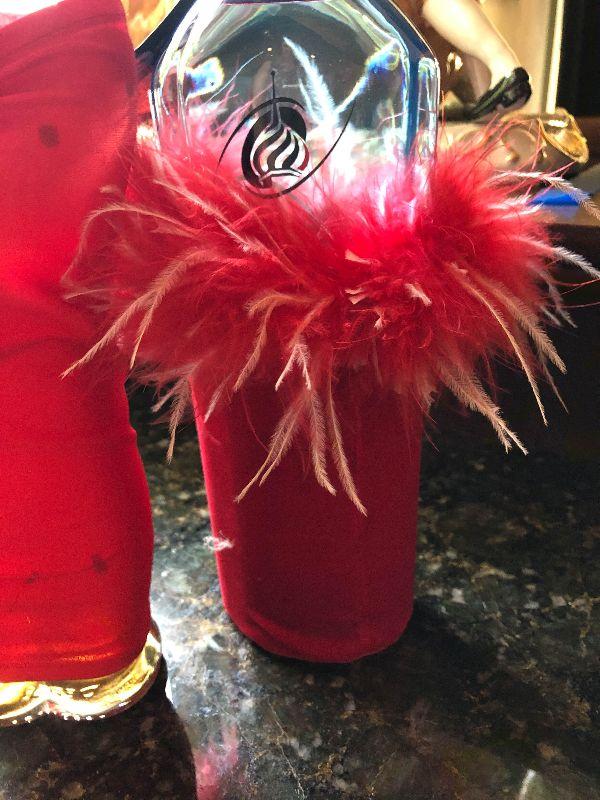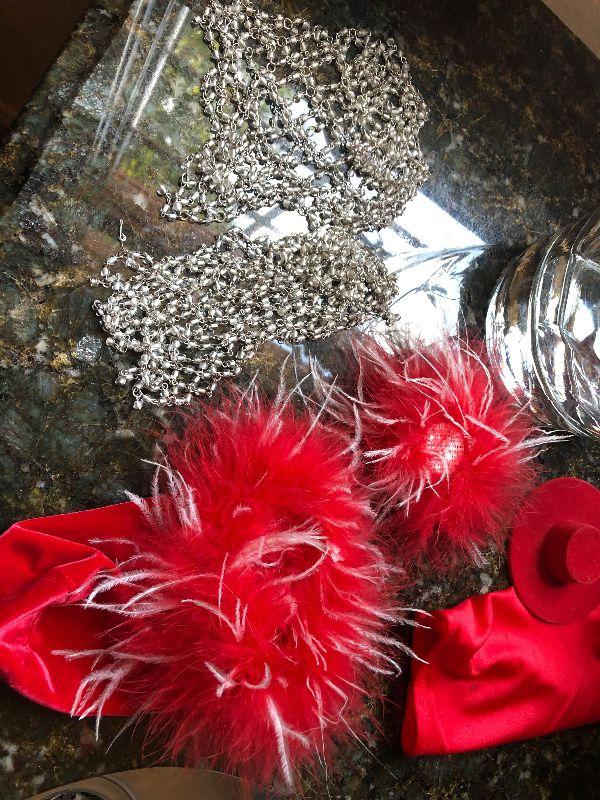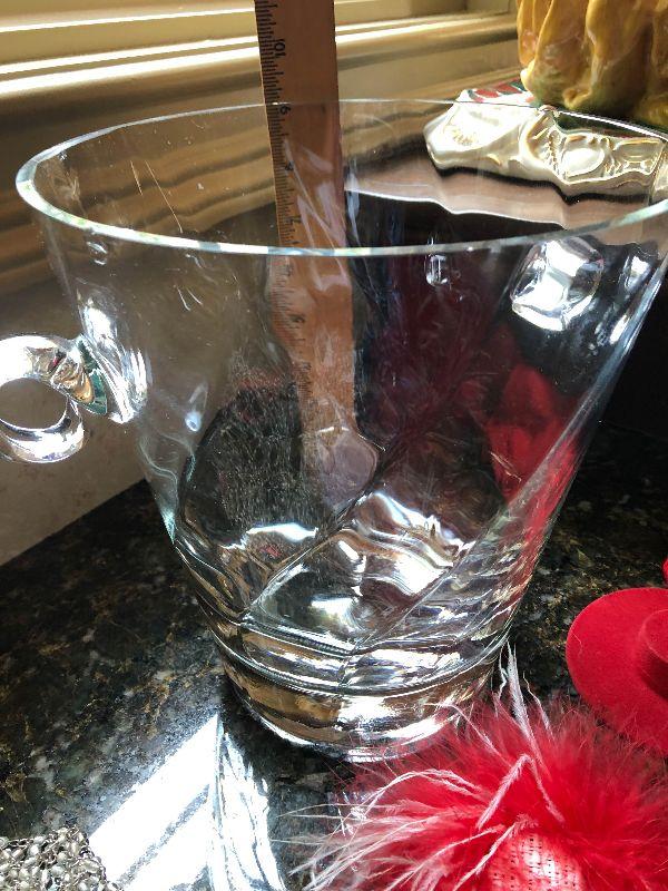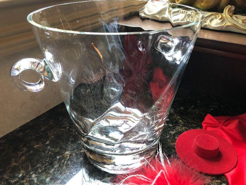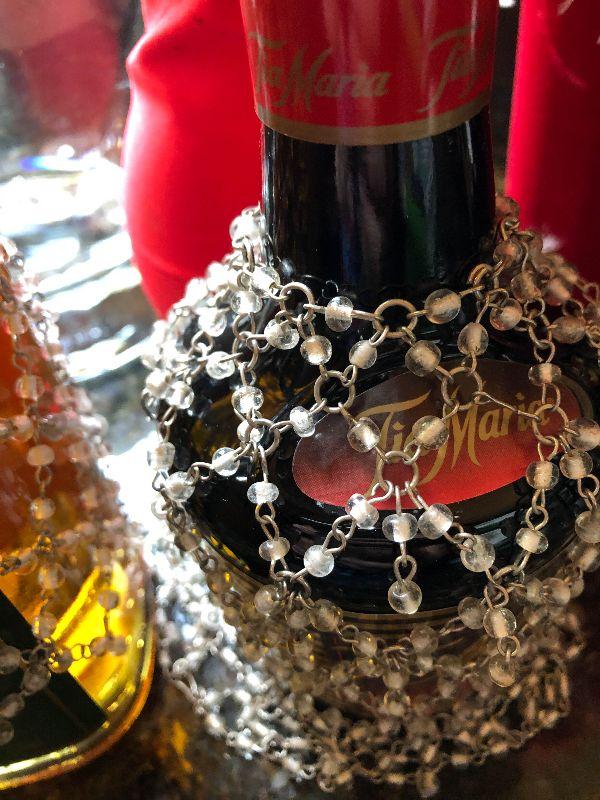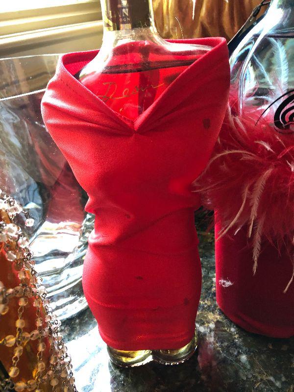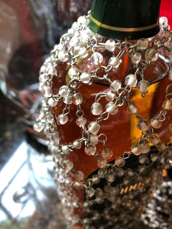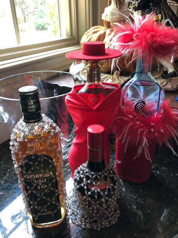This lot is to decorate your wine/bar bottles. Clothing and beaded bottle covers. Bottles are not included. Lot also includes a heavy glass ice bucket, that does have a small chip in top edge. Please see all pics for sizing and condition