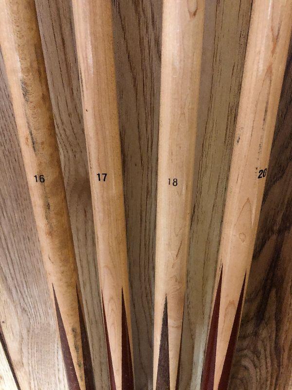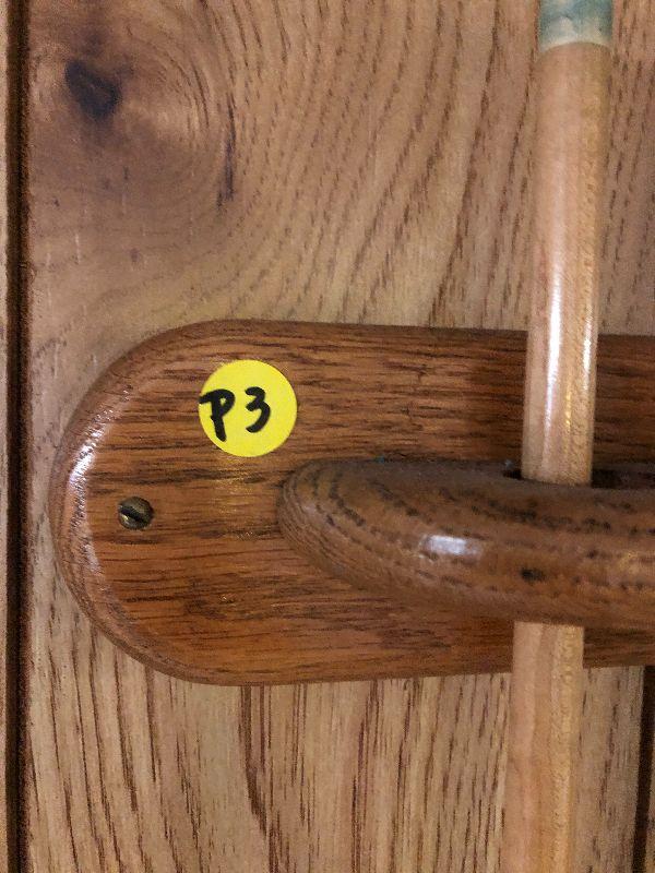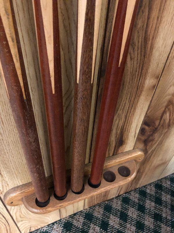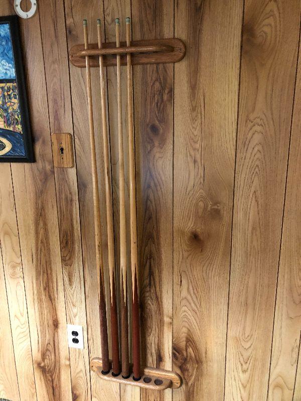 Pool sticks with wall mount. Numbers 16,17,18 and 20. Please see pics for condition, sizing, and contents of this lot. Thank you for looking and have fun bidding.