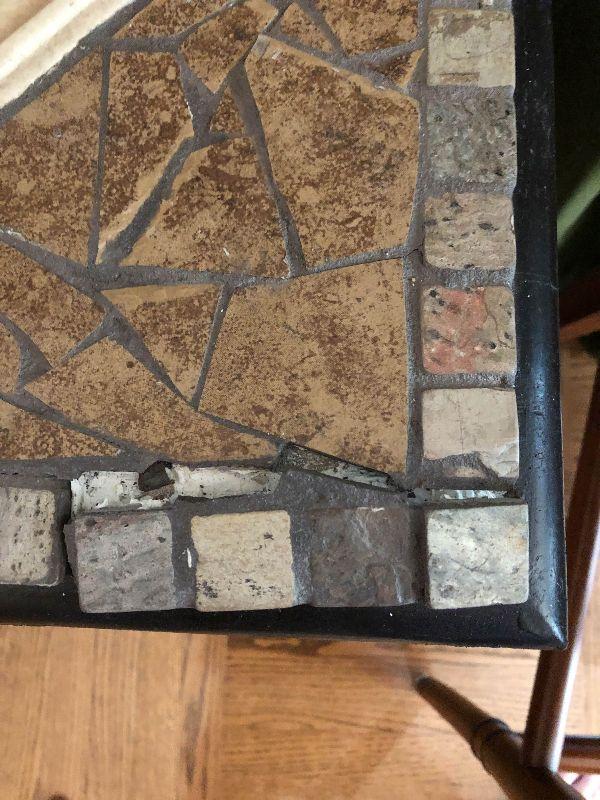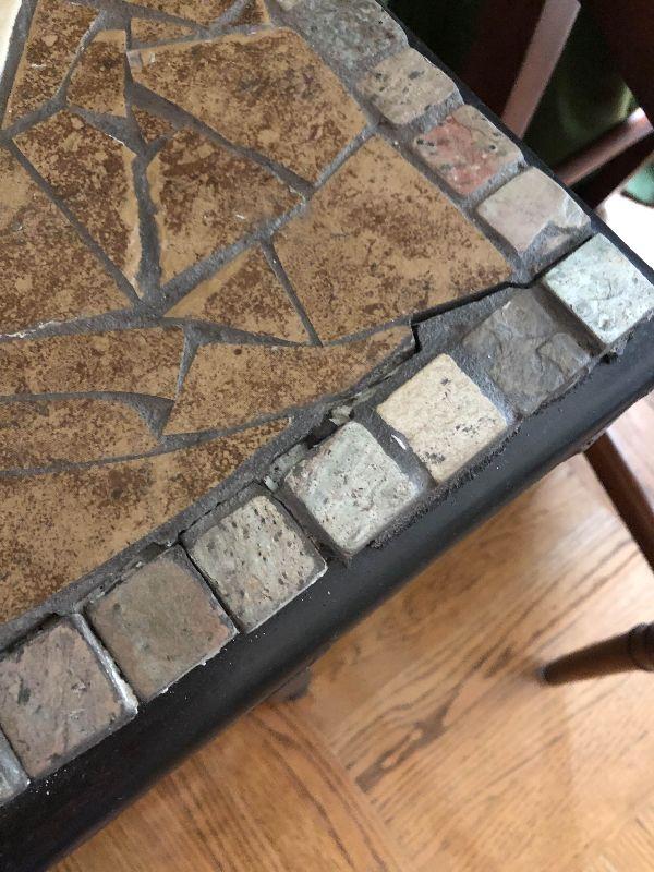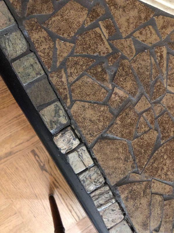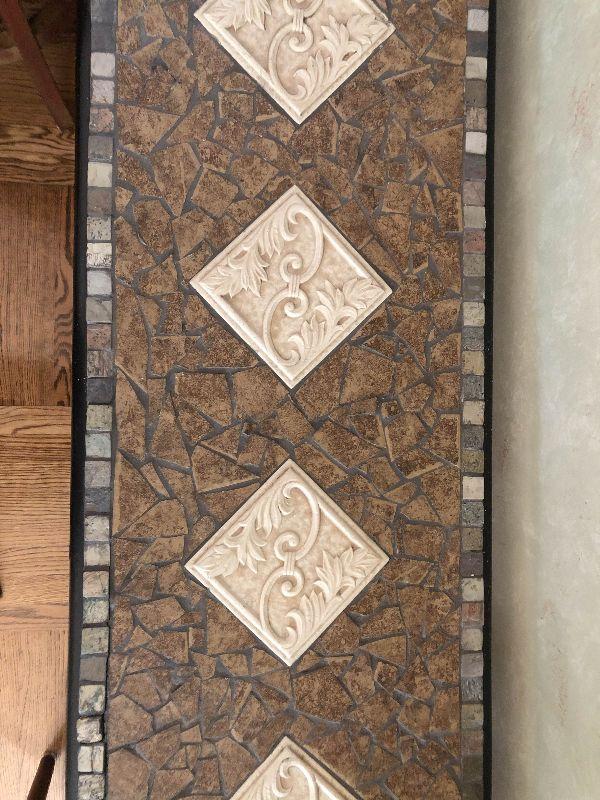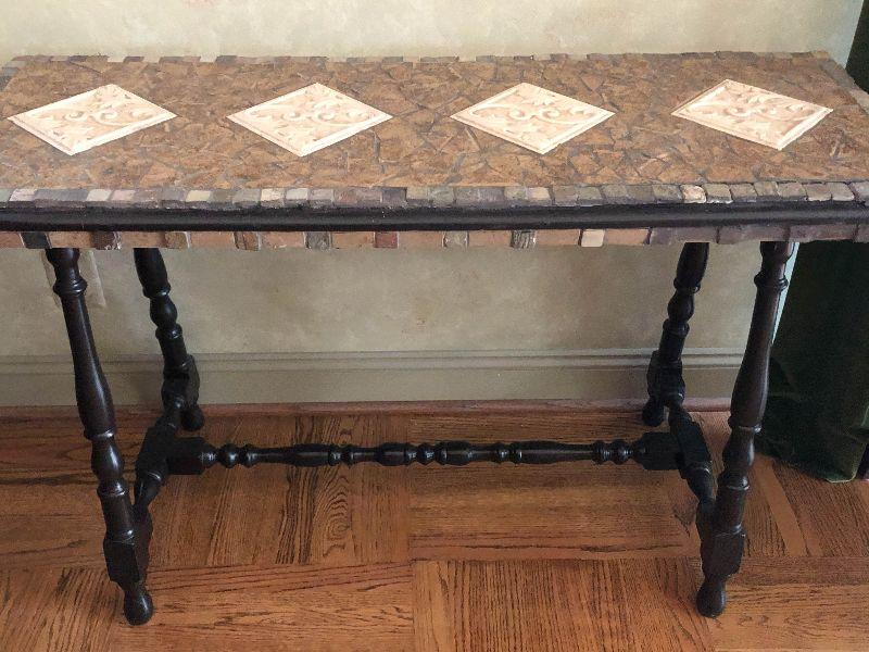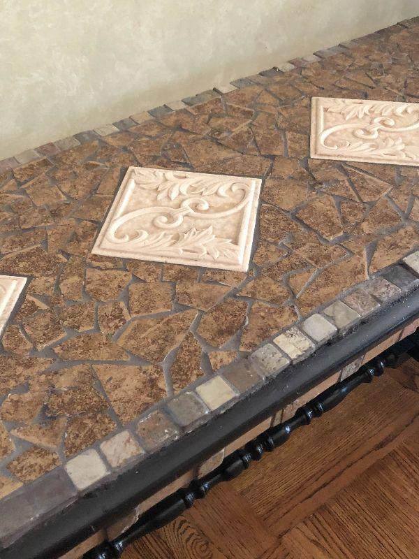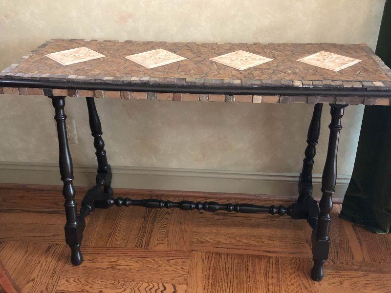 This piece was custom made from vintage items. Perfect for side table, sofa table, or entryway. This does need some minor repairs to the tile work, grout. Please see pics for sizes, and repairs needed.