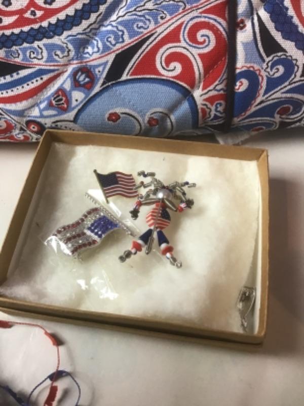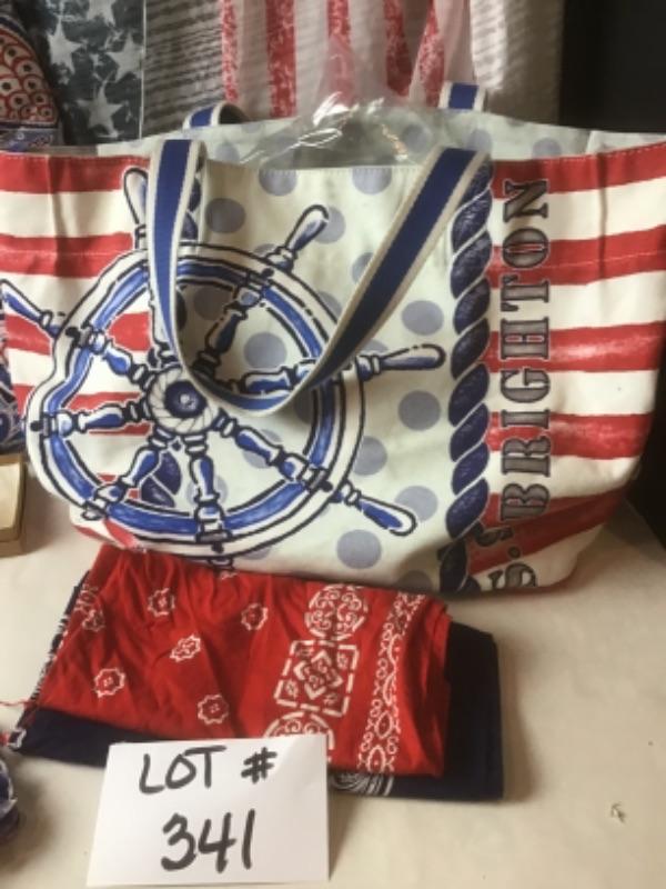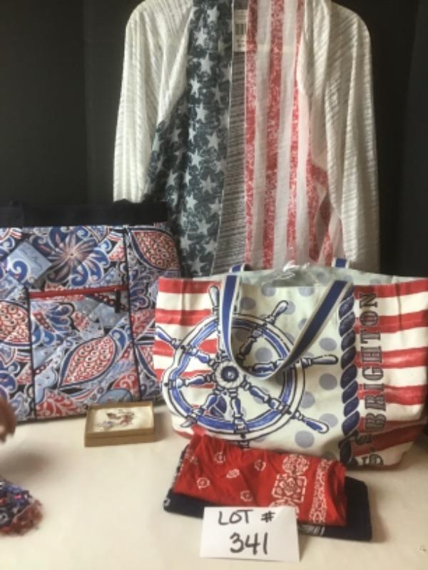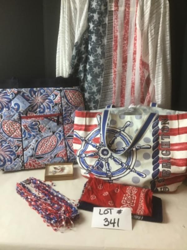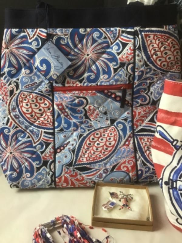New with tag Vera Bradley Port Tote, Brighton Canvas Bag with Patriotic Jewelry, two handkerchief , and Indigo Red white and blue Shawl