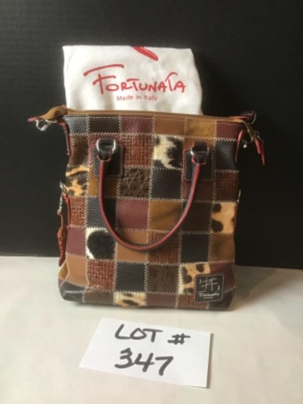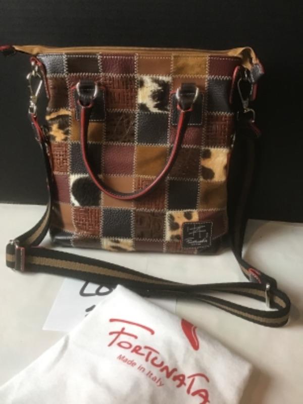 Gently used FORTUNATA Leather Handbag with strap has signs of light wear on inside. Measures 8.5” wide x 9.5” tall