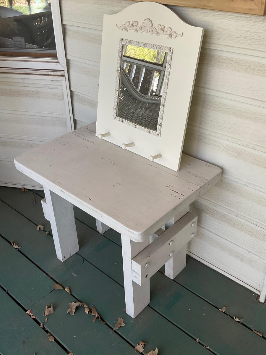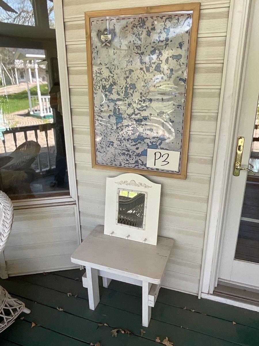 P3-Framed Poster (no glass or plexiglass), Mirror with Hooks, side table