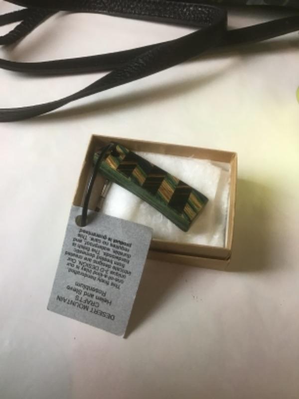 P402 NWT Aimee Kestenberg Handbag, Levenger Wallet,Desert Mountain Crafts Artisan Key Chain by Helen and Steve Rosenblum made of 3-D design inlay of durable hardwoods