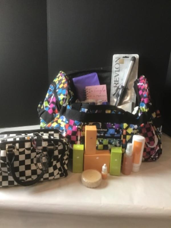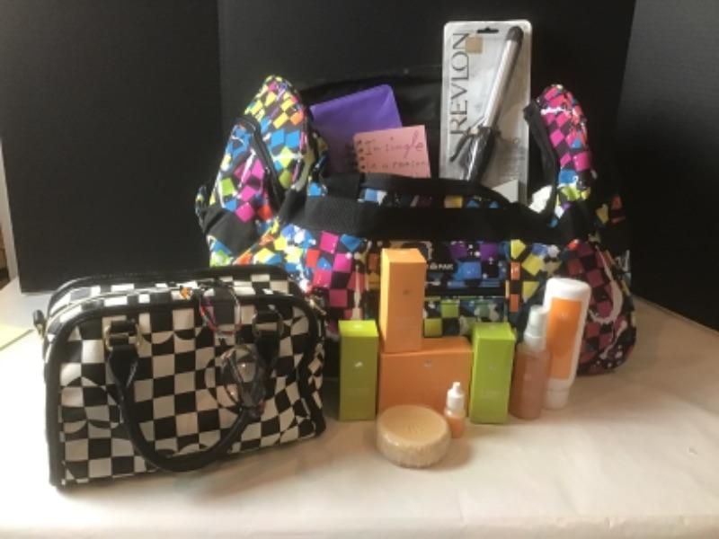 Gently Worn YAK PAK Rolling Duffel Bag with Betsy Johnson Handbag and Glasses. Collection of serious skin care products and Revlon 1” curling iron