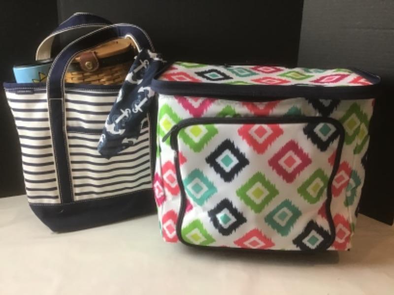 P439 Thirty One rolling cooler, Lands End Canvas Bag, Longaberger Basket and Tanning Supplies with travel beach mug