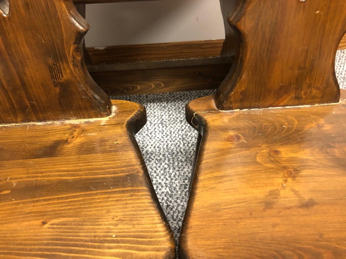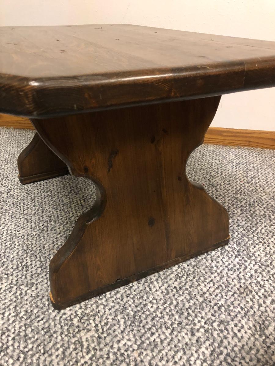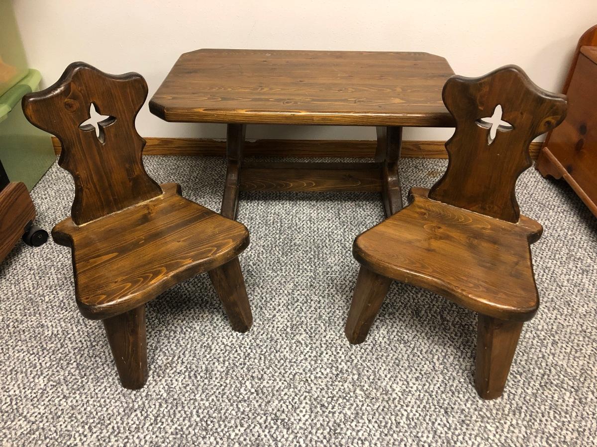 See pics, chairs have been/need repair on one for sure. Table 28”x16”x15” high