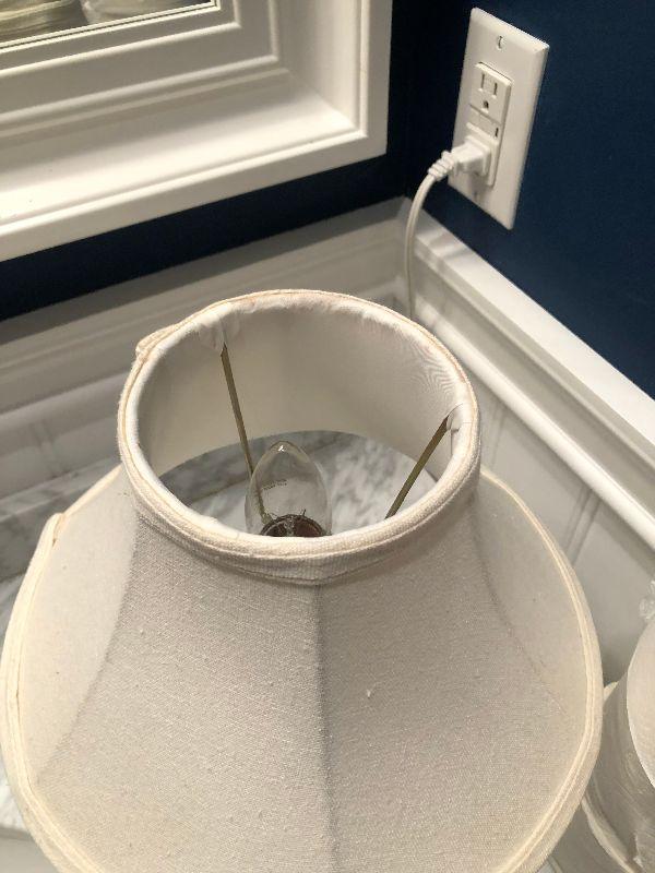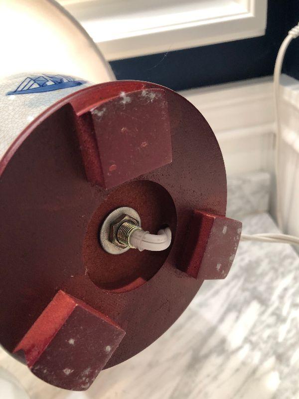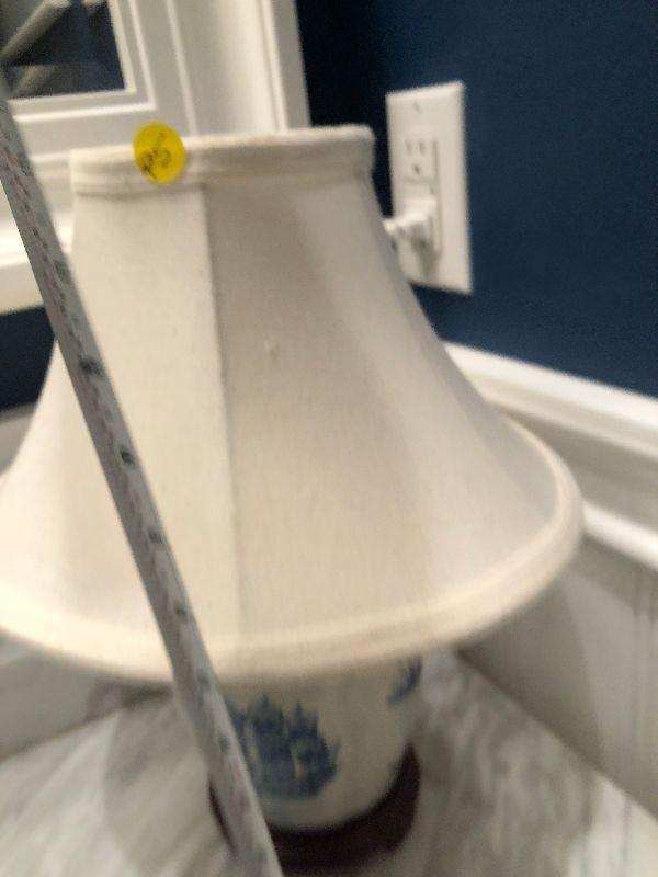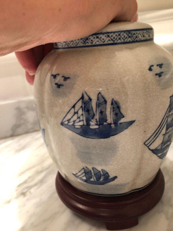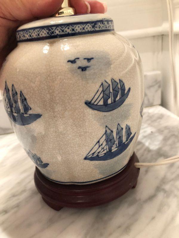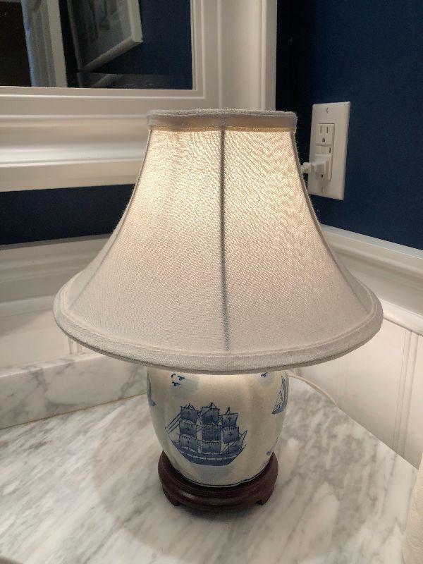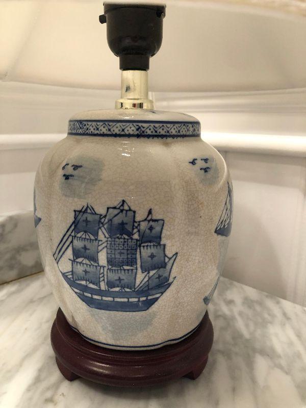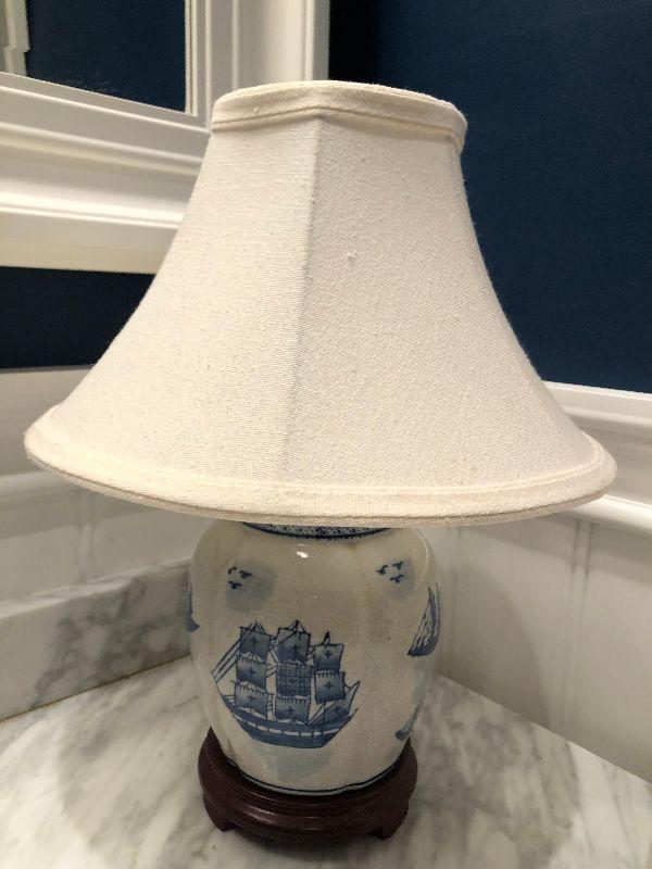 Lovely lamp, small in size, cream and blue with ship on front. Please see pictures for contents of the lot, condition of the lot, and measurements if needed. Thank you for looking and have fun bidding!