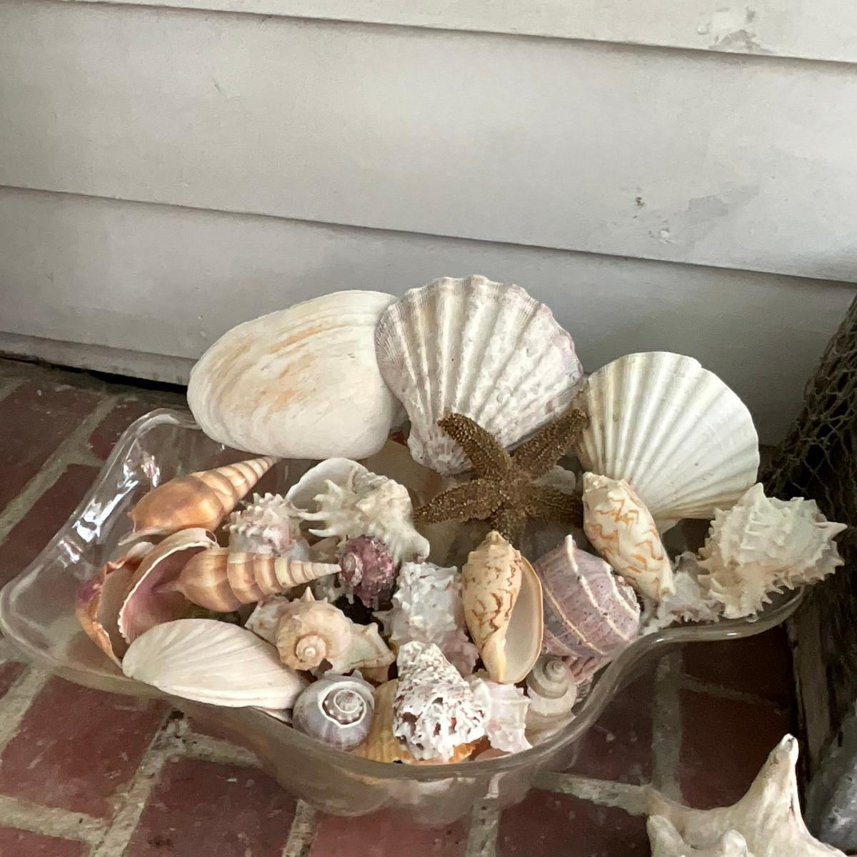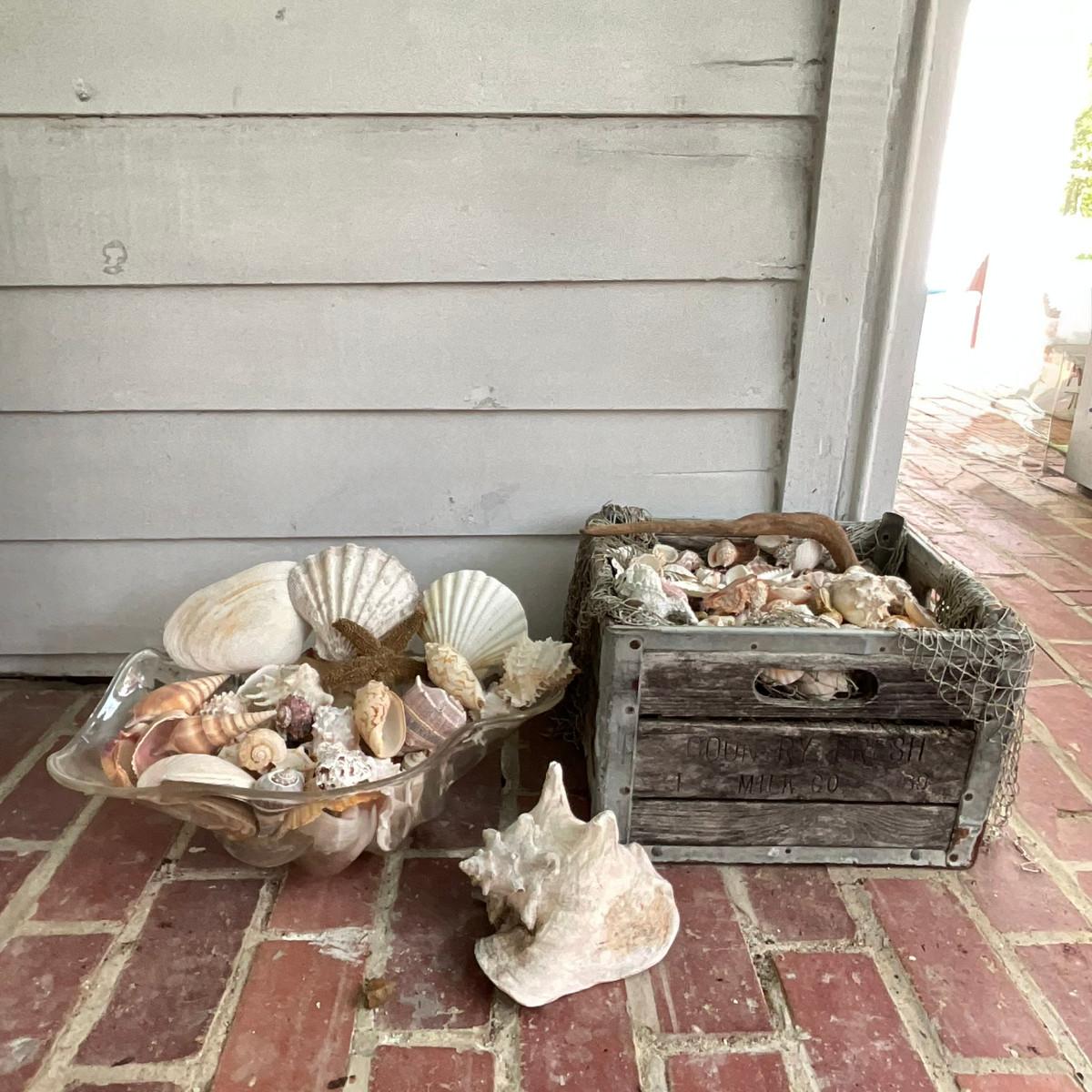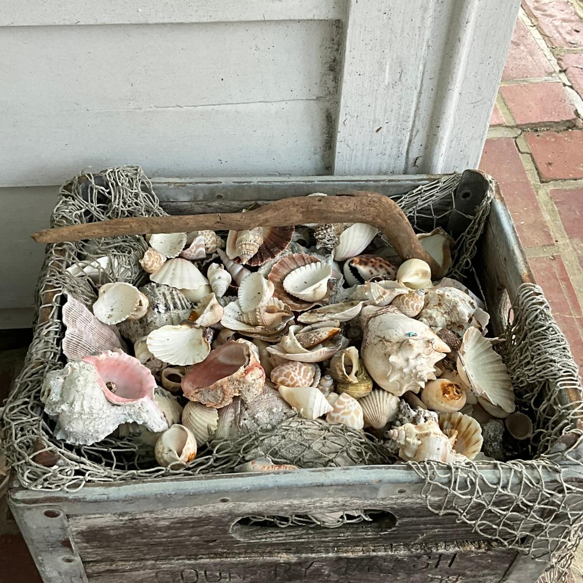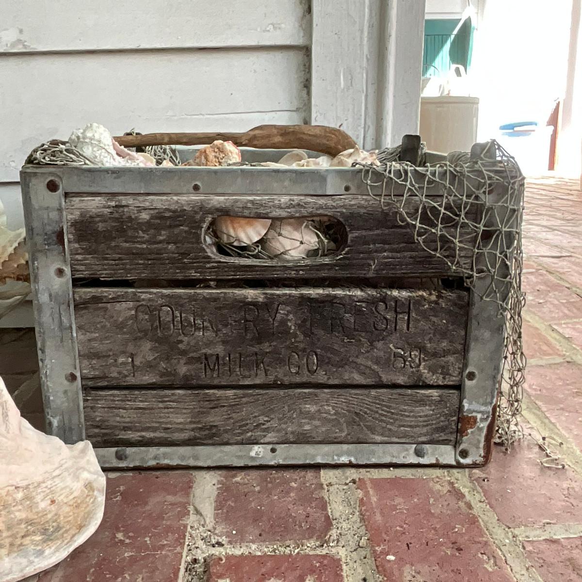P639 Assorted Shells In Plastic Clam Bowl and Vintage Milli Crate