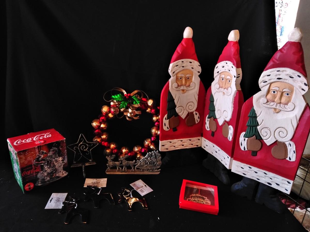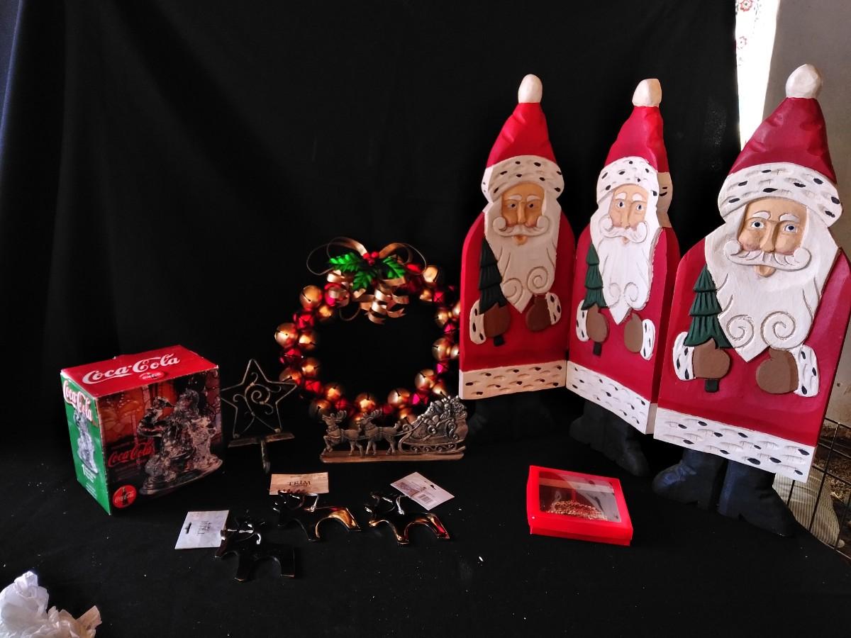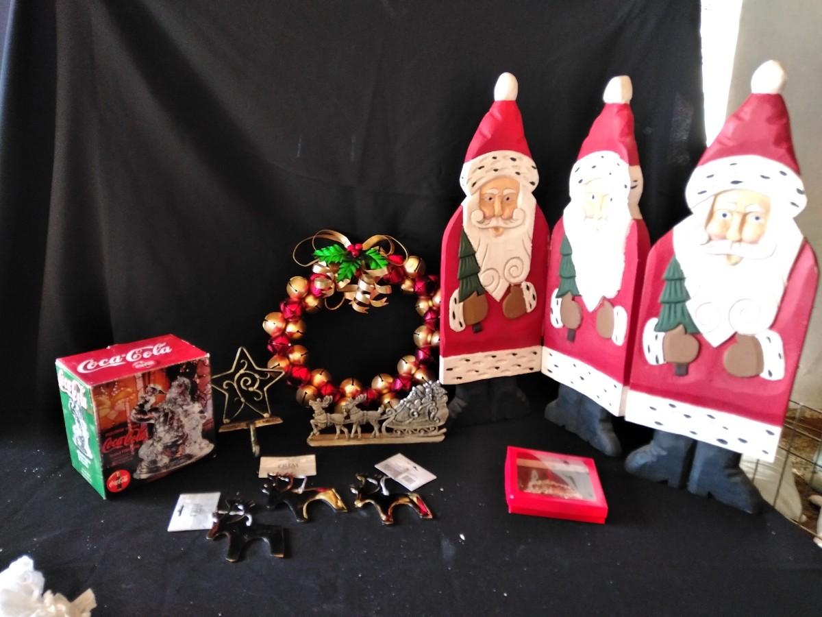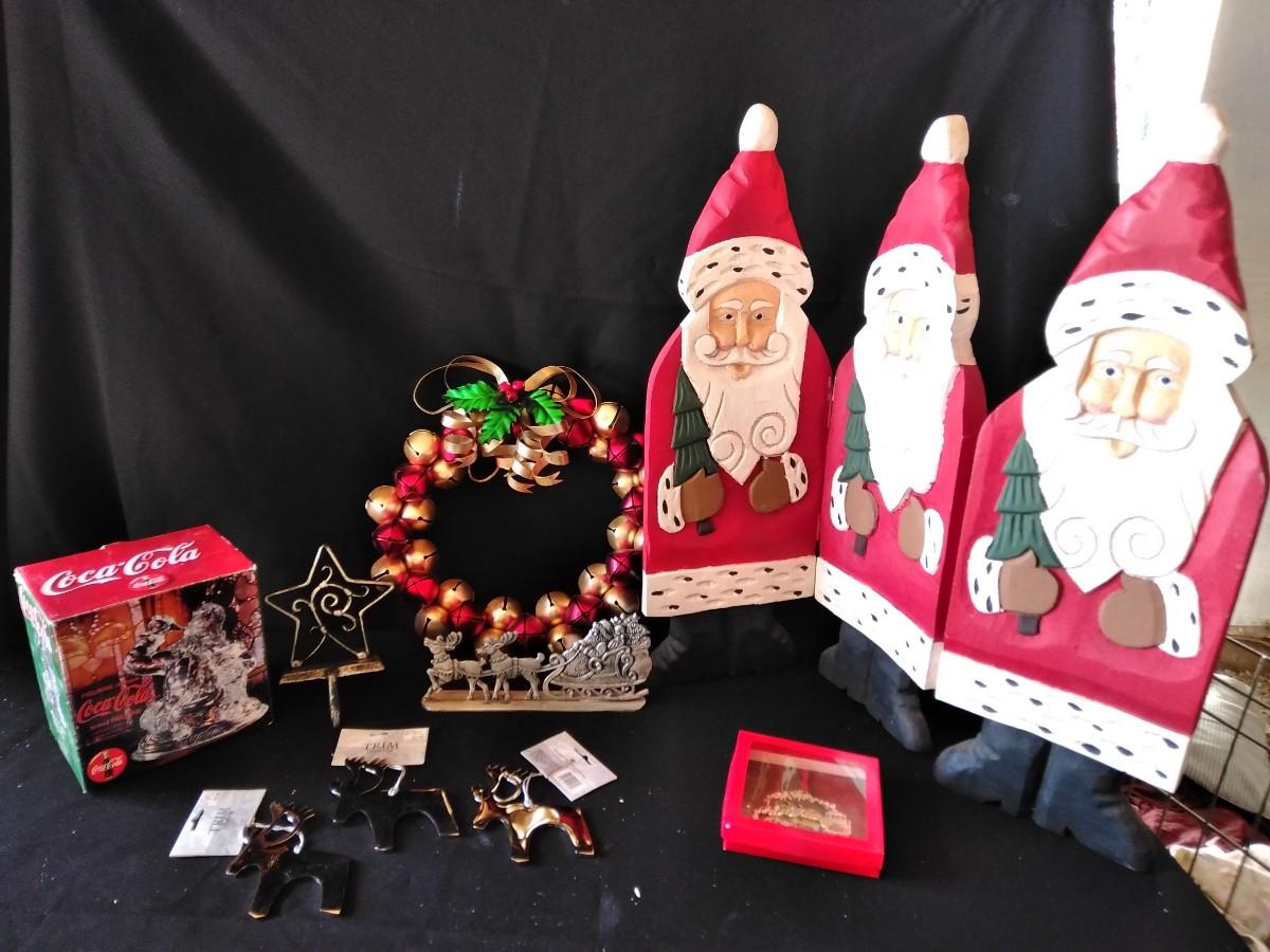 CHRISTMAS BELL WREATH, PEWTER LIKE SLEIGH WITH DEER, STAR STOCKING HOLDER, COCA COLA CLEAR SANTA, WOODEN FOLDING SANTA'S, METAL DEER ORNAMENTS, AND MORE