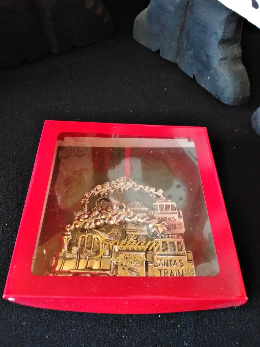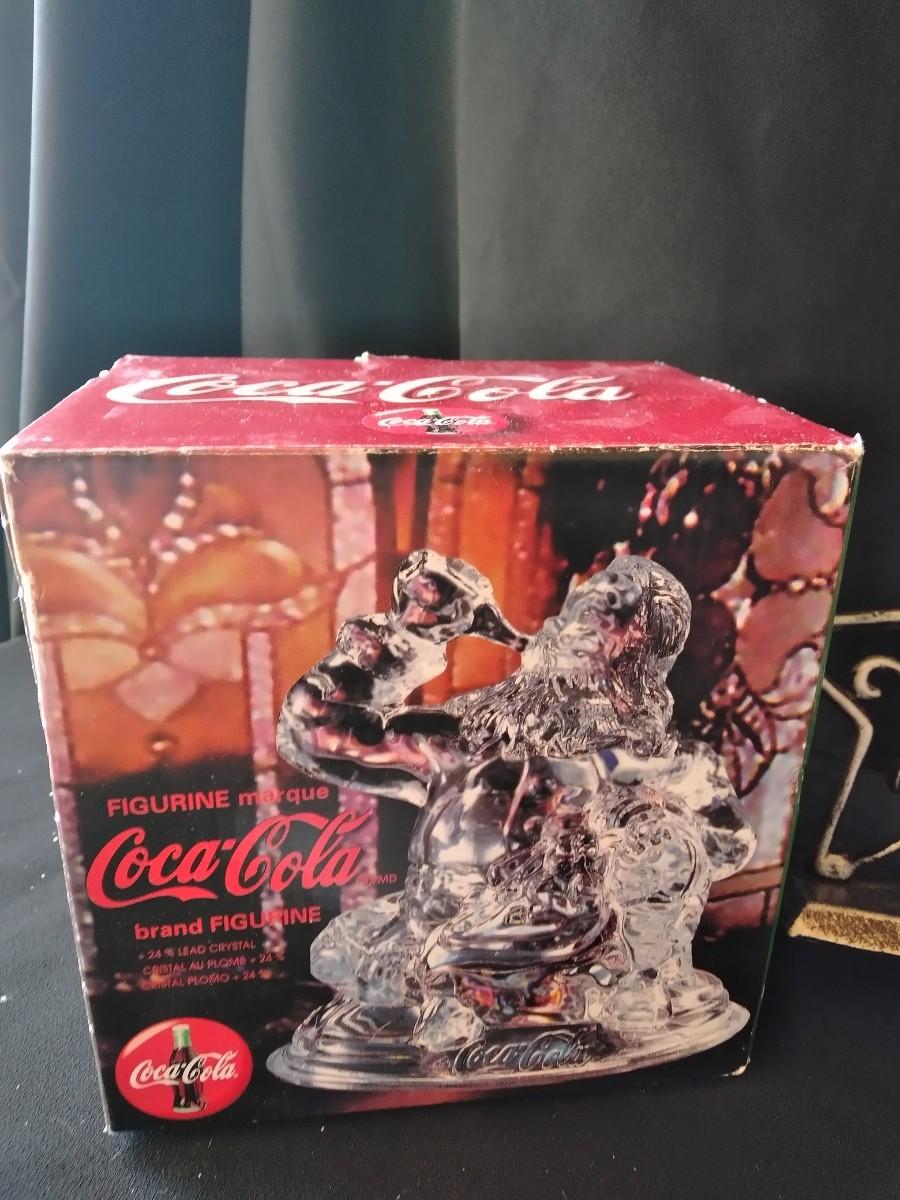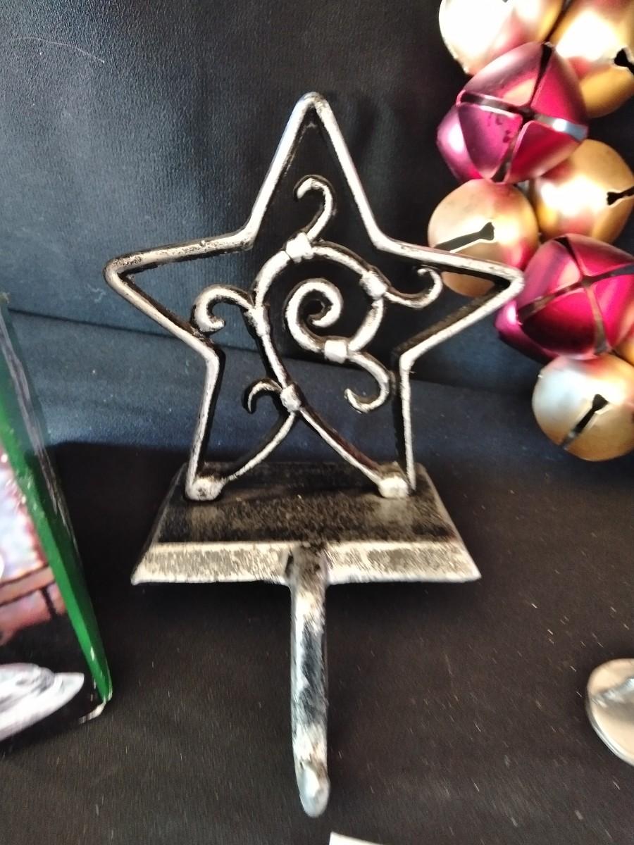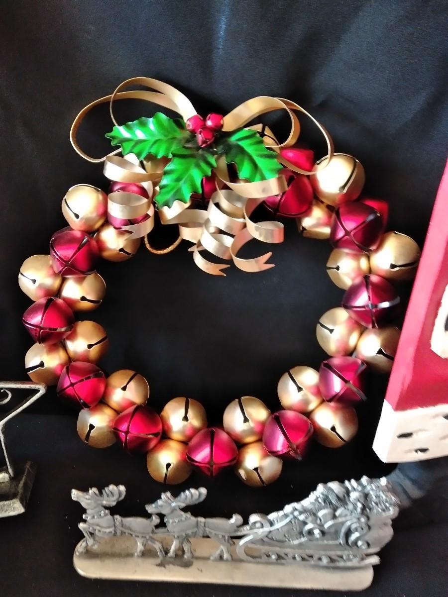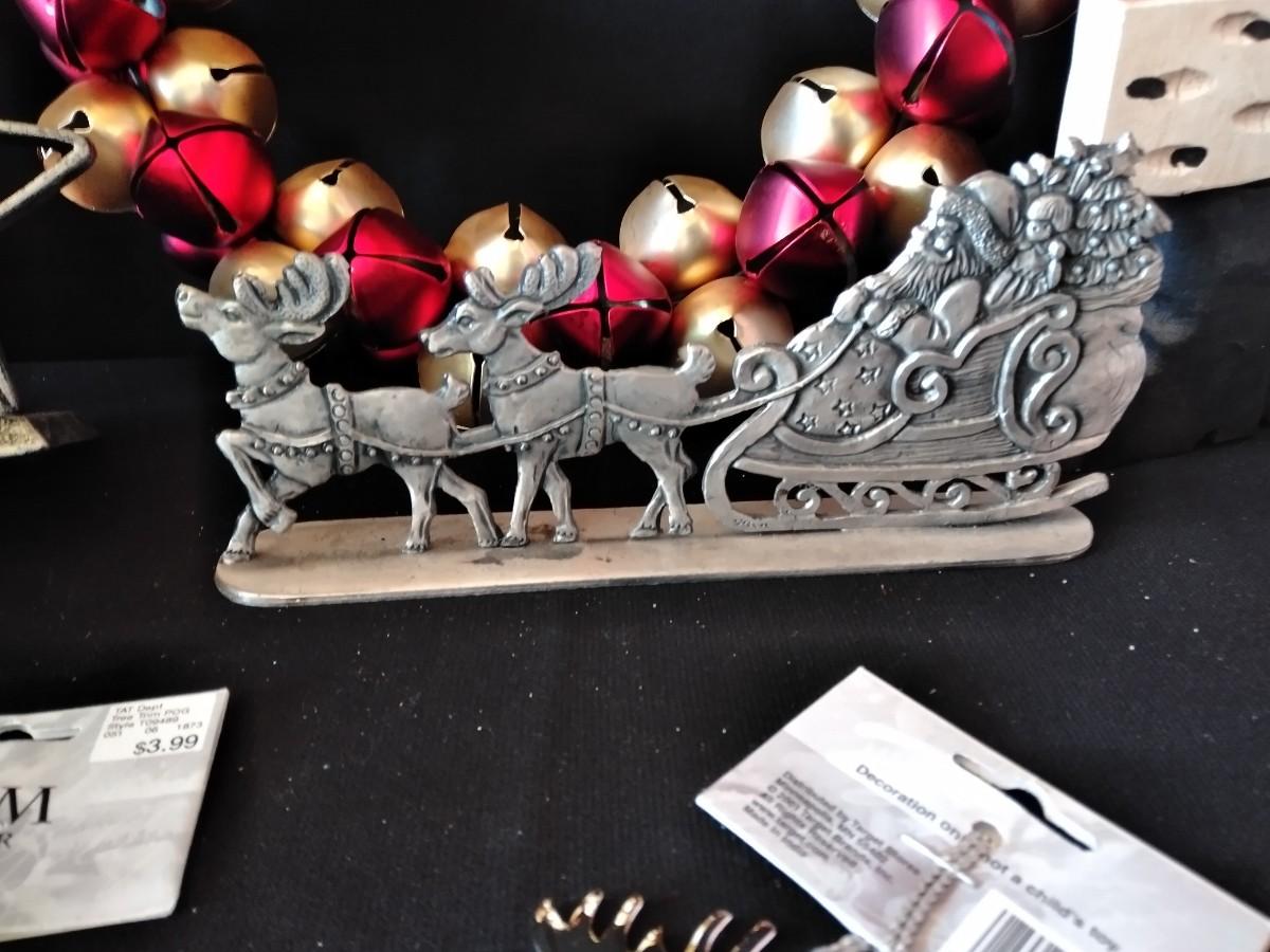 CHRISTMAS BELL WREATH, PEWTER LIKE SLEIGH WITH DEER, STAR STOCKING HOLDER, COCA COLA CLEAR SANTA, WOODEN FOLDING SANTA'S, METAL DEER ORNAMENTS, AND MORE