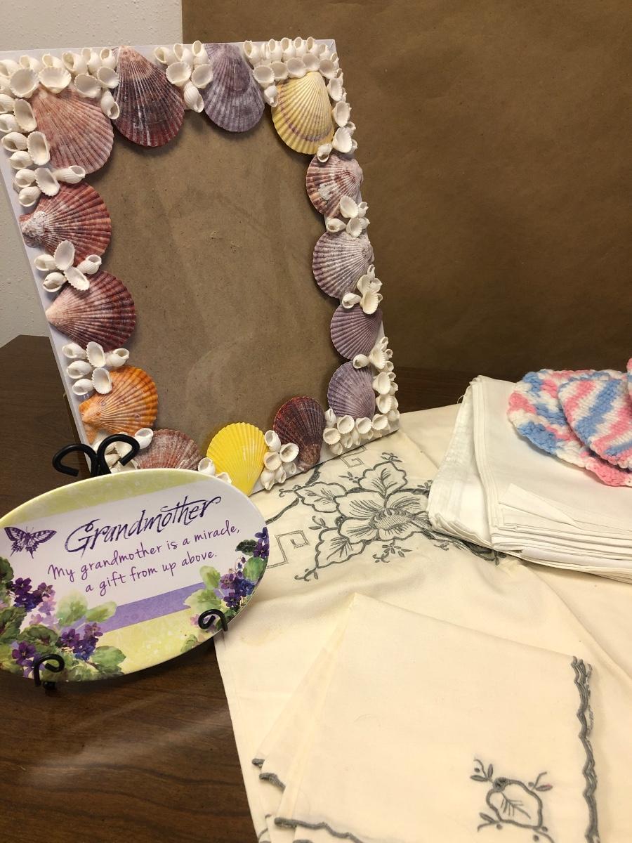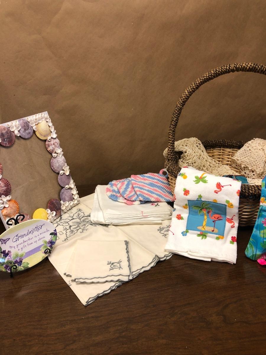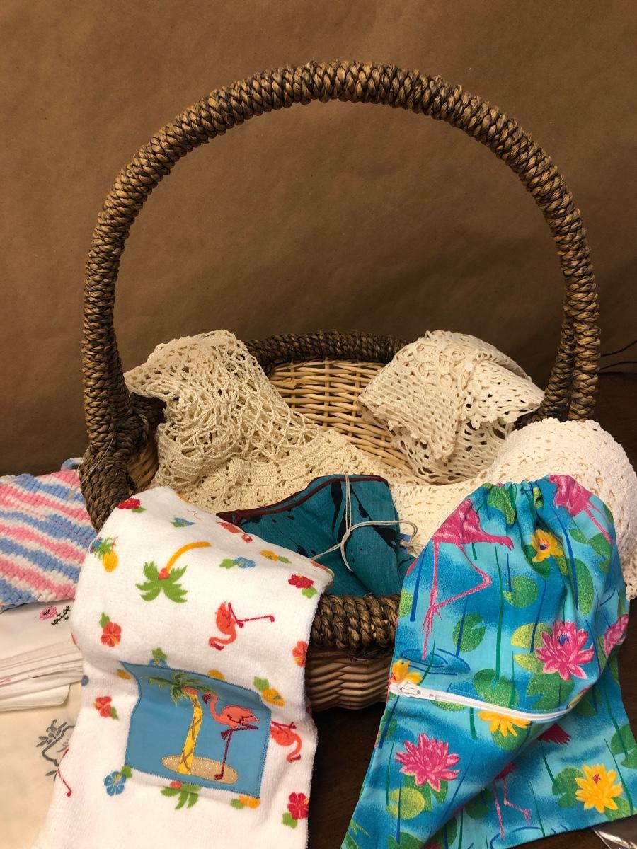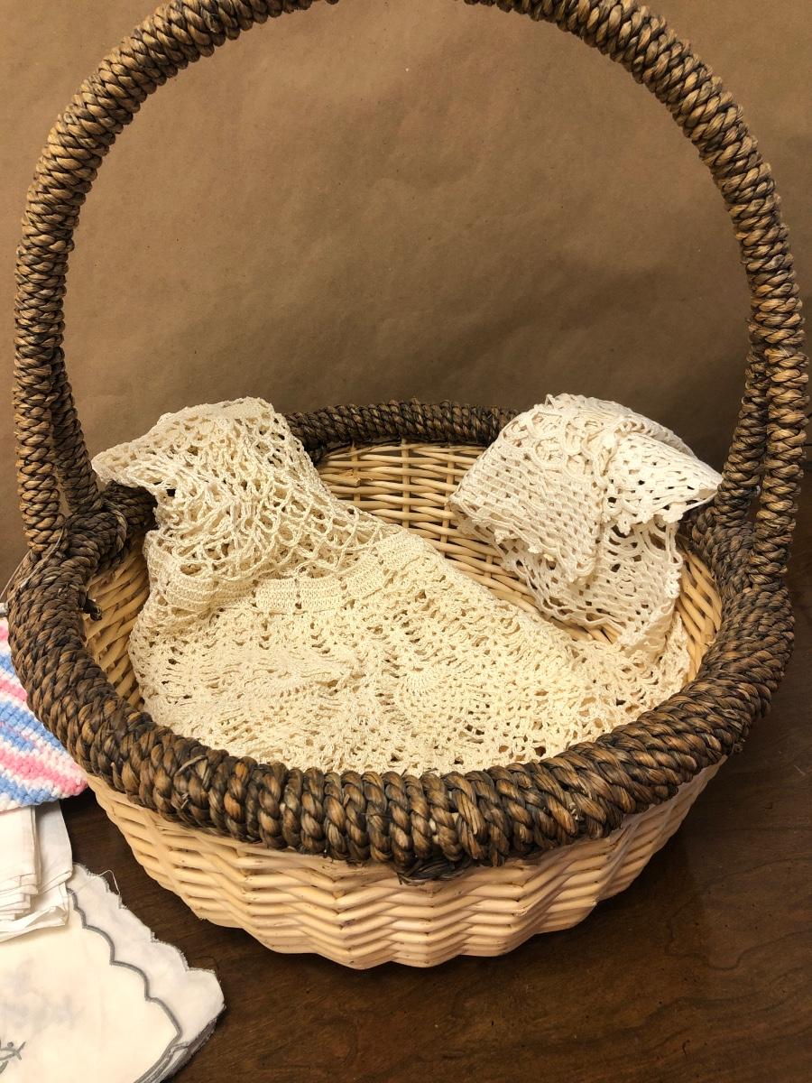 P94. Basket, linens, doilies & misc