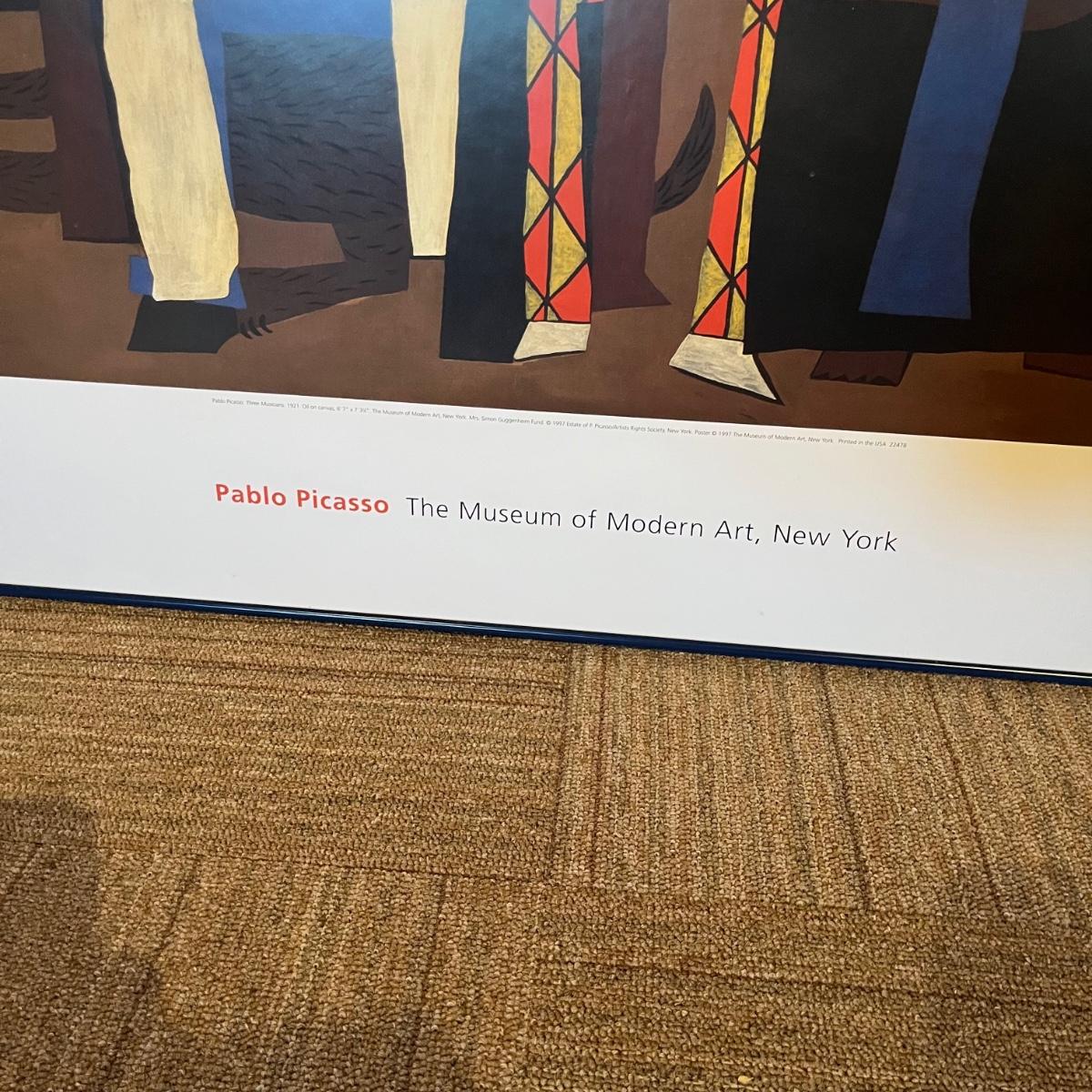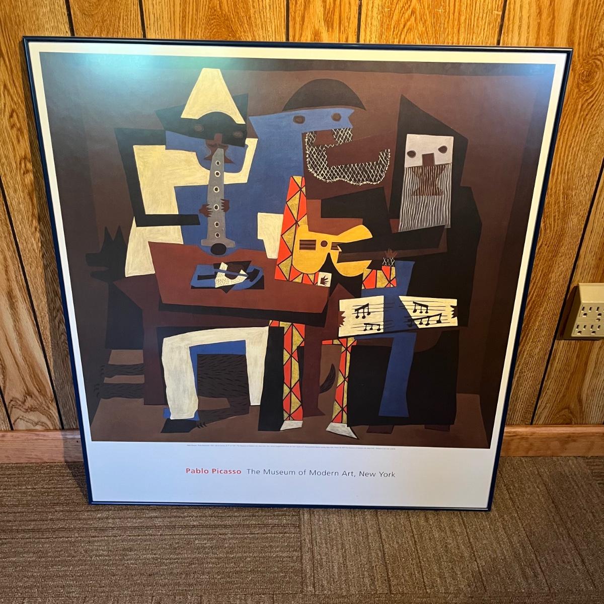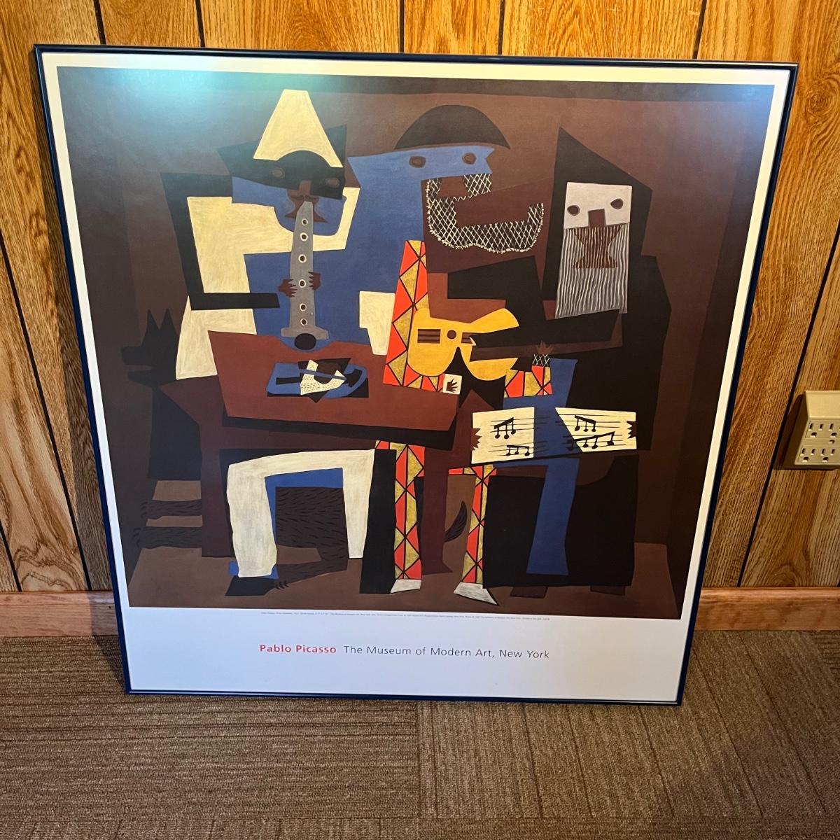 Lot includes a framed print of Pablo Picassos Three Musicians from the Museum of Modern Art. Frame measures 30” x 32”.