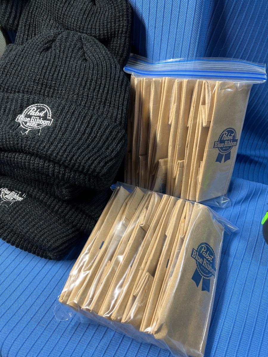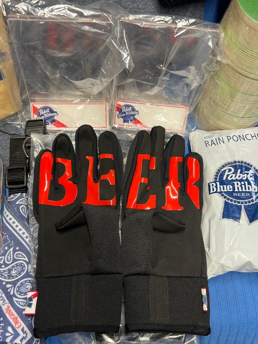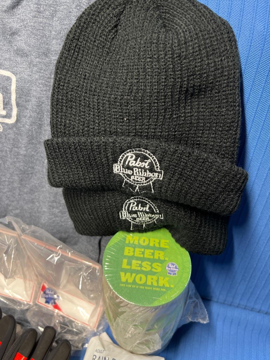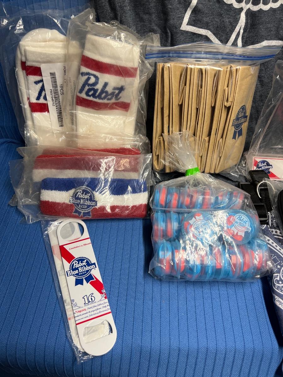 Combination of authentic PBR promotional items consisting of the following: socks, headbands, bottle openers, paper bag coozies, ear plugs with cases, dog collar bandanas, BEER gloves, table toppers, ponchos, coasters, a T-shirt, chapstick, and stocking caps.