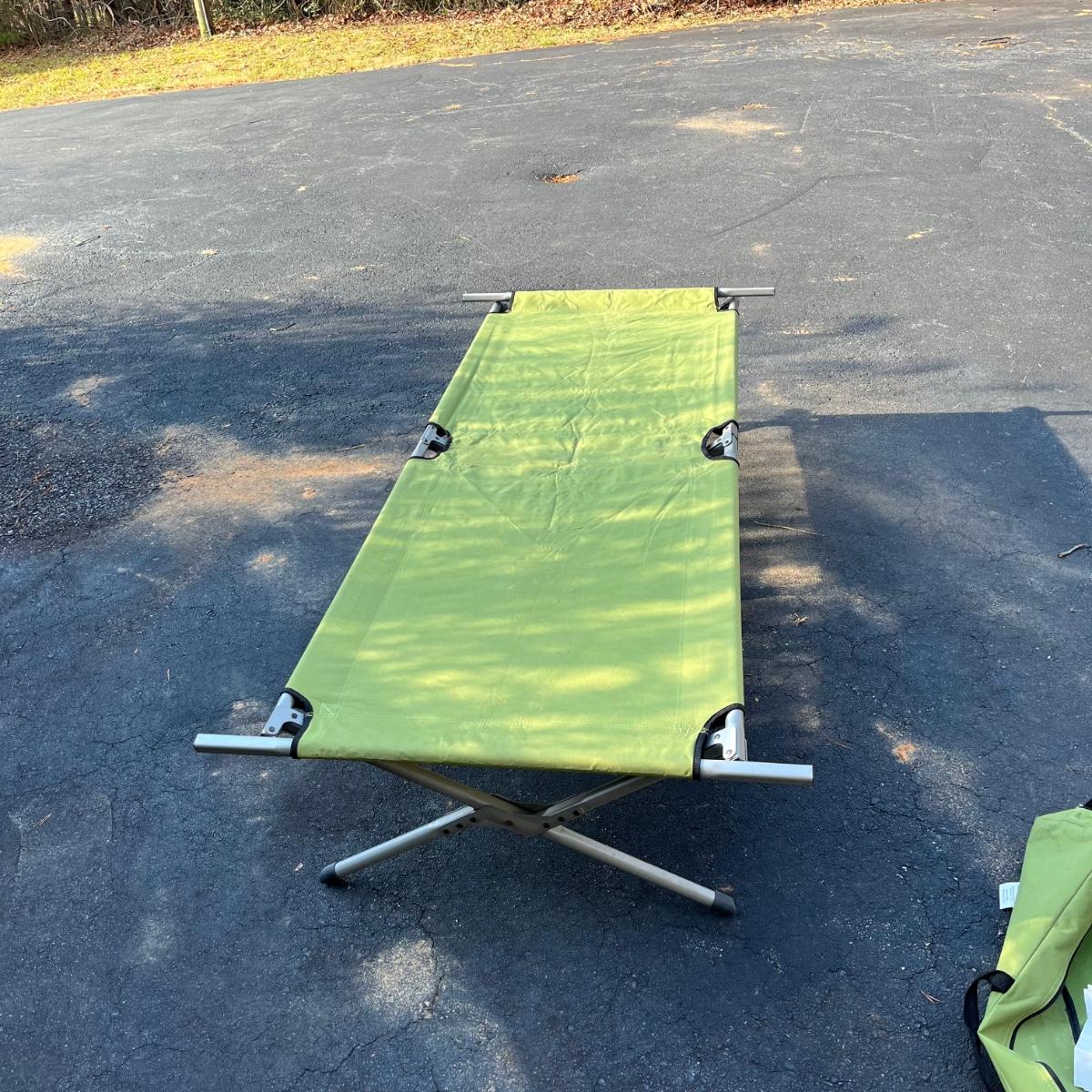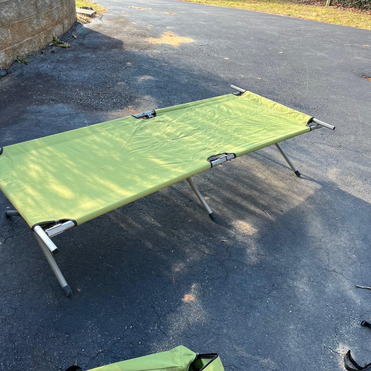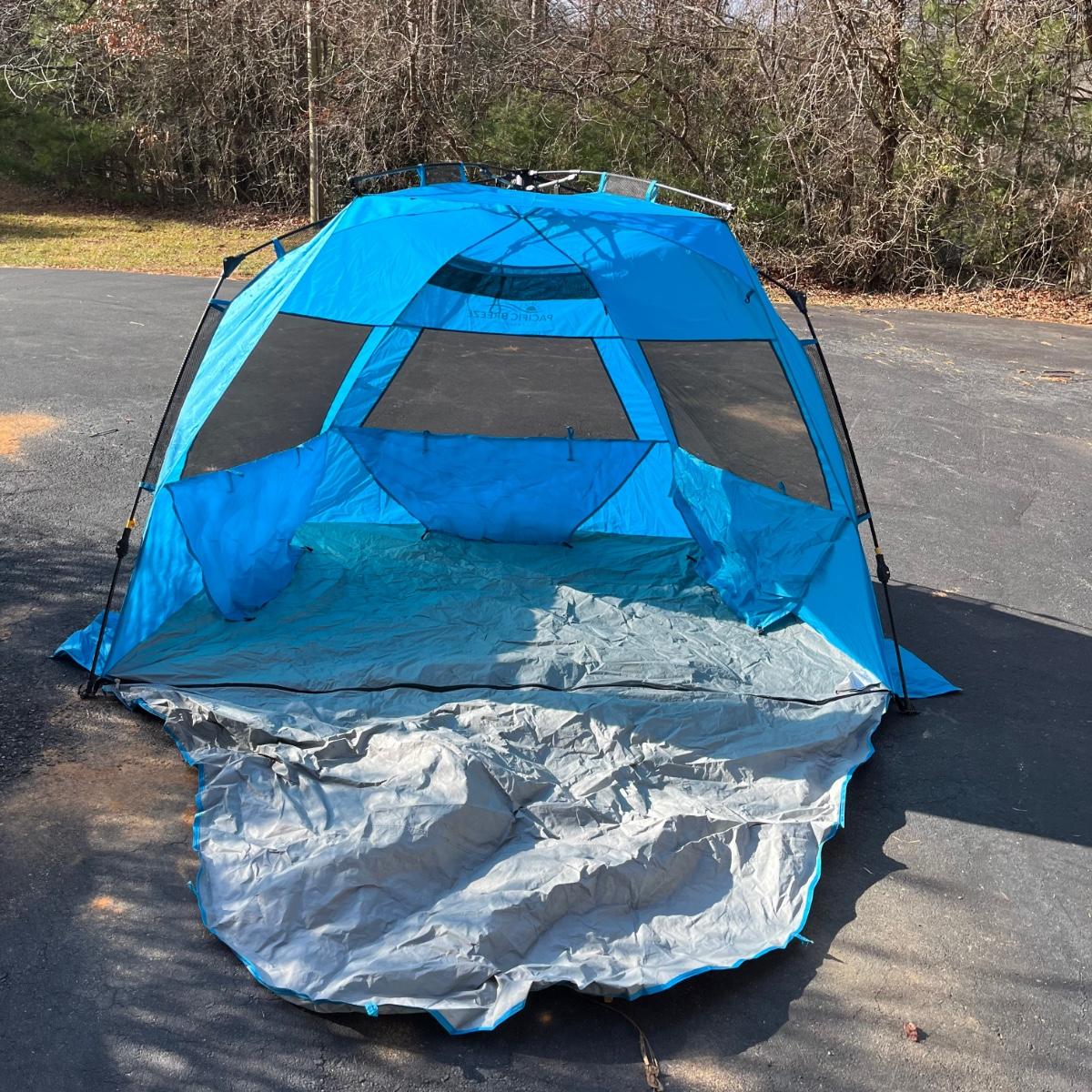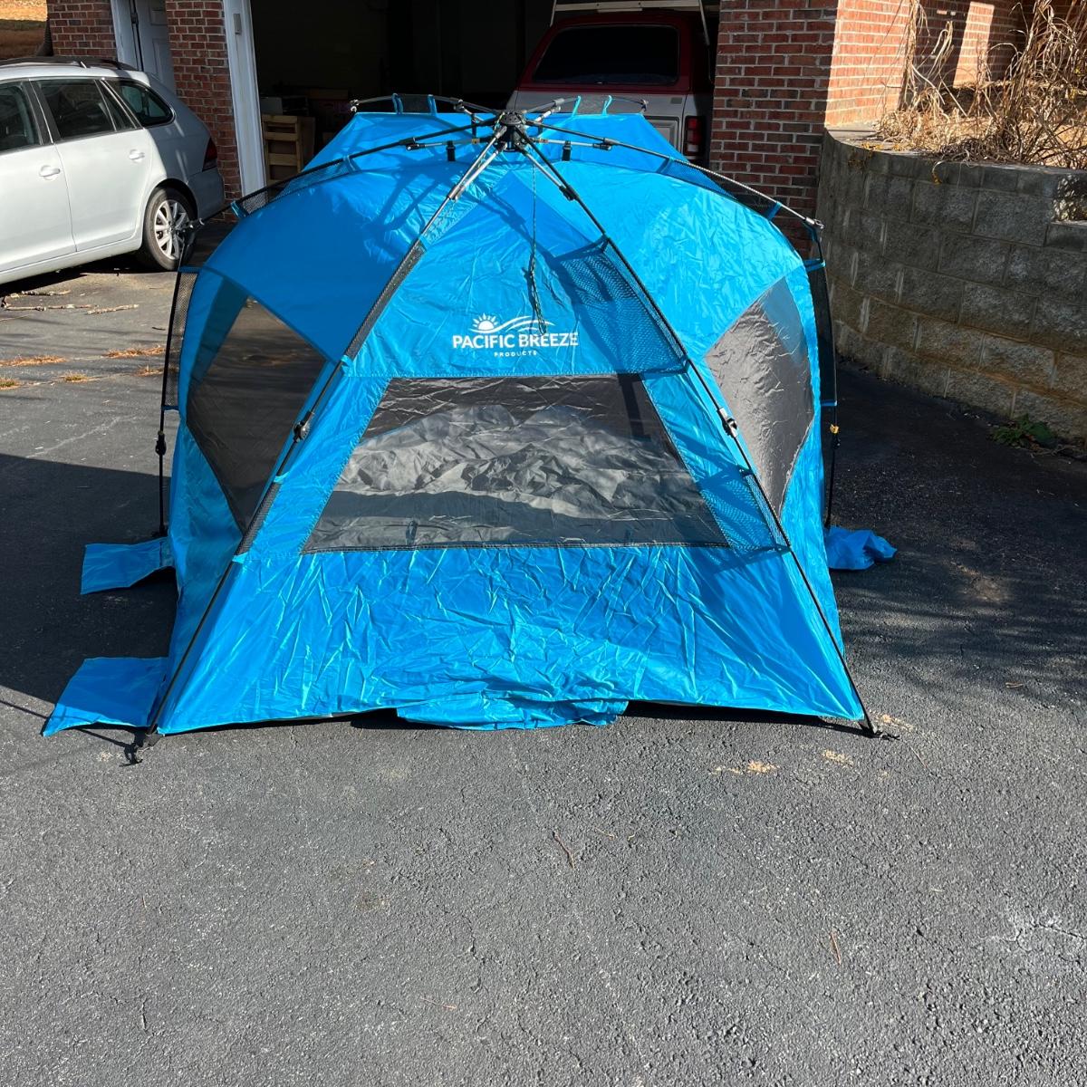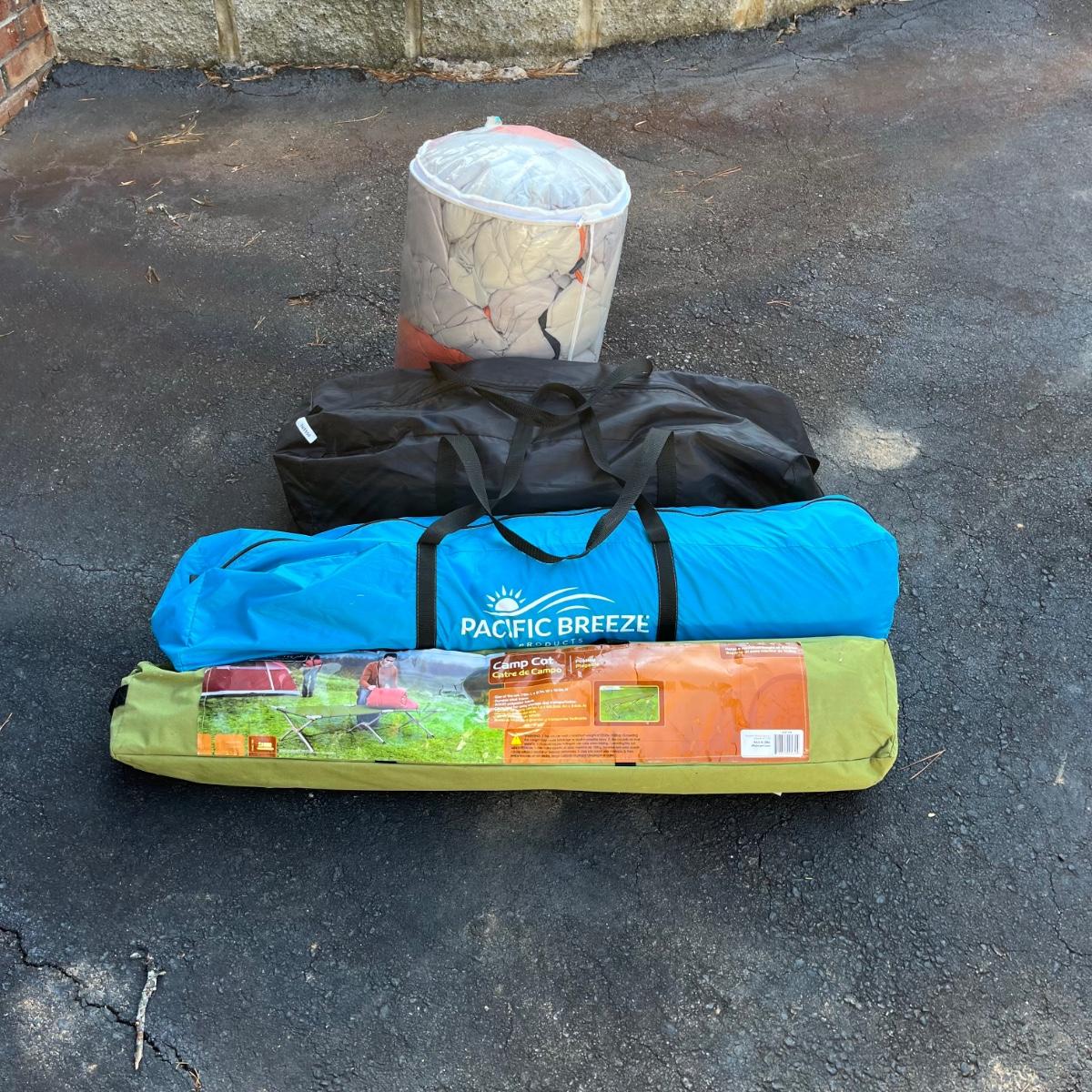 Lot includes a Pacific Breeze beach tent, Ozark Trail folding cot, Quest sleeping bag and a vehicle tent. Beach tent measures 95” x 50” x 55”.