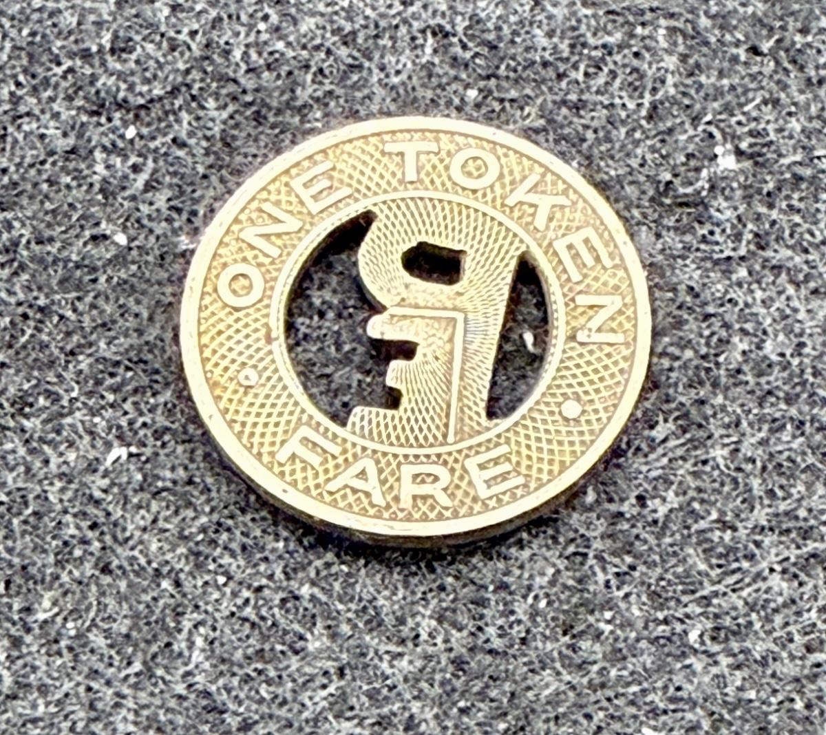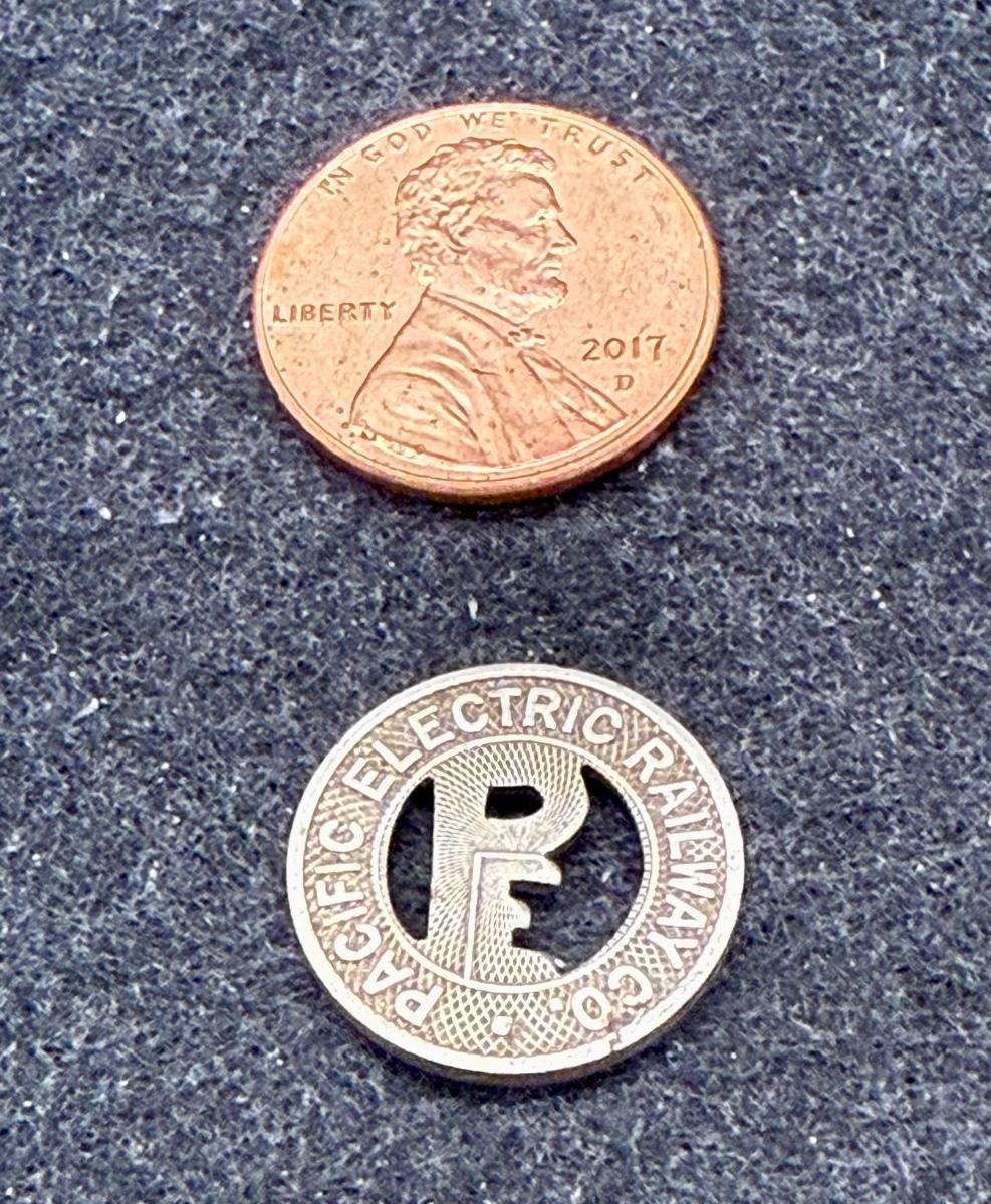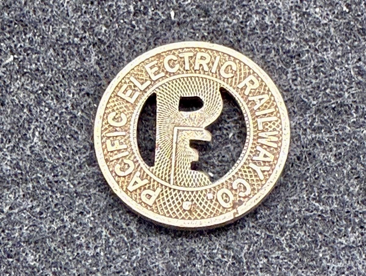 Slightly larger than a US penny. Rare, in very good condition. The Pacific Electric Railway Company, nicknamed the Red Cars, was a privately owned mass transit system in Southern California consisting of electrically powered streetcars, interurban cars, and buses and was the largest electric railway system in the world in the 1920s. Organized around the city centers of Los Angeles and San Bernardino, it connected cities in Los Angeles County, Orange County, San Bernardino County and Riverside County. Service ran from 1901 to 1961. This token is likely from the late 1940's or 1950's.