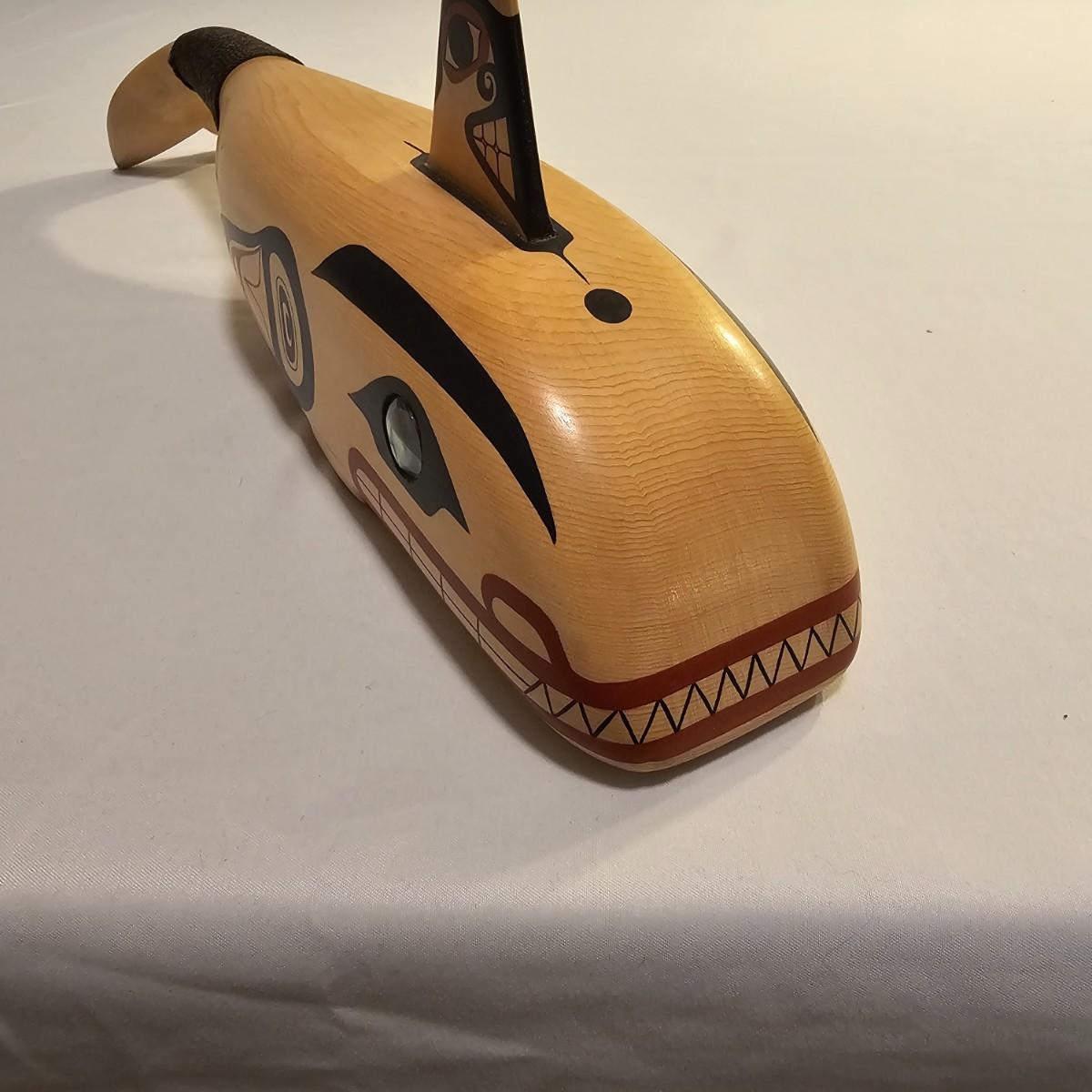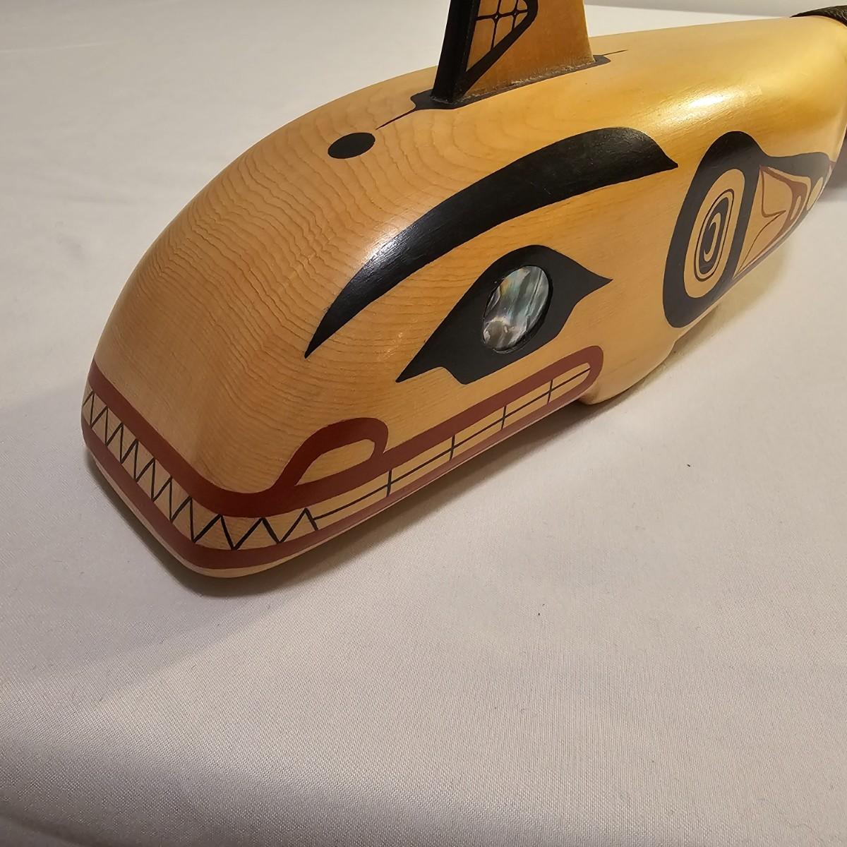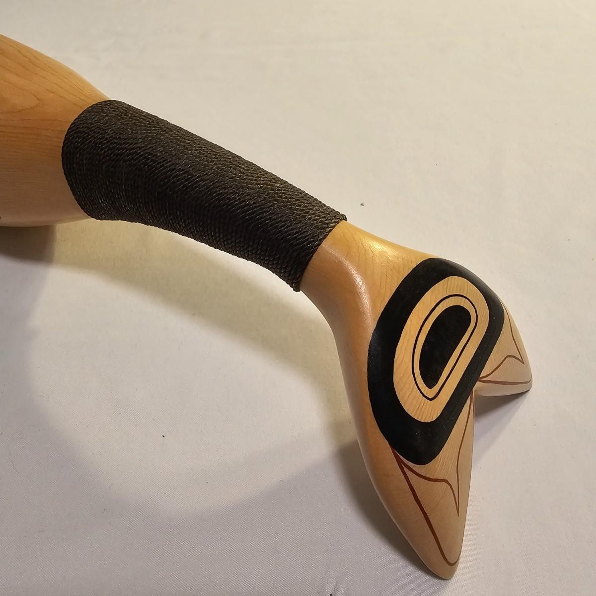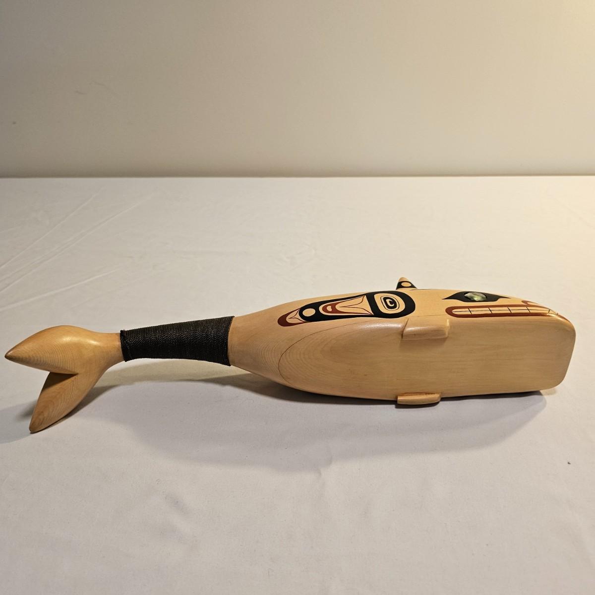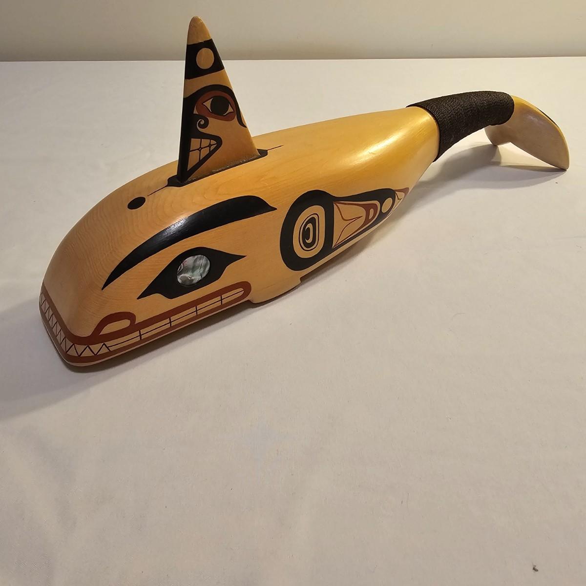 Stylish interpretation of an orca whale in rattle form in a Pacific Northwest style. Wooden orca has a cord wrapped section of the tail for use as a handle. Mother of pearl inset eyes. Rattle measures 16" x 3" x 6"H. See photos for details. Shipping available.