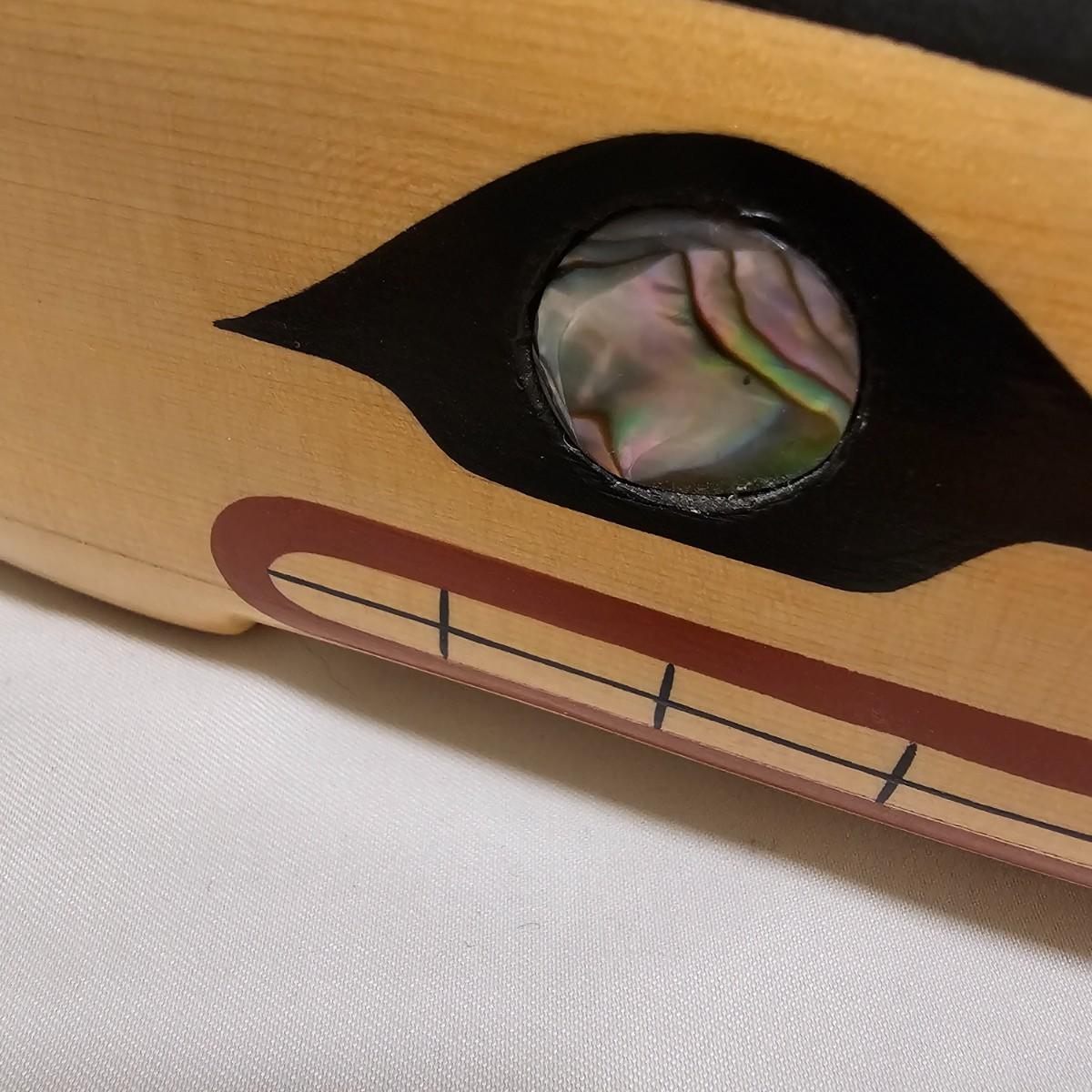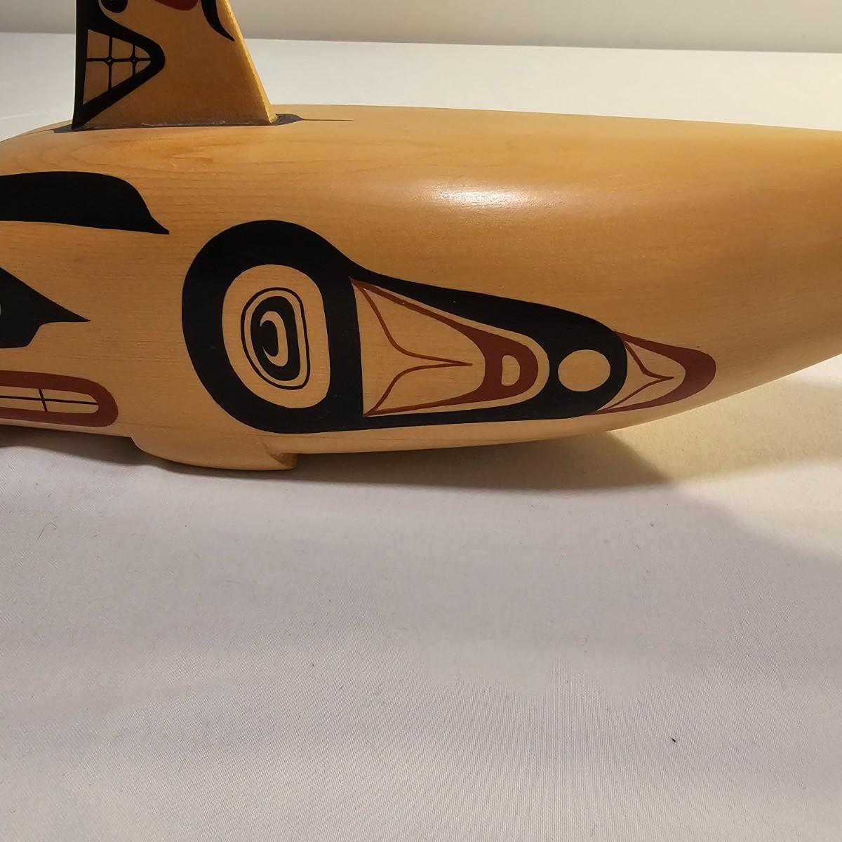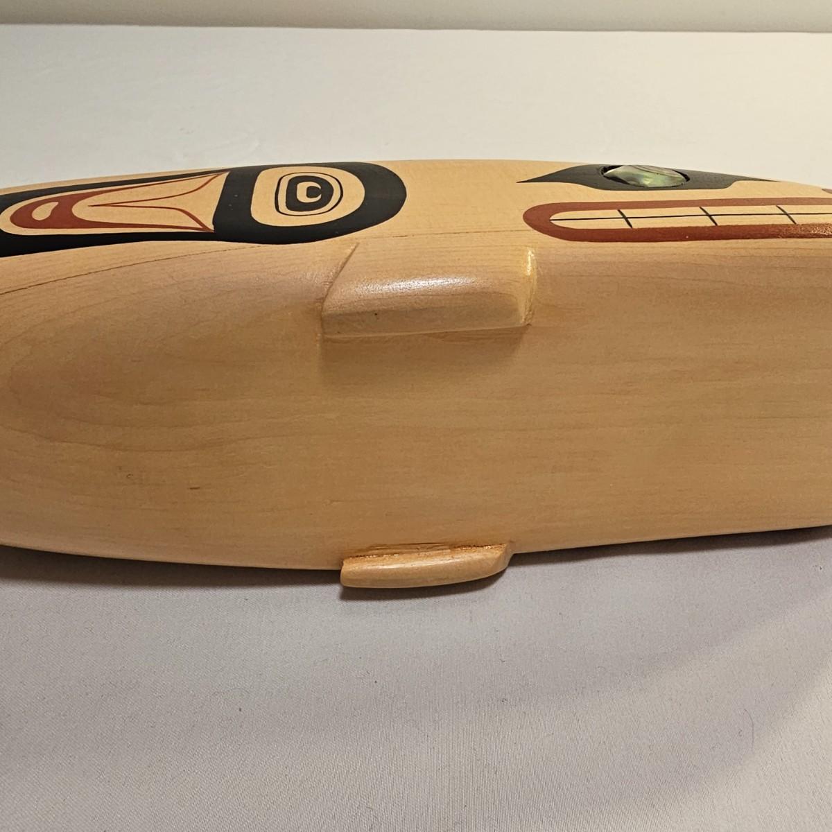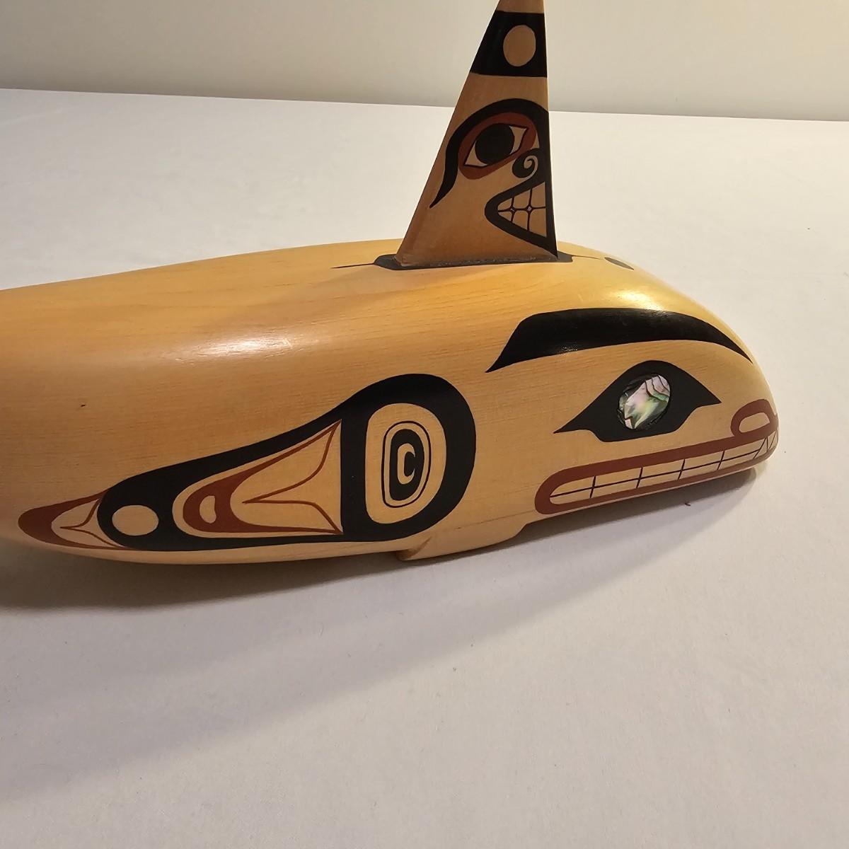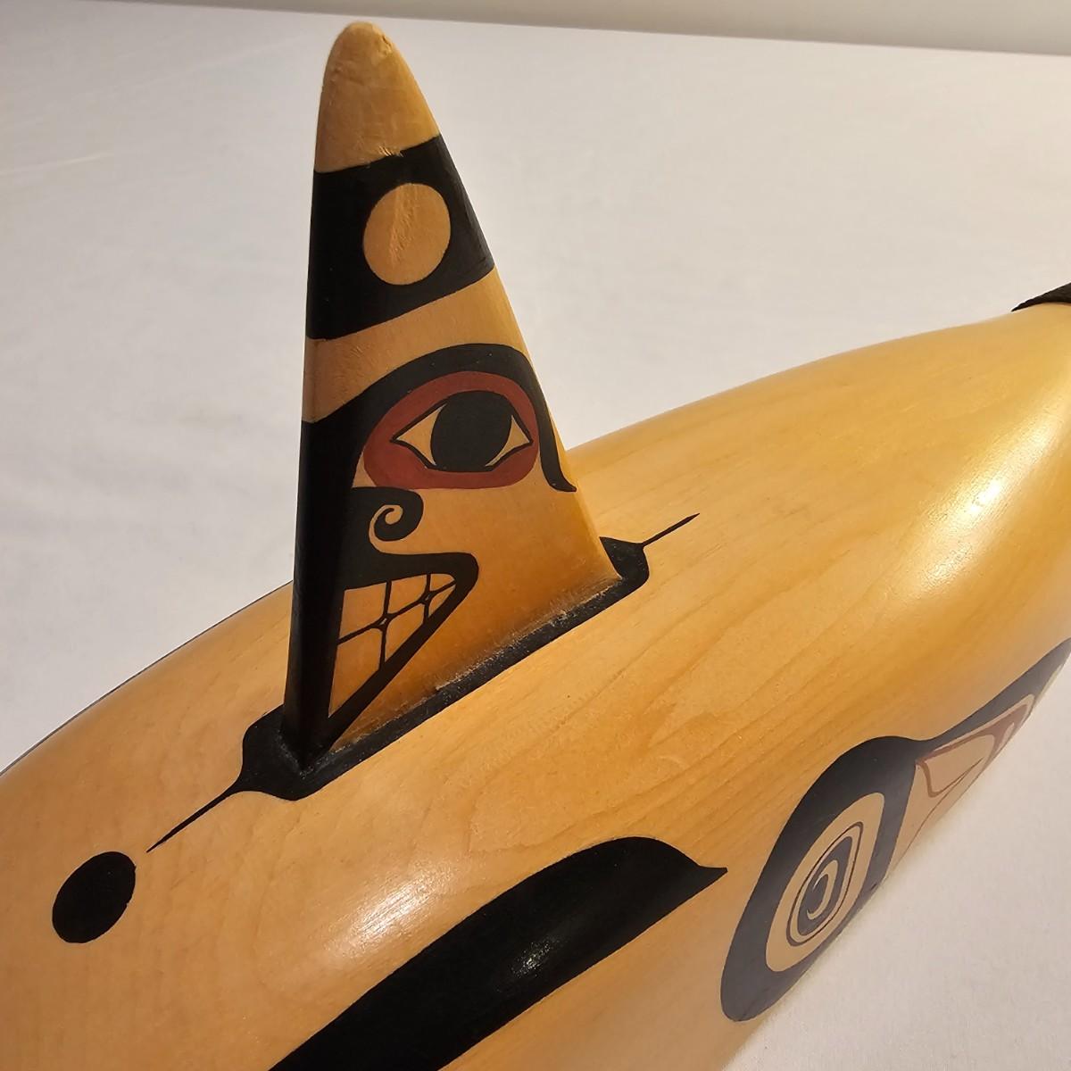 Stylish interpretation of an orca whale in rattle form in a Pacific Northwest style. Wooden orca has a cord wrapped section of the tail for use as a handle. Mother of pearl inset eyes. Rattle measures 16" x 3" x 6"H. See photos for details. Shipping available.