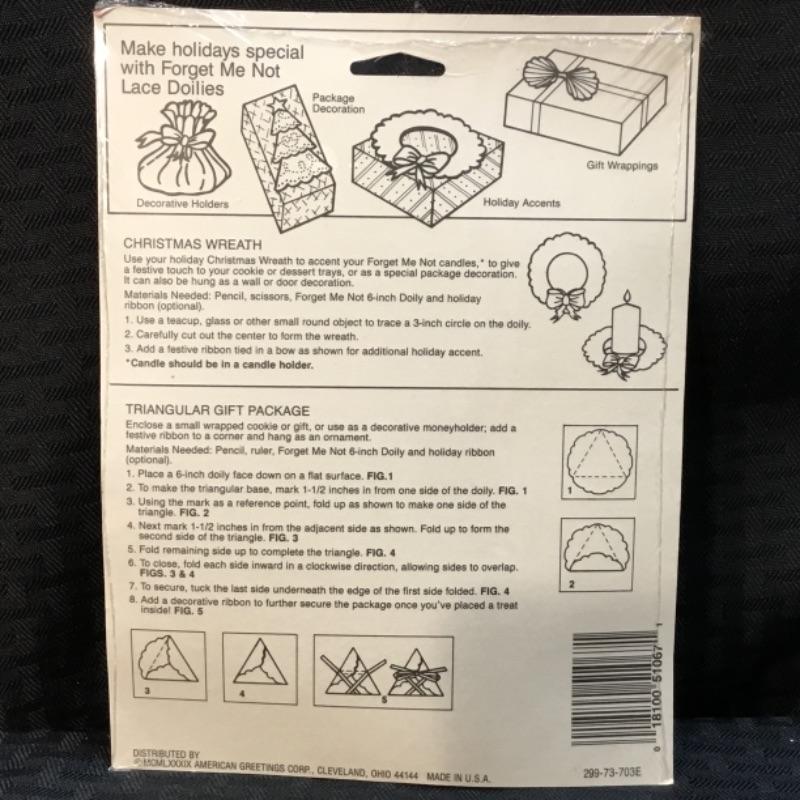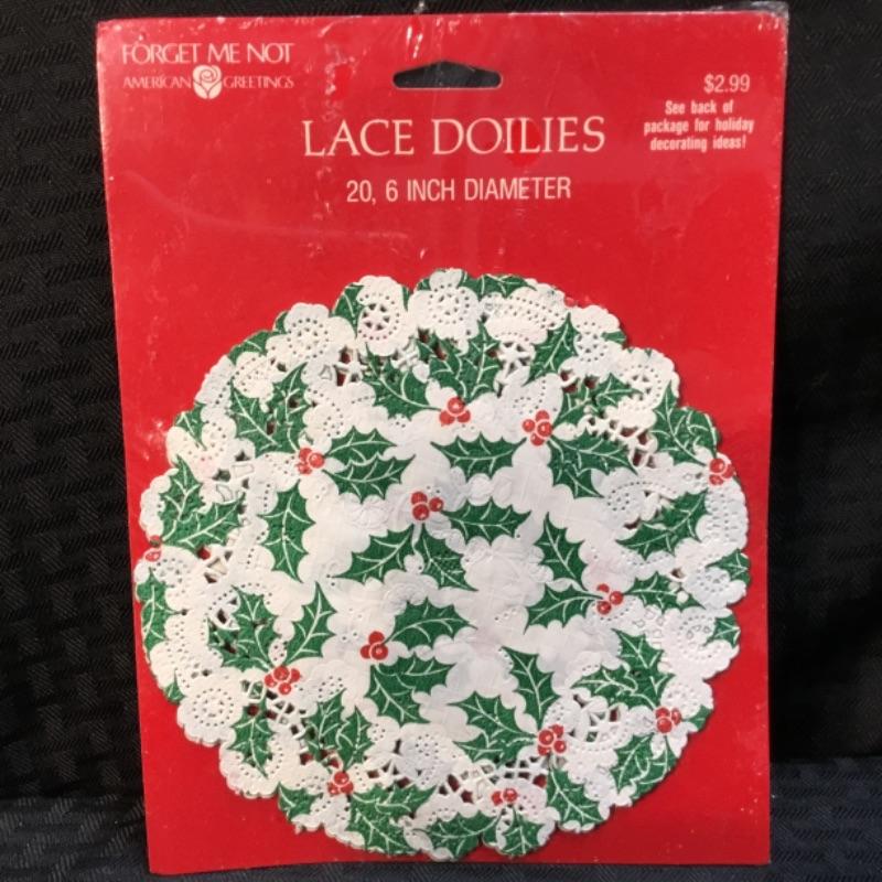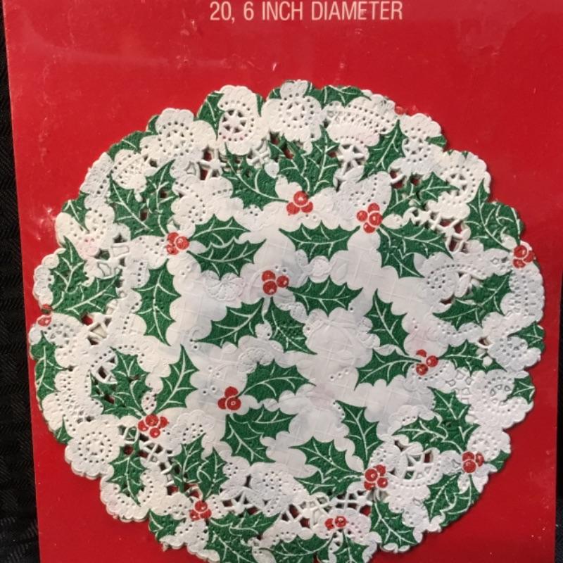 For auction is a package of 20 lace holiday doilies by American Greetings. They measure 6“ in diameter. See pictures.
