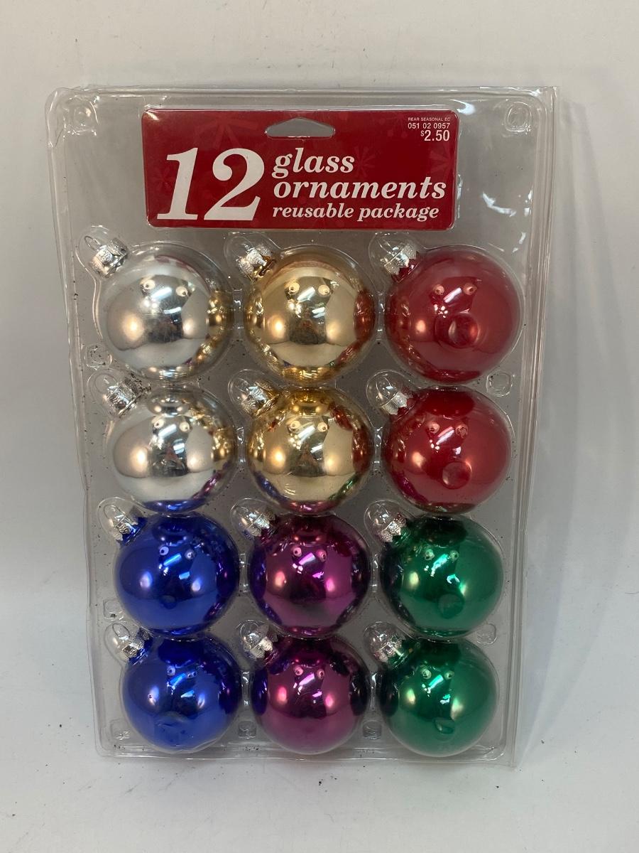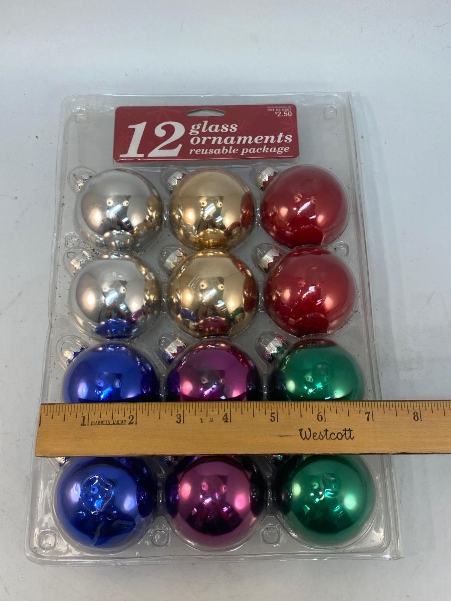 Package of 12 Glass Ornament Tree Balls Various Colors. 2" size.